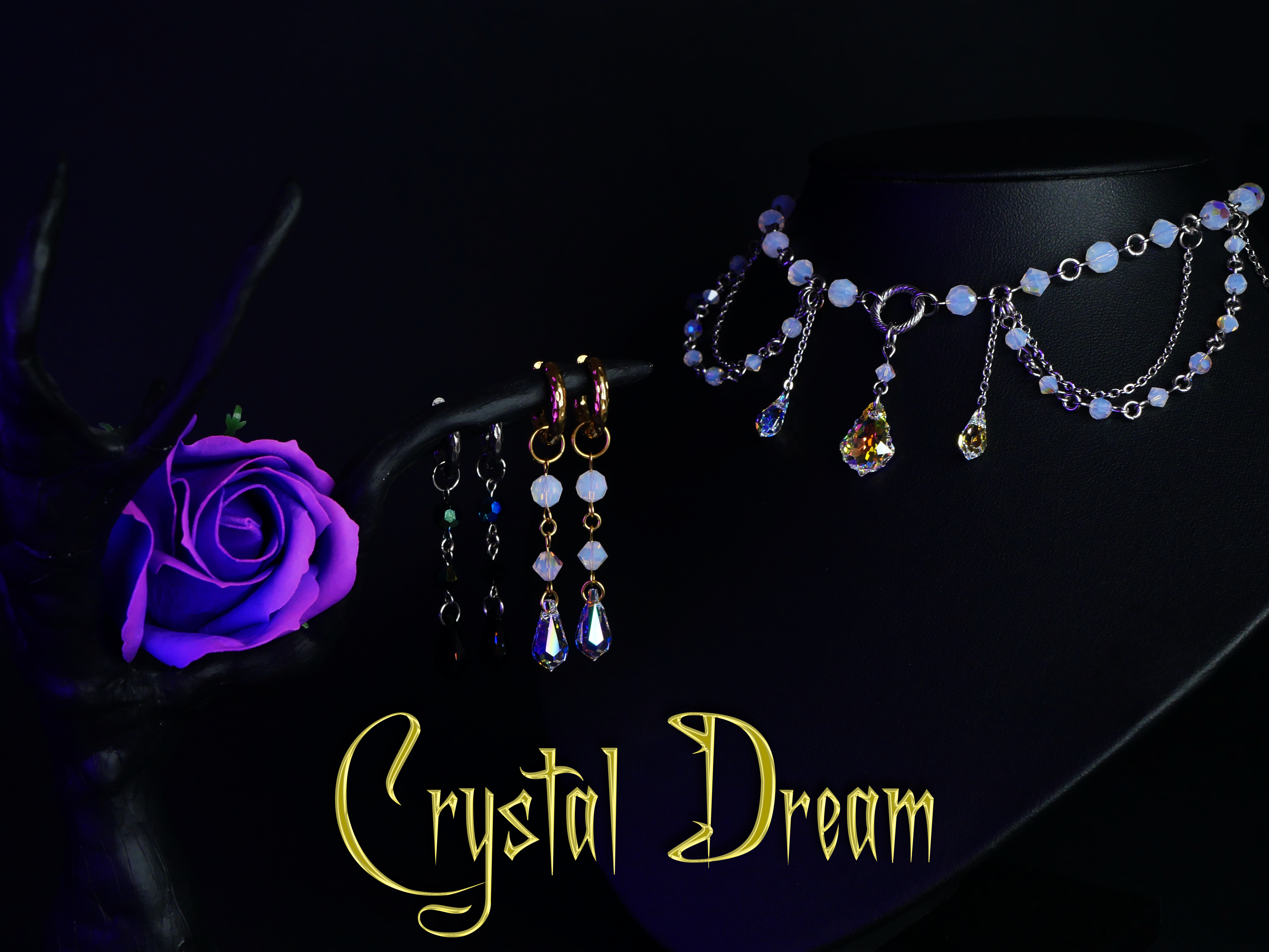Crystal Dream dévoile des bijoux entièrement façonnés en cristal, où la nuit rencontre le rêve : perles lumineuses et reflets changeants, comme des fragments de lune et d’océan capturés dans l’obscurité.