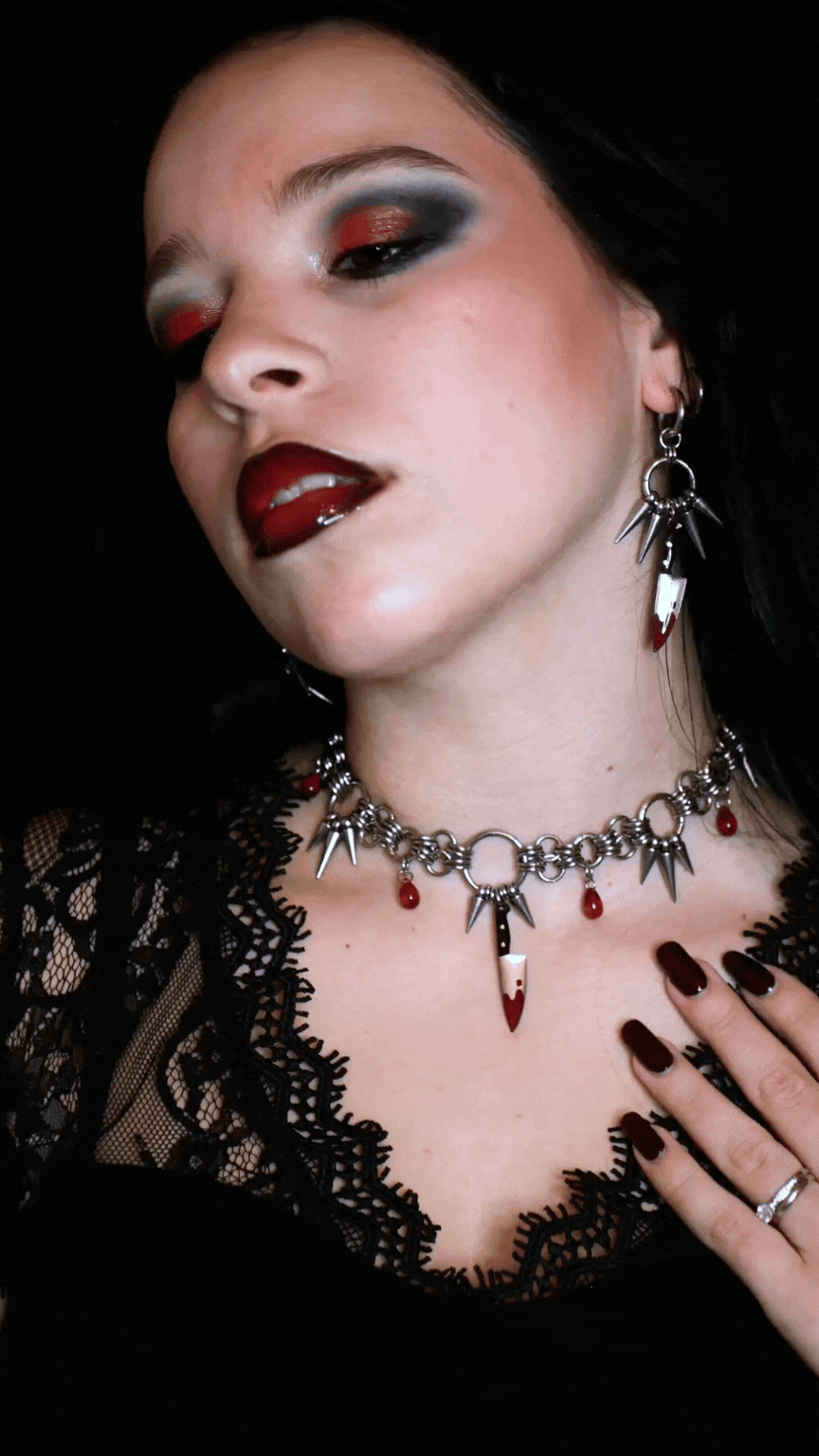 L’acier se mêle au rouge profond des perles de verre, les lames et trophés deviennent bijoux, et chaque pièce révèle un secret sanglant.