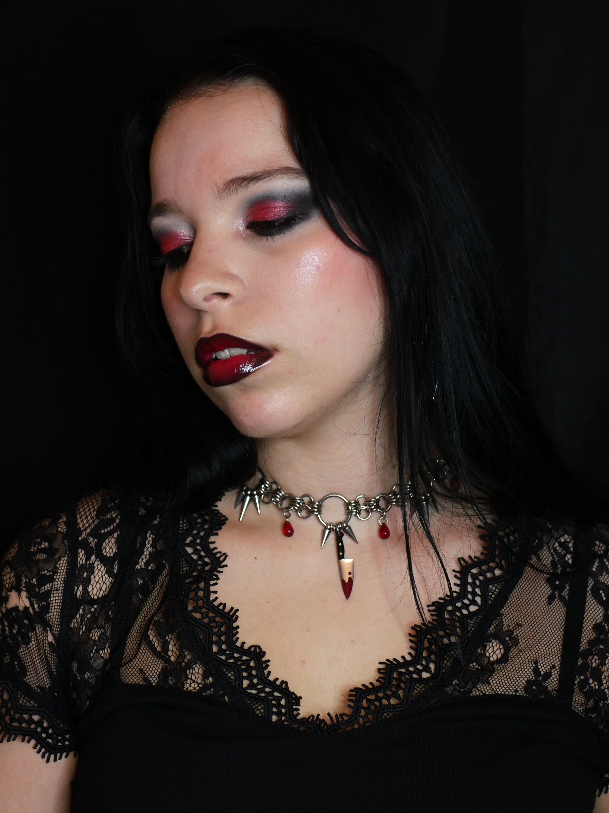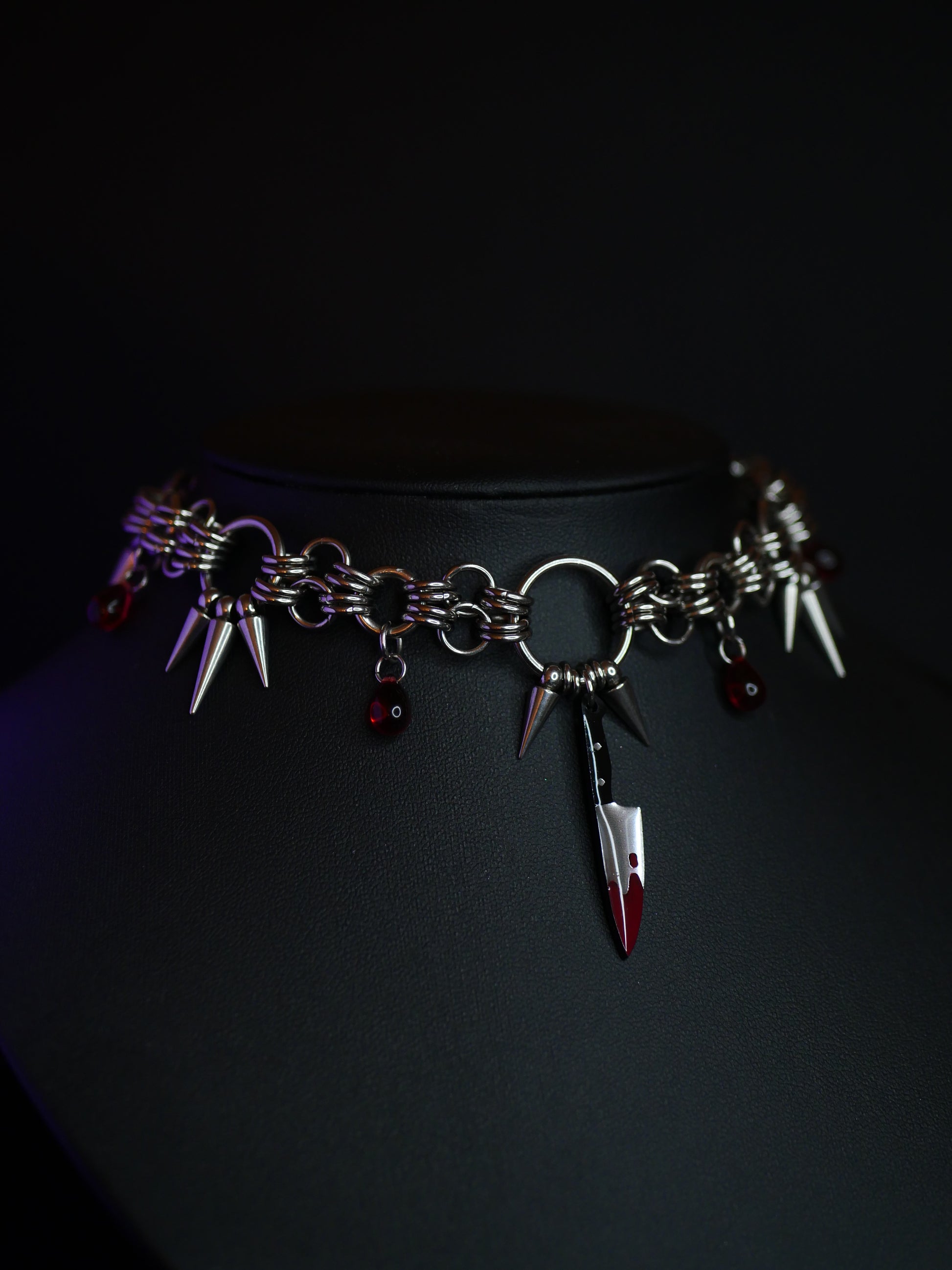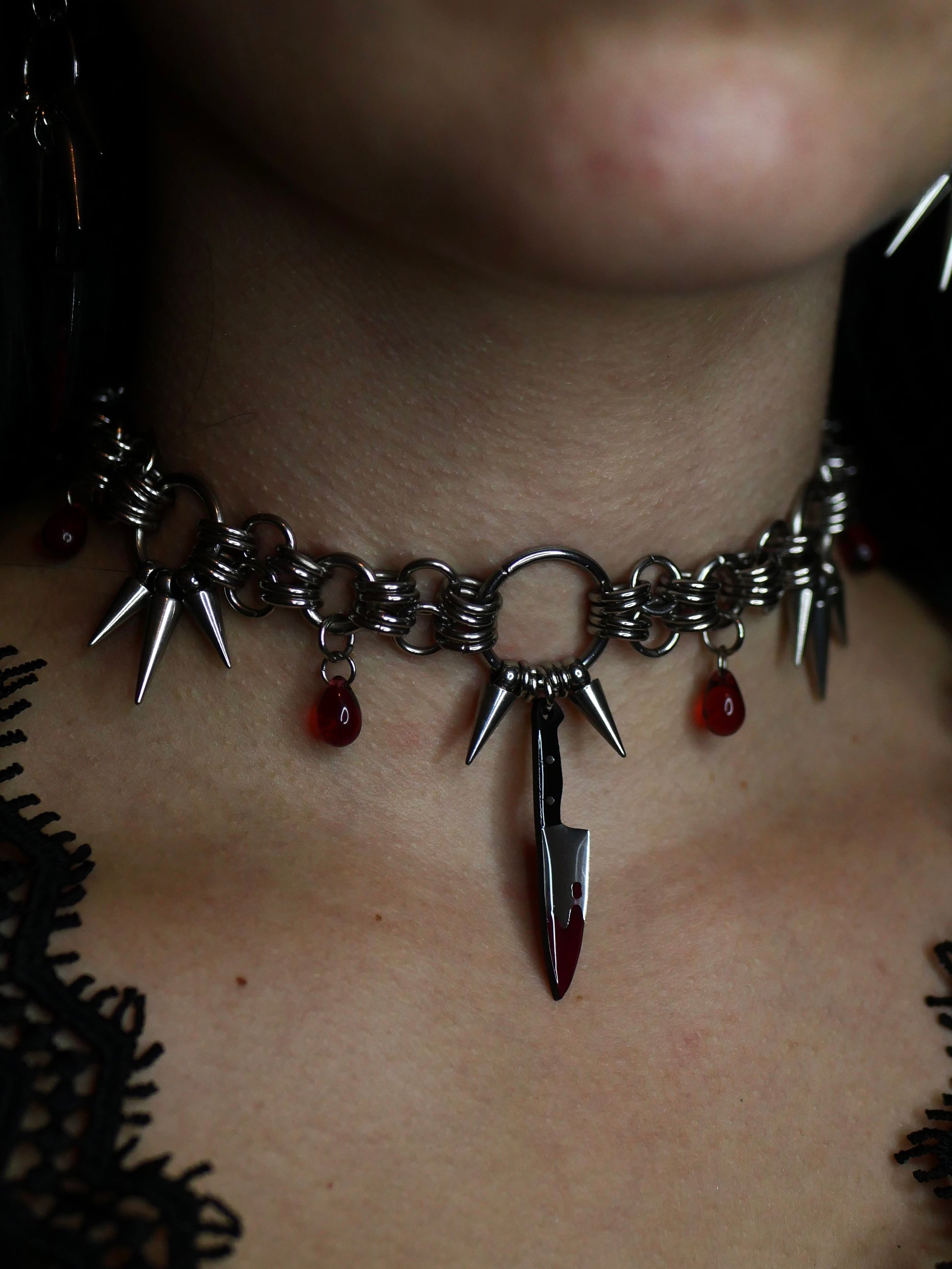 Ce ras de cou en acier inoxydable est orné d’anneaux, de piques et de perles en verre rouge rappelant des gouttes de sang.