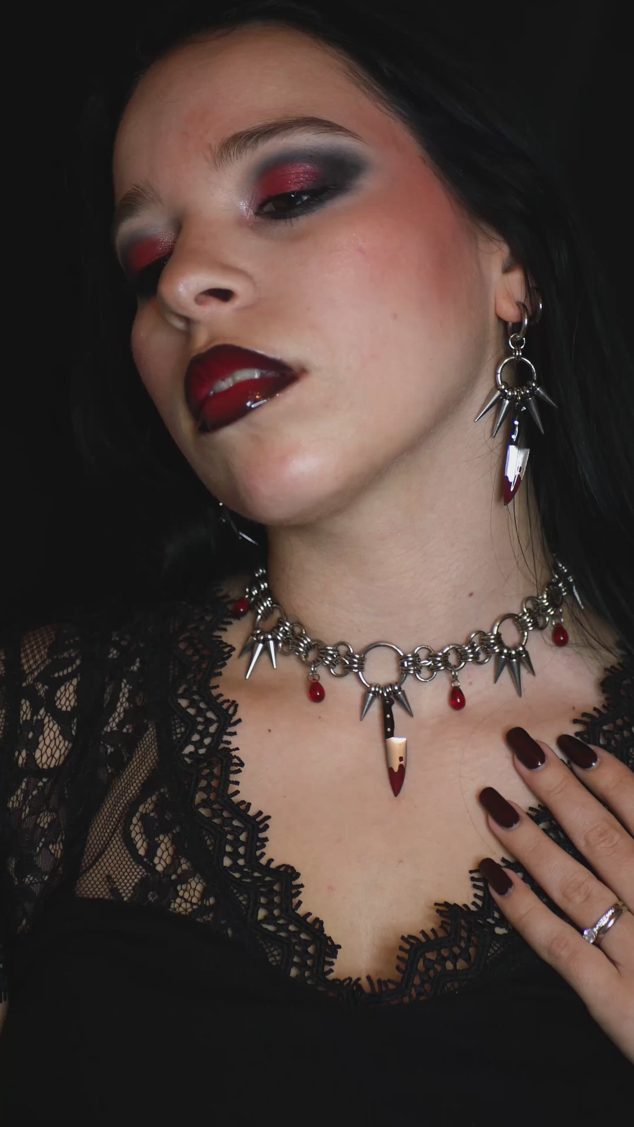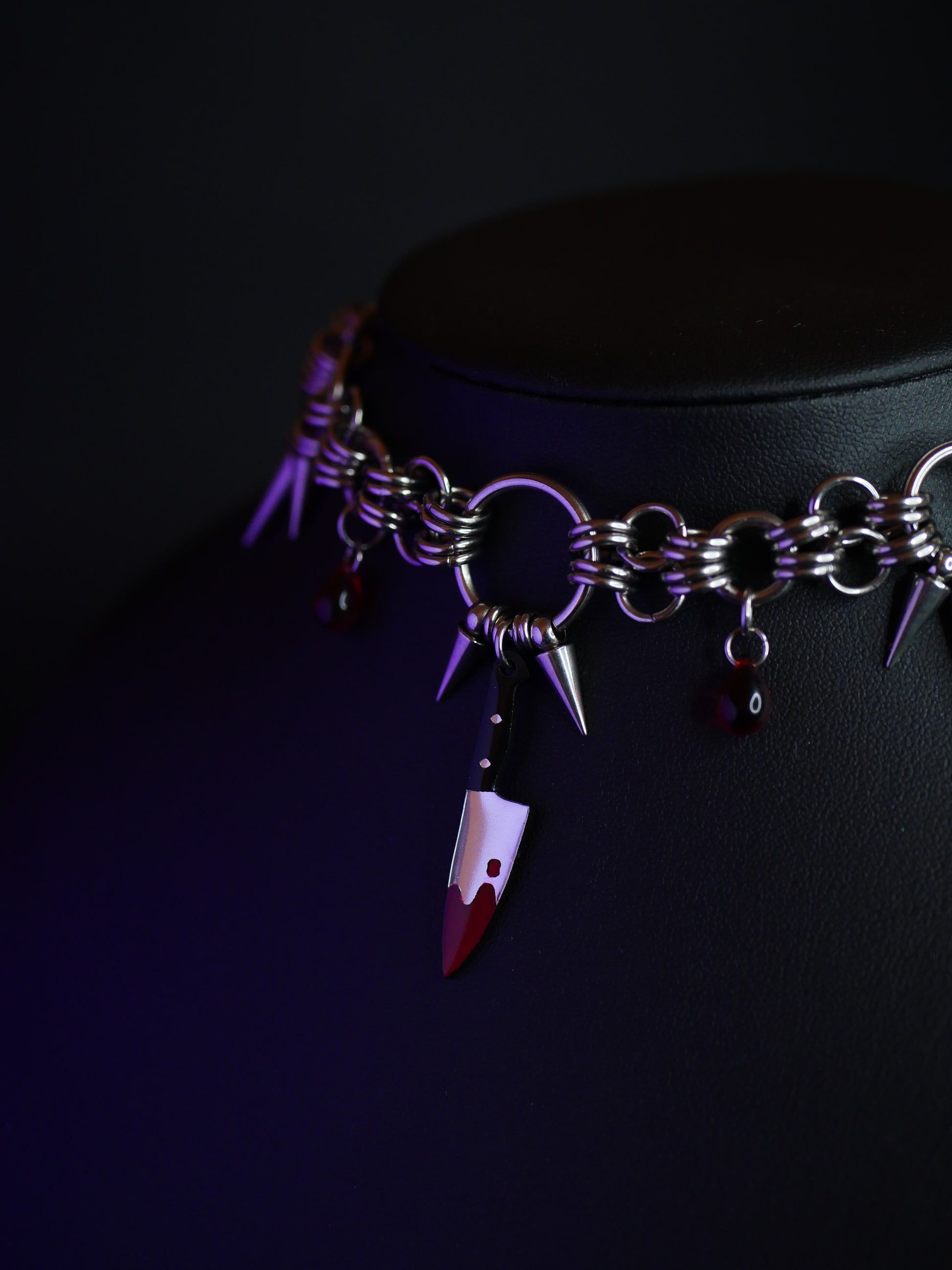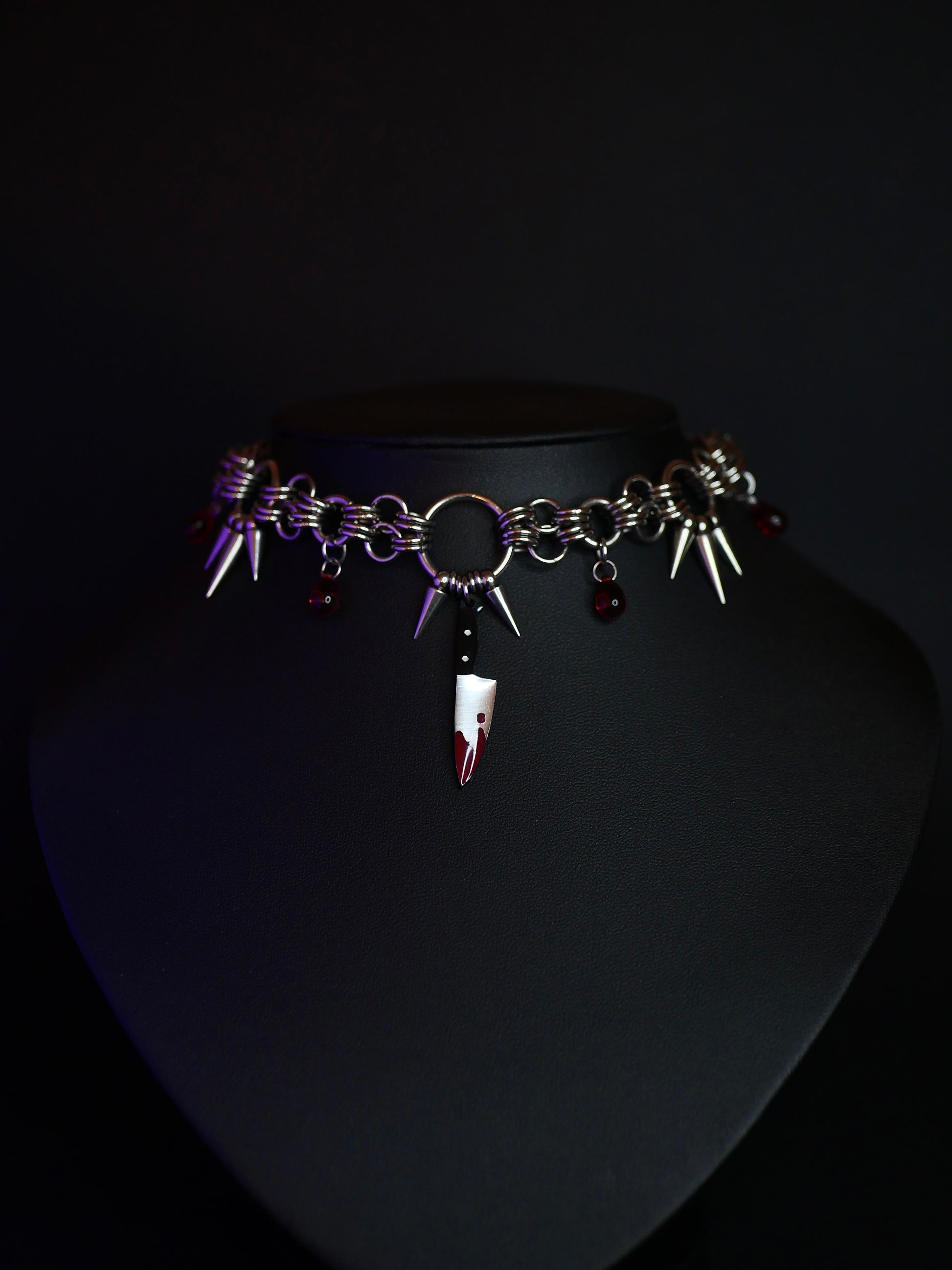 Son pendentif couteau, découpé dans de l’acrylique puis peint et recouvert de résine à la main, incarne toute la finesse macabre de la collection Bloody Secrets.
