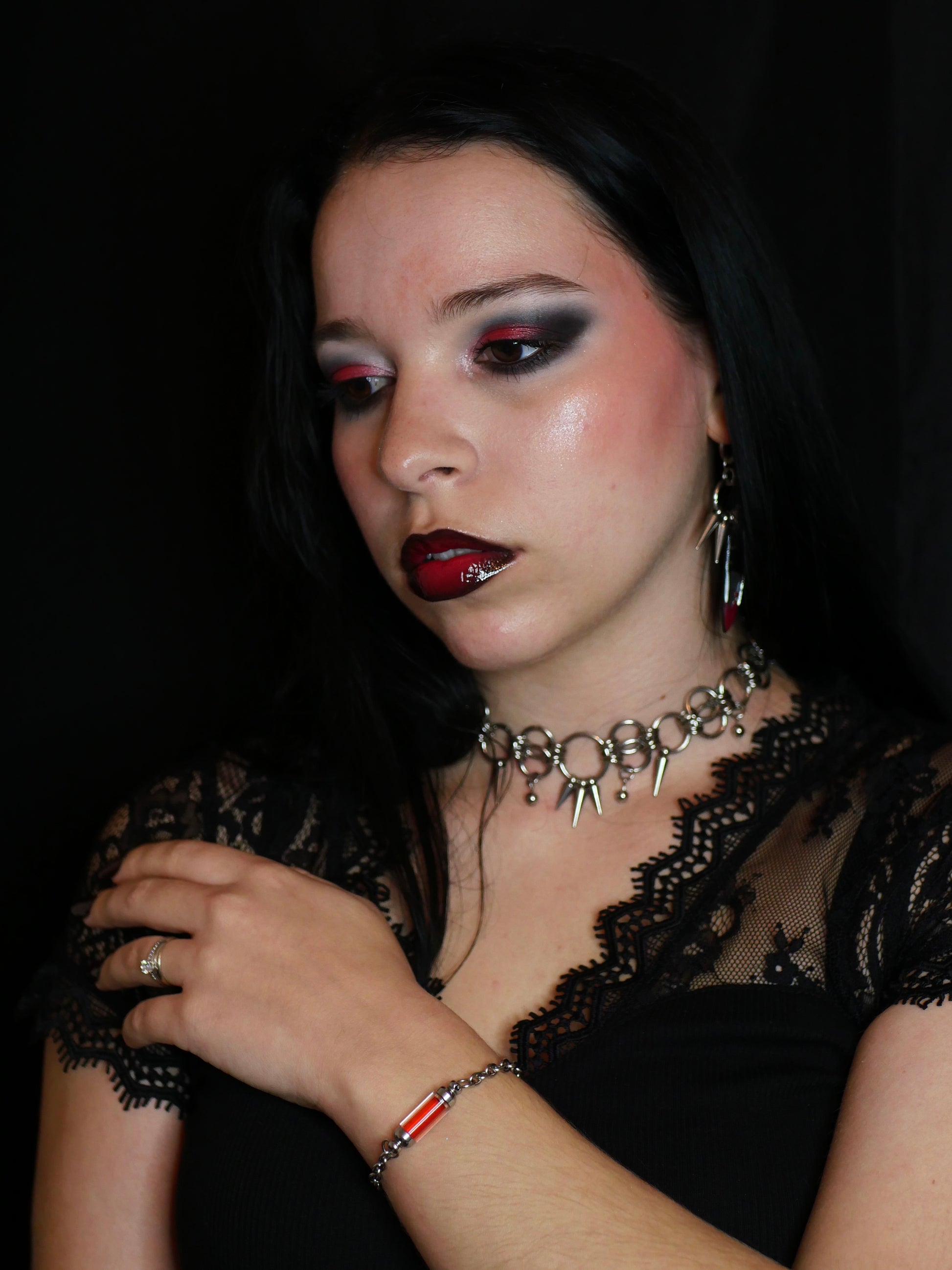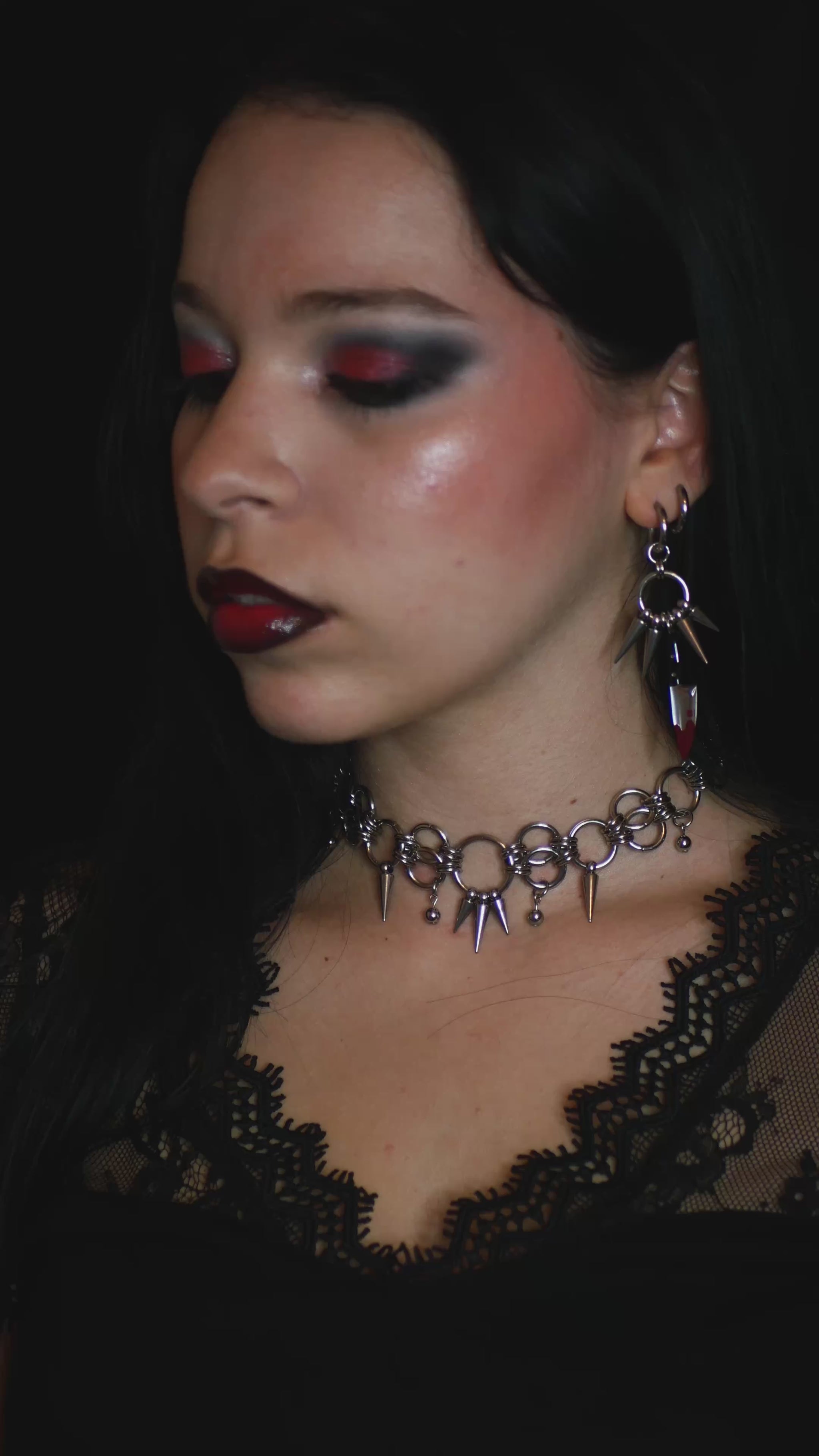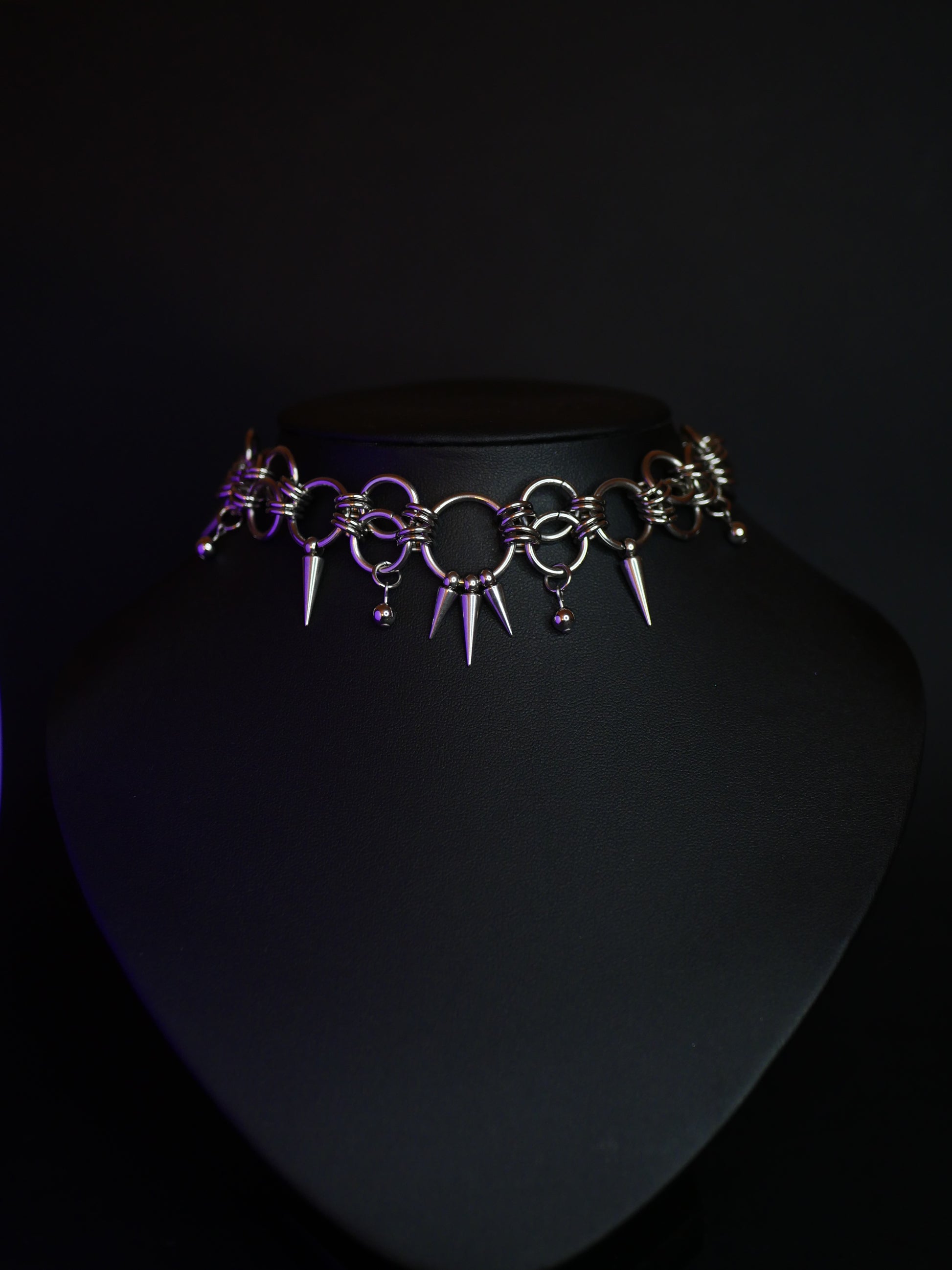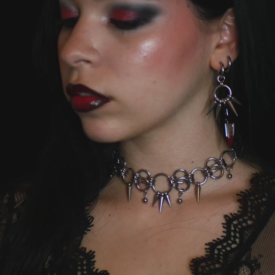 Ce choker en acier inoxydable unit anneaux et piques dans un design affirmé, où chaque reflet métallique évoque la puissance et la provocation.