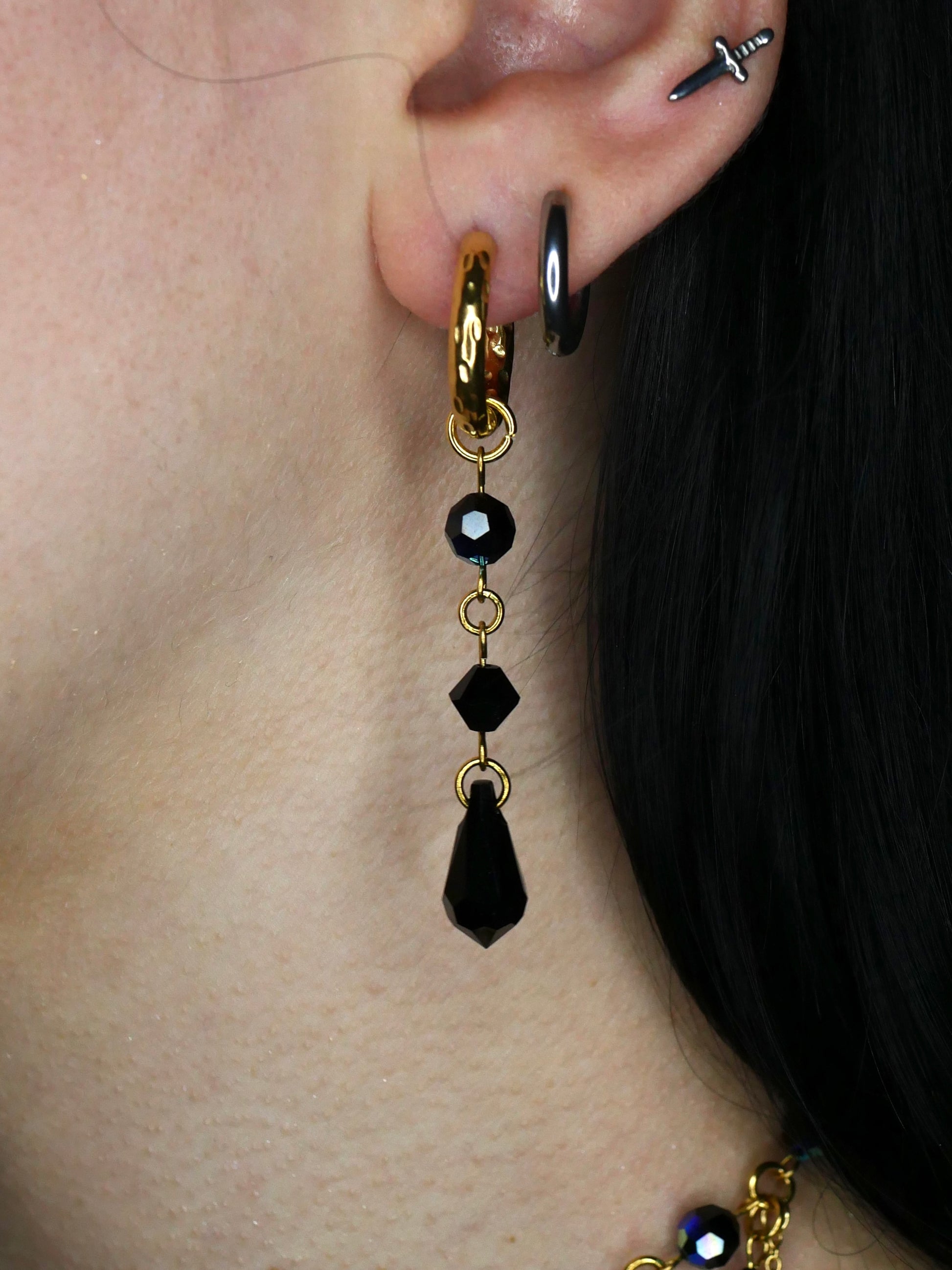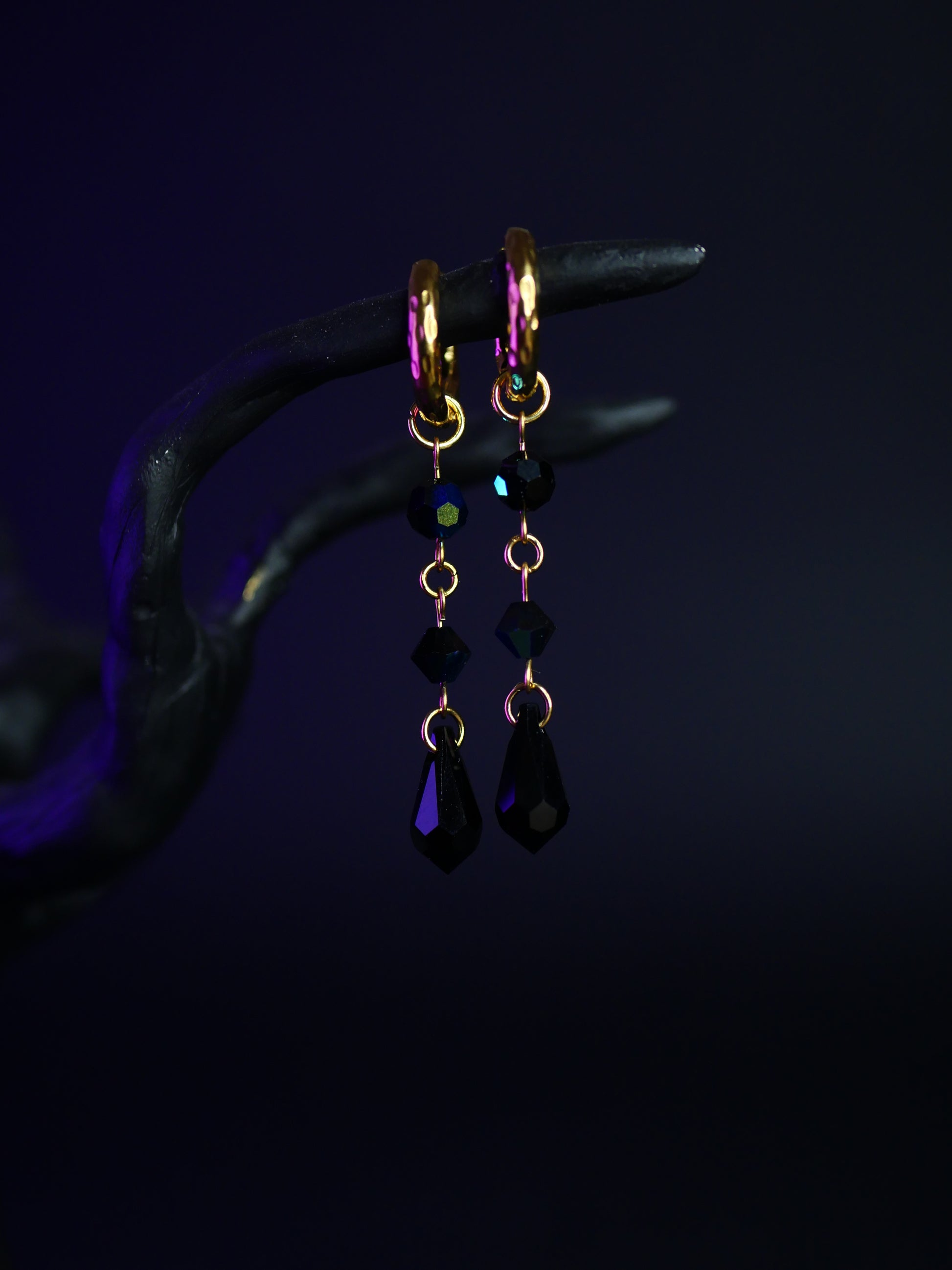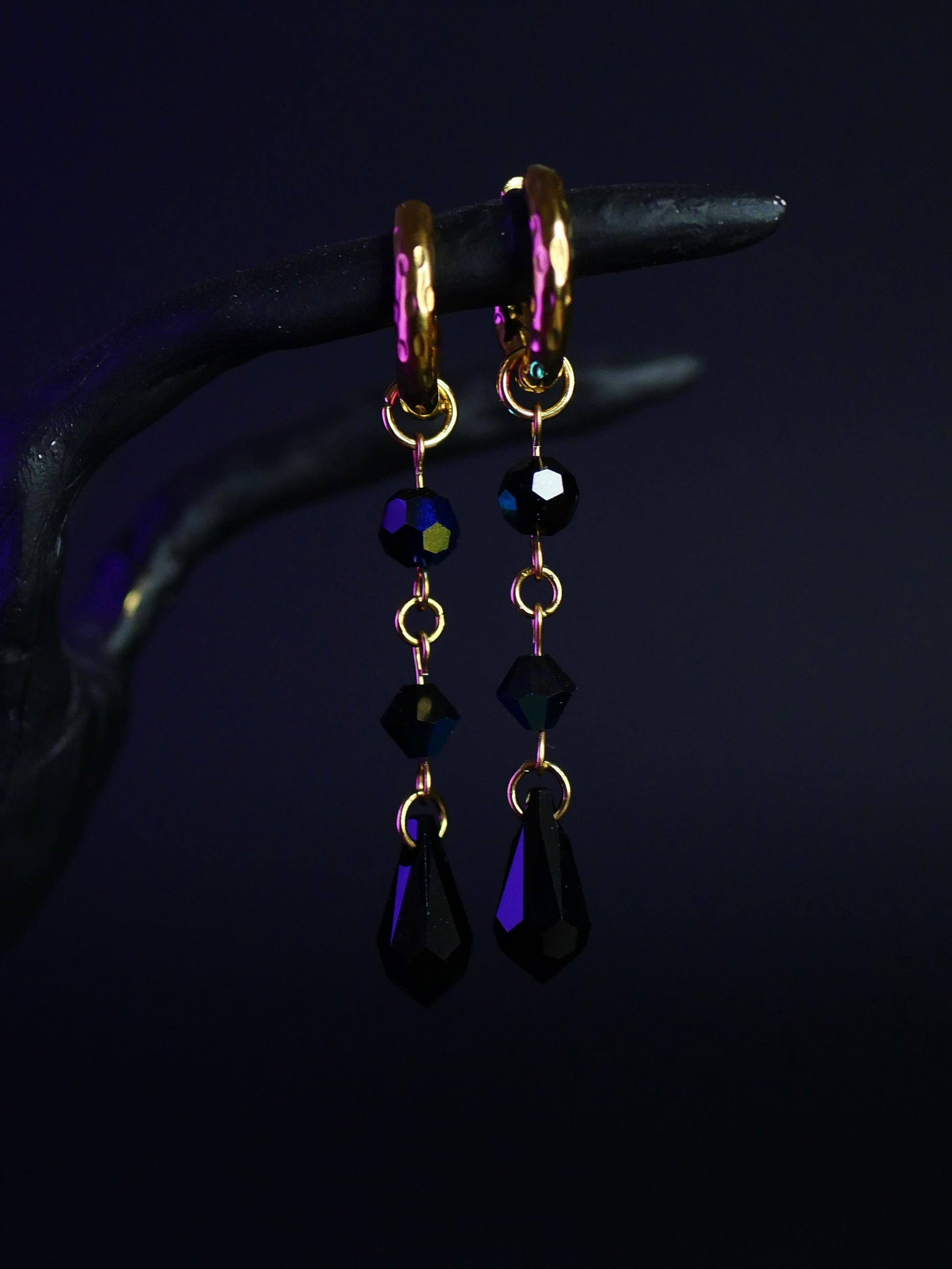 Un souffle de mystère doré. Les perles noires aux reflets changeants s’illuminent d’éclats bleu-vert, comme un océan en feu sous l’ombre d’une éclipse. Entièrement façonnés en cristal.
