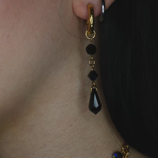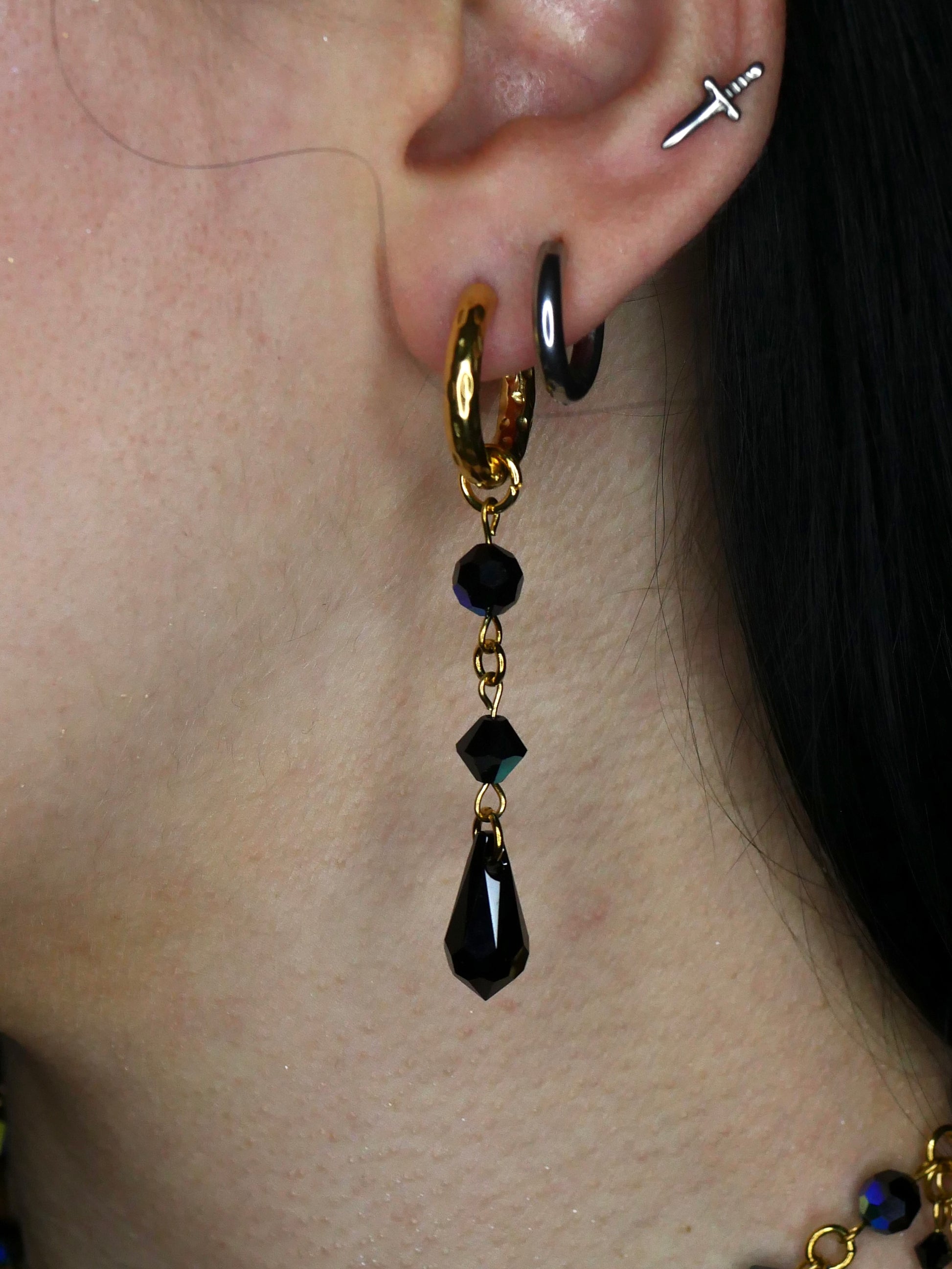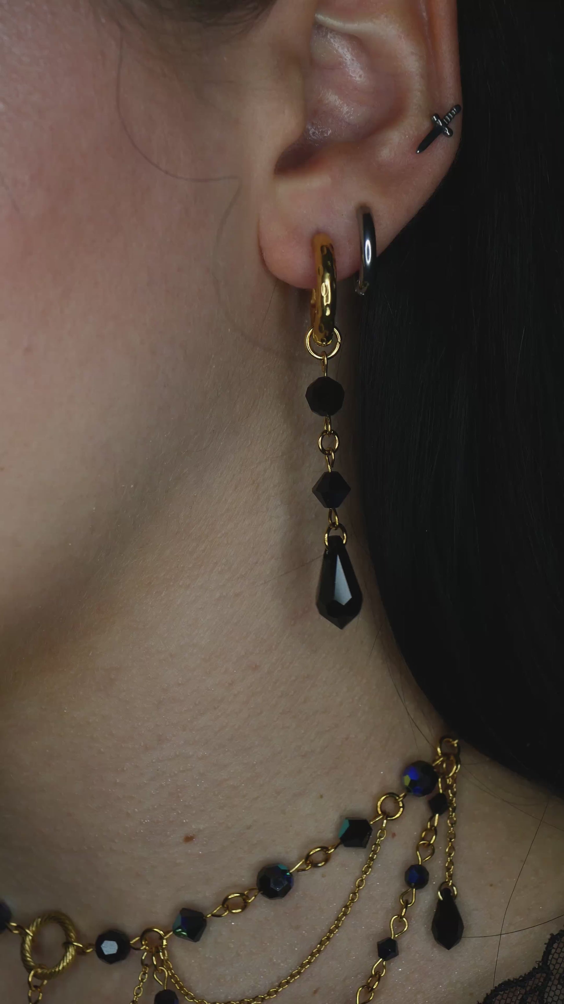 Un souffle de mystère doré. Les perles noires aux reflets changeants s’illuminent d’éclats bleu-vert, comme un océan en feu sous l’ombre d’une éclipse. Entièrement façonnés en cristal.
