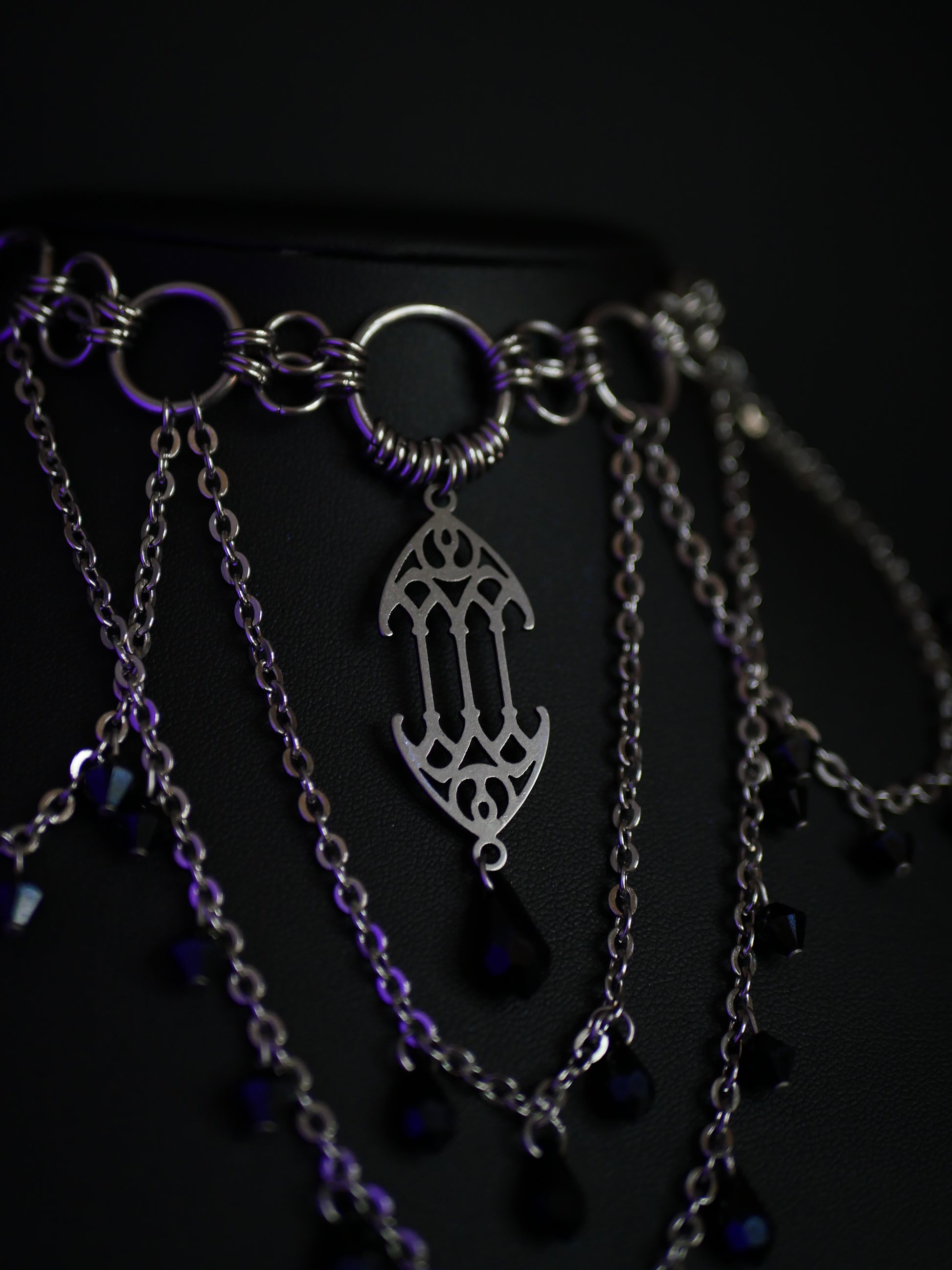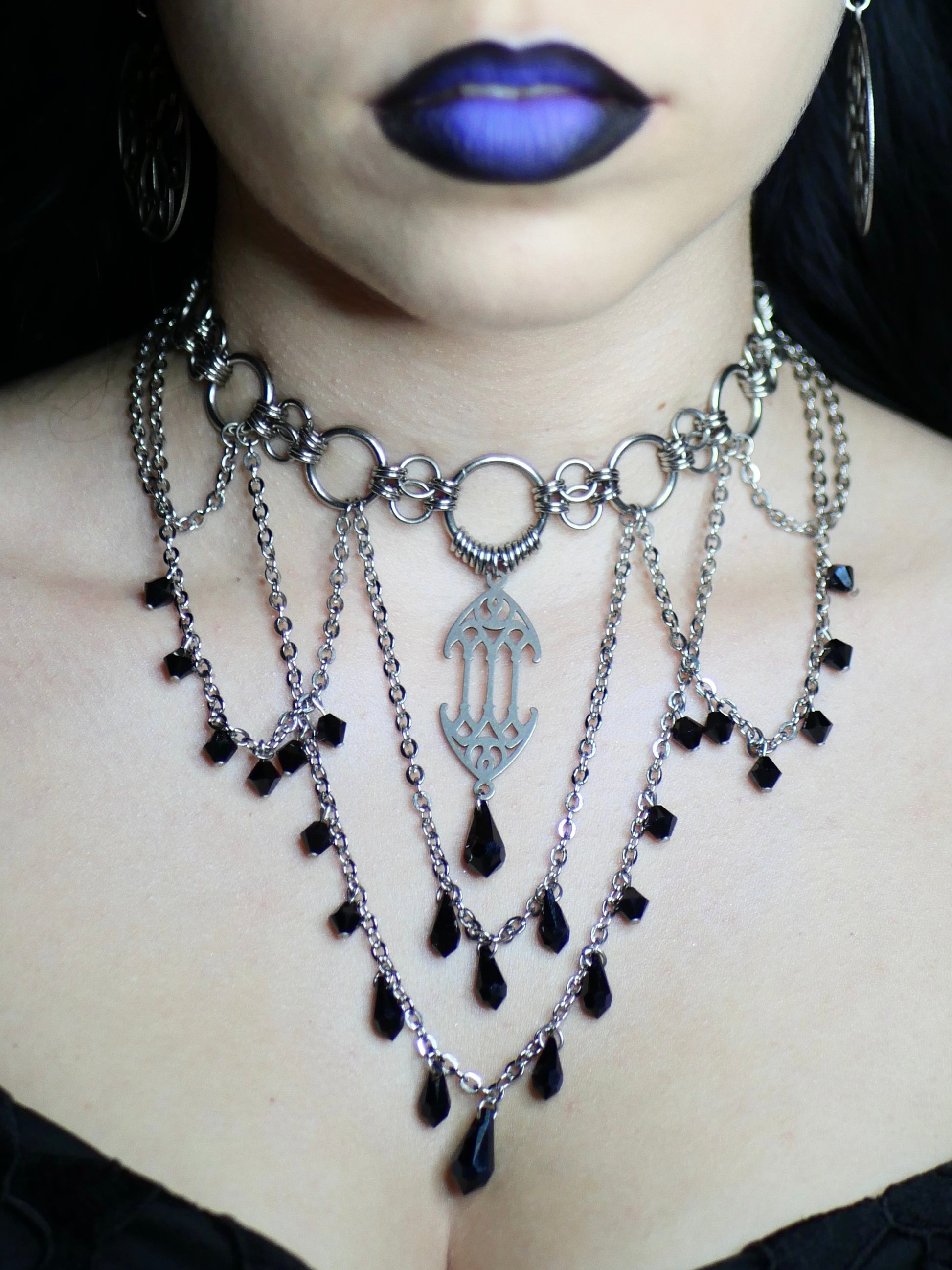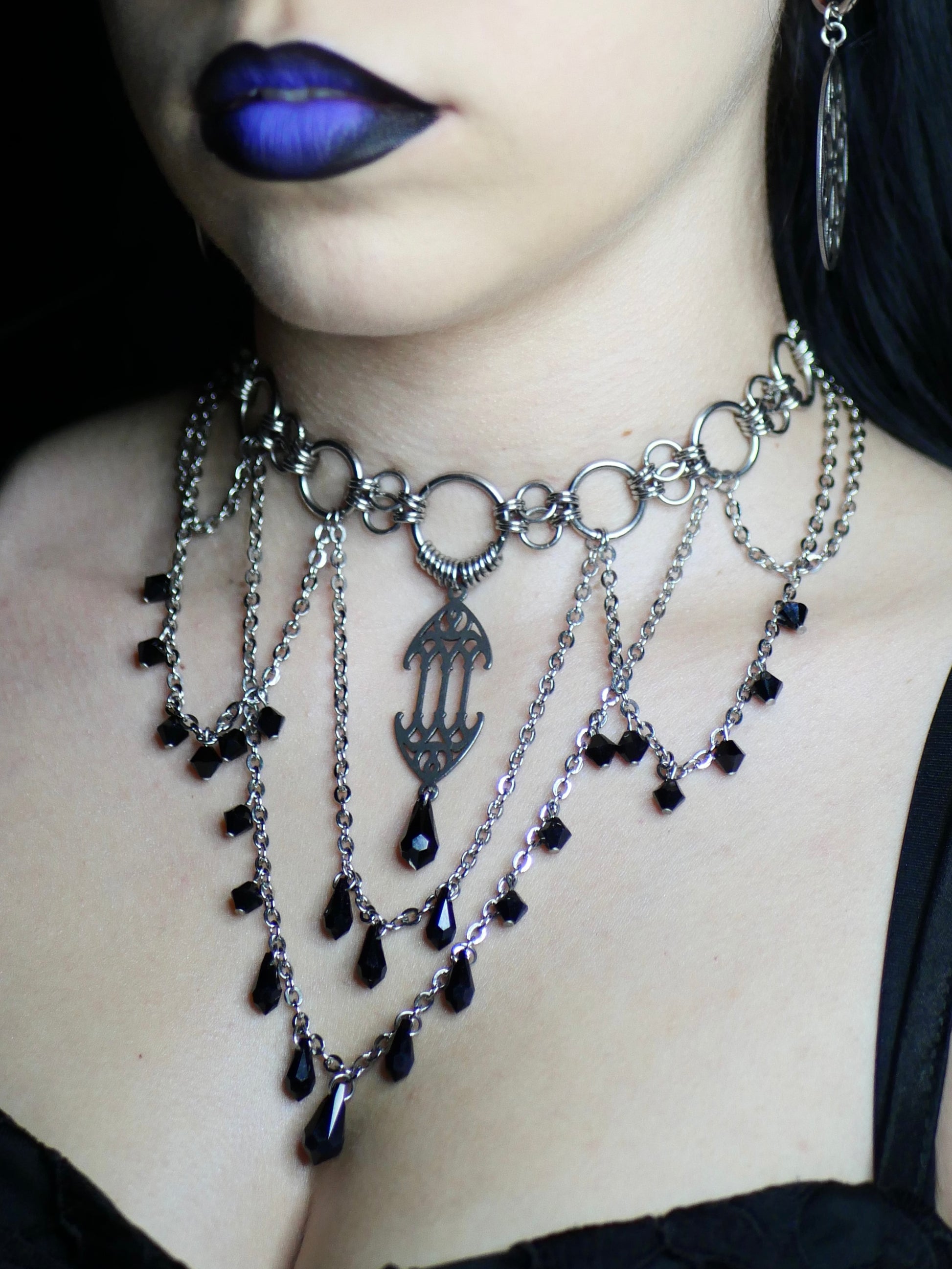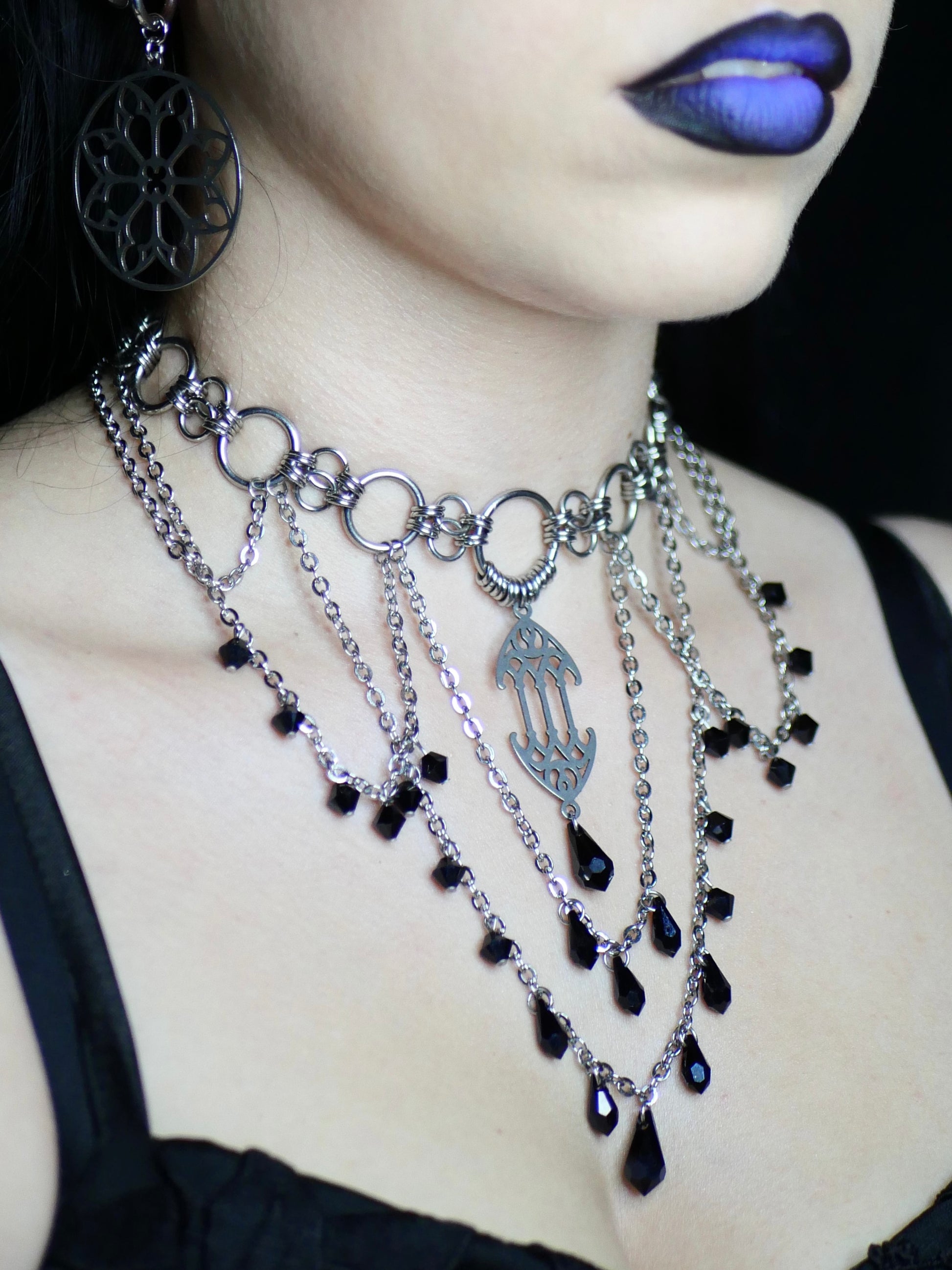 Orné d’un pendentif vitrail en acier inoxydable et de perles noires en verre et cristal.