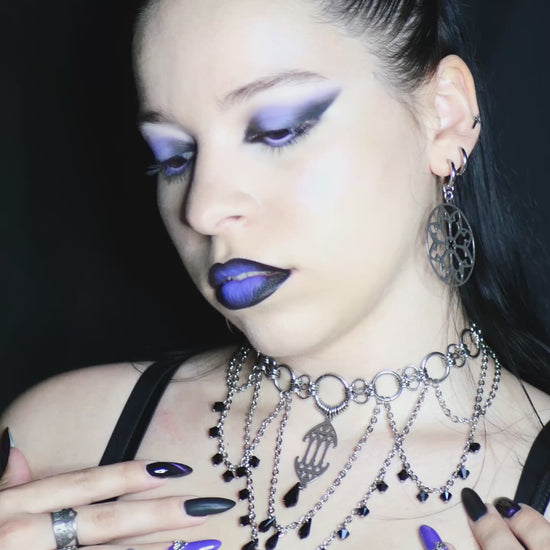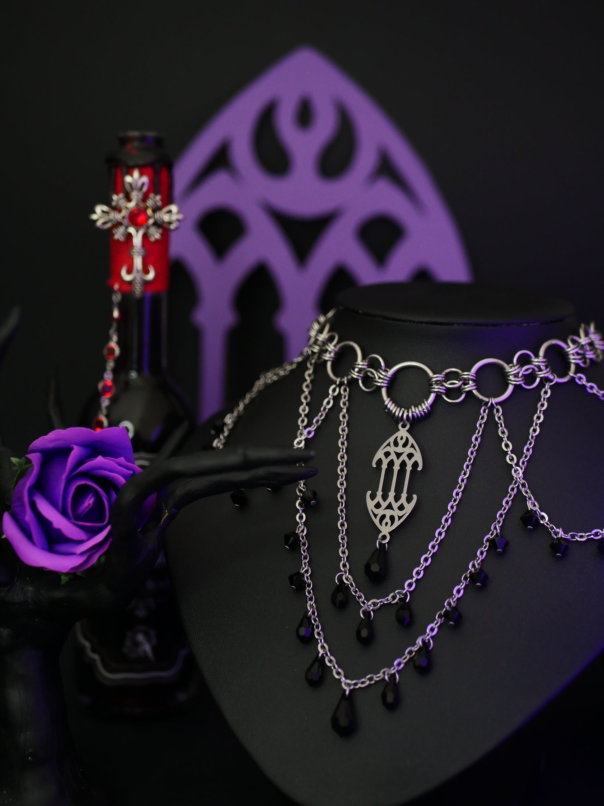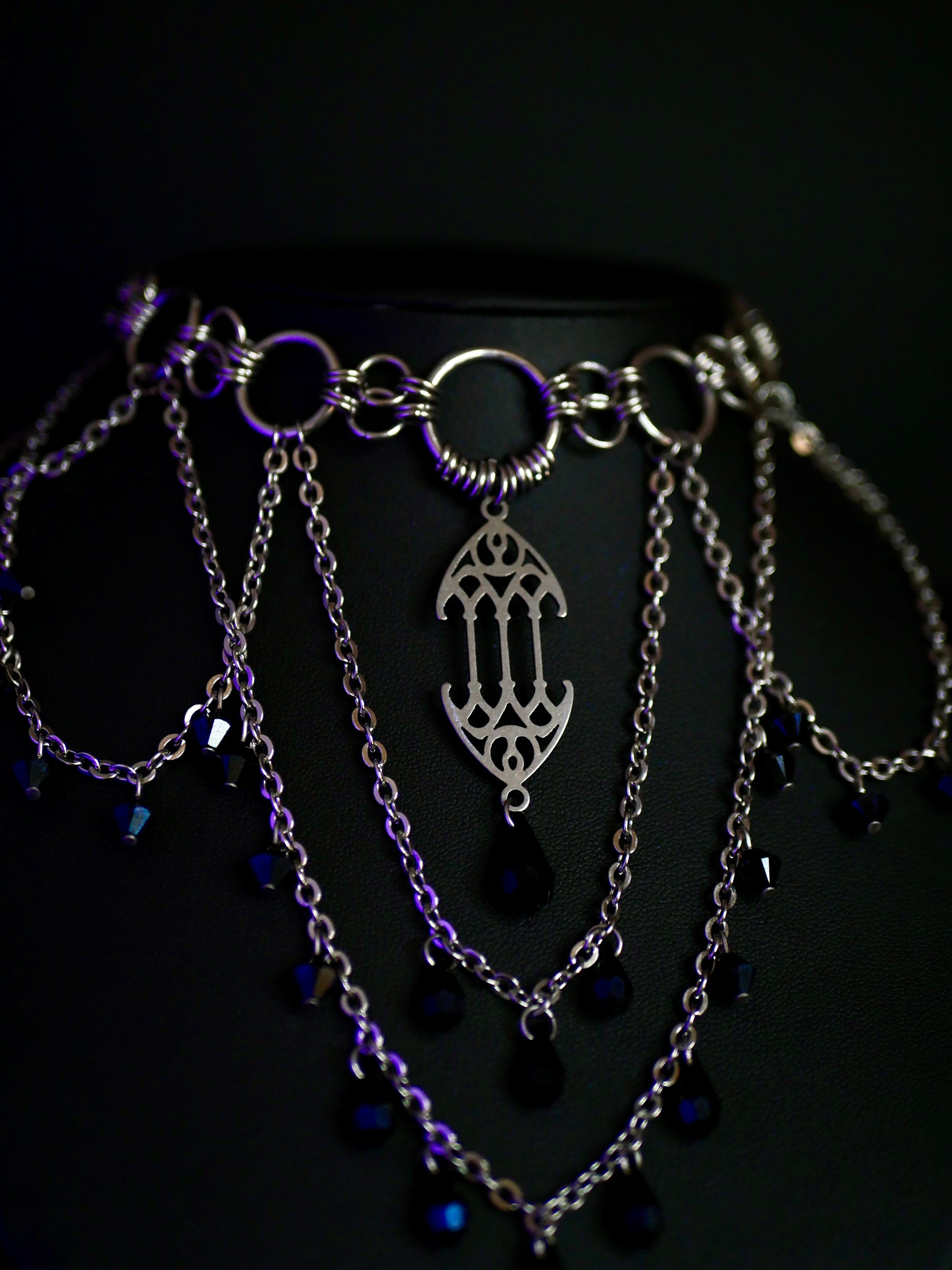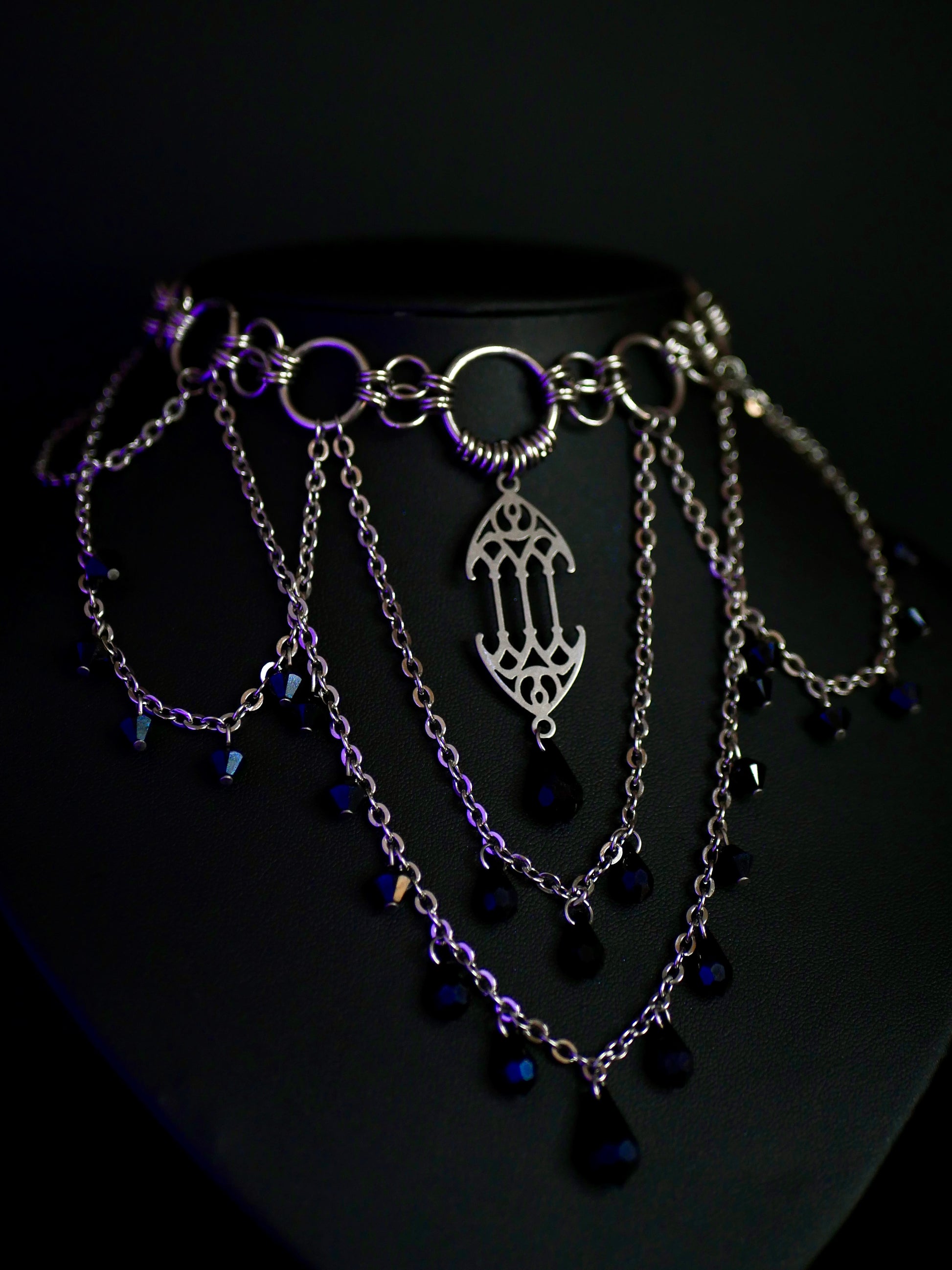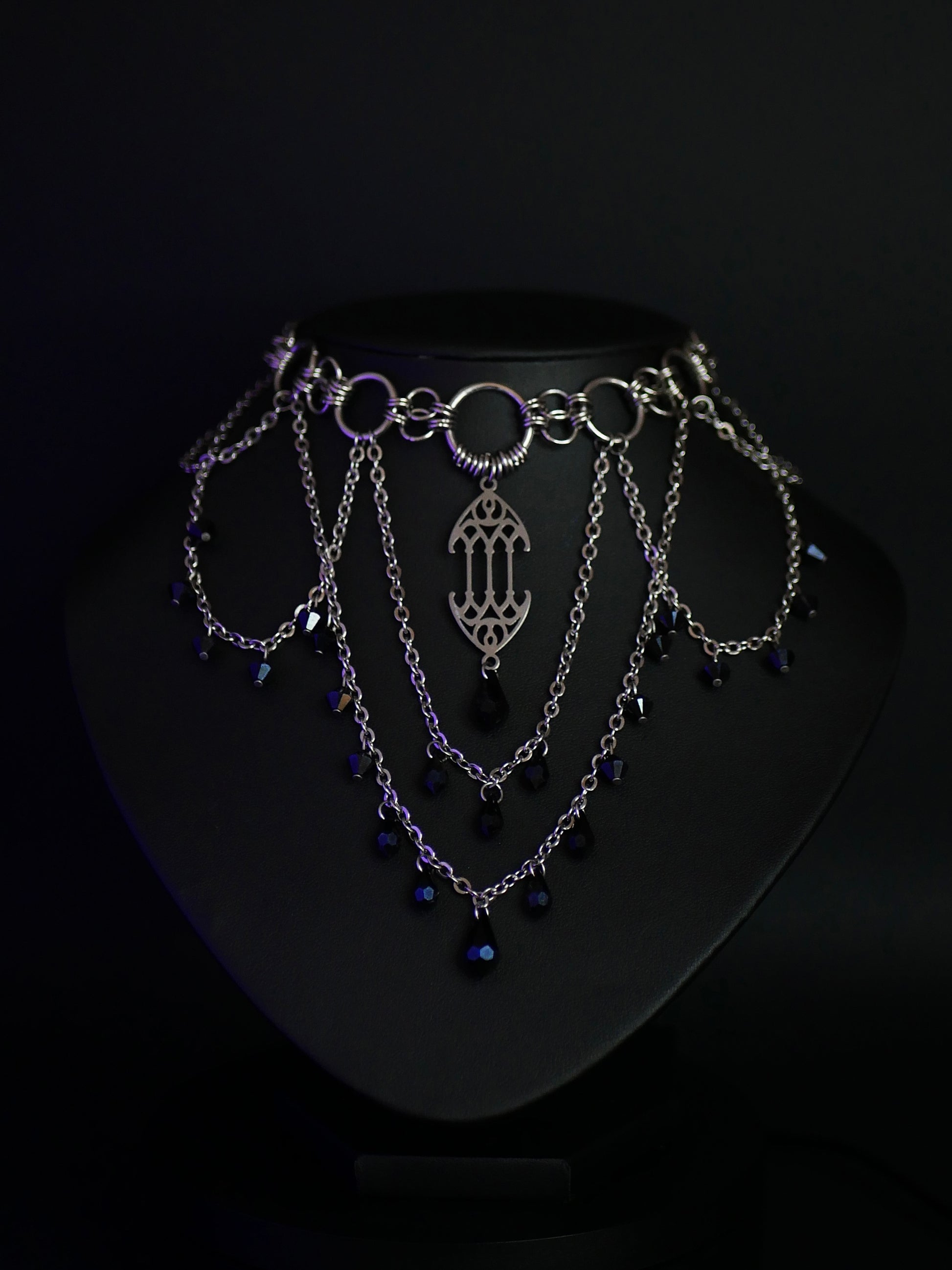 Orné d’un pendentif vitrail en acier inoxydable et de perles noires en verre et cristal.