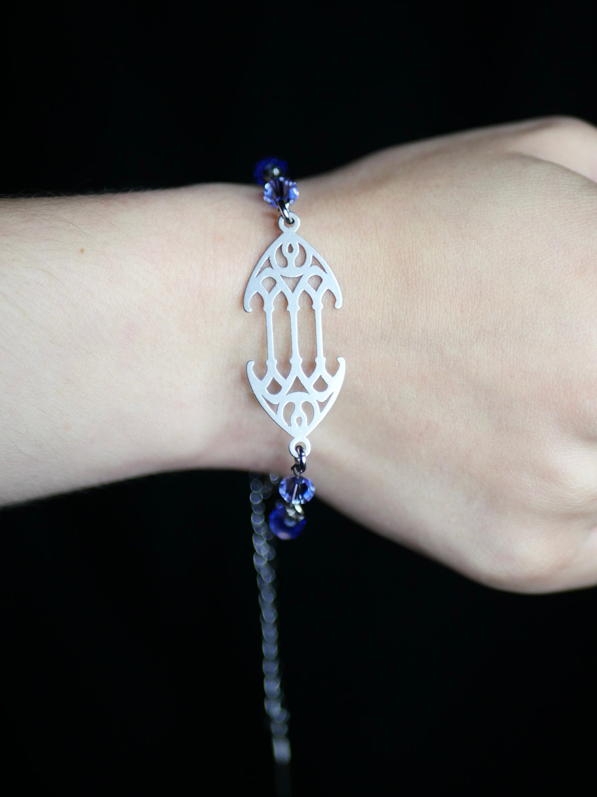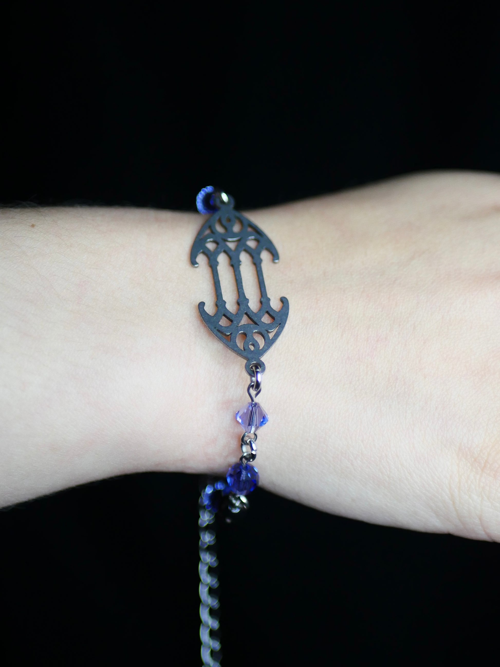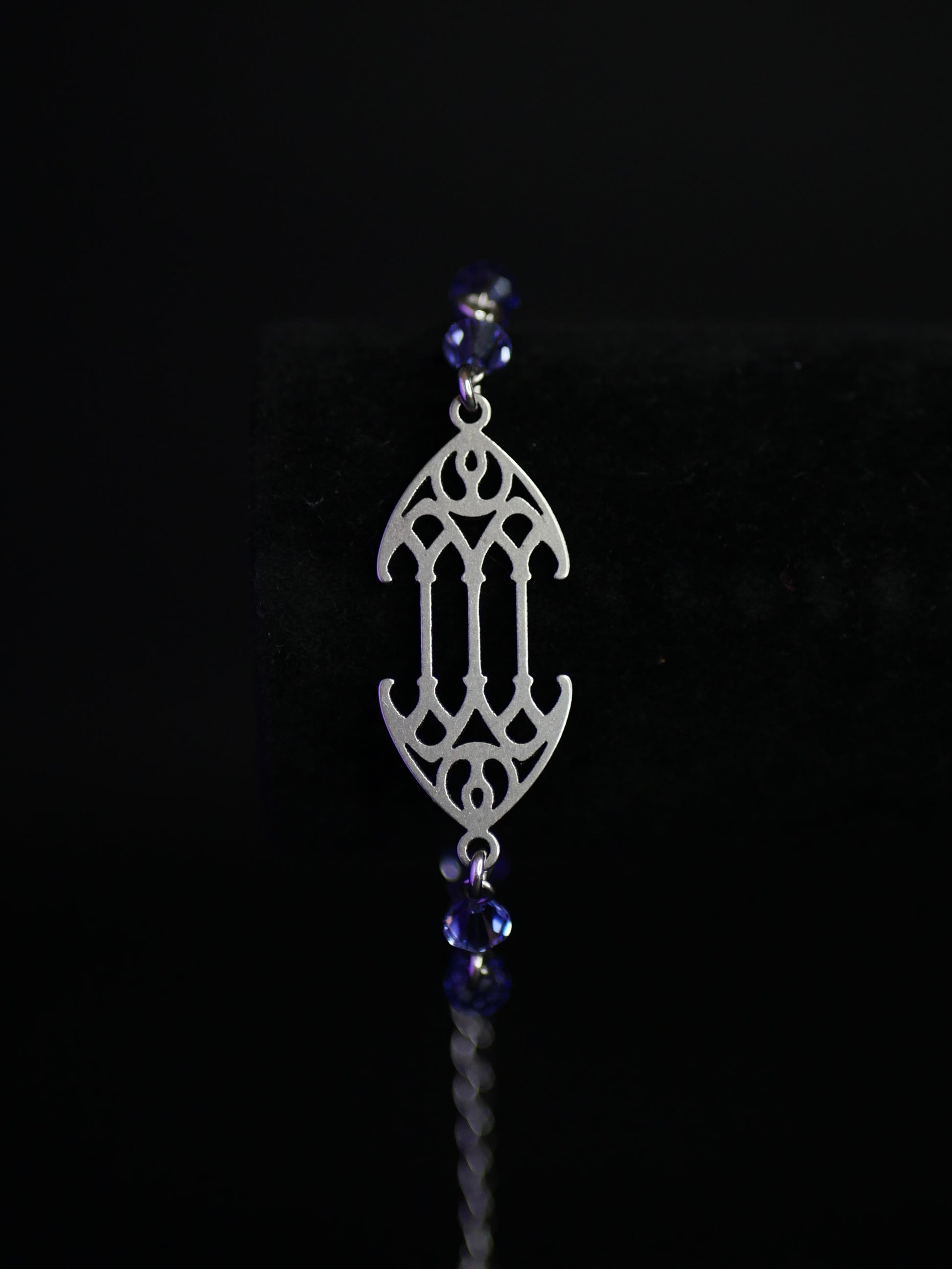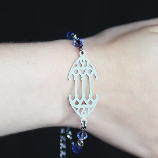 Le bracelet Eternal Glass est composé d'un vitrail en acier inoxydable et de perles en verre noir et violette.