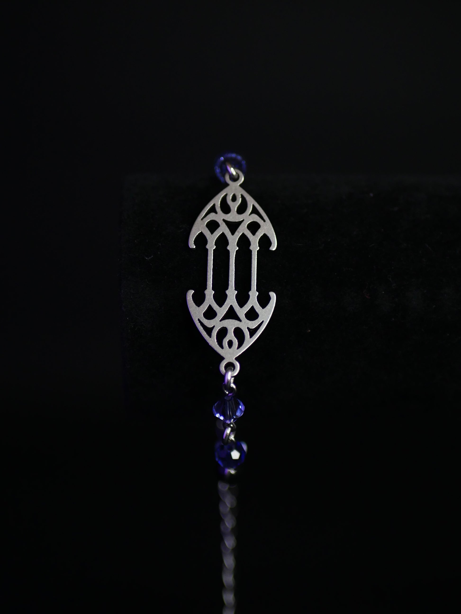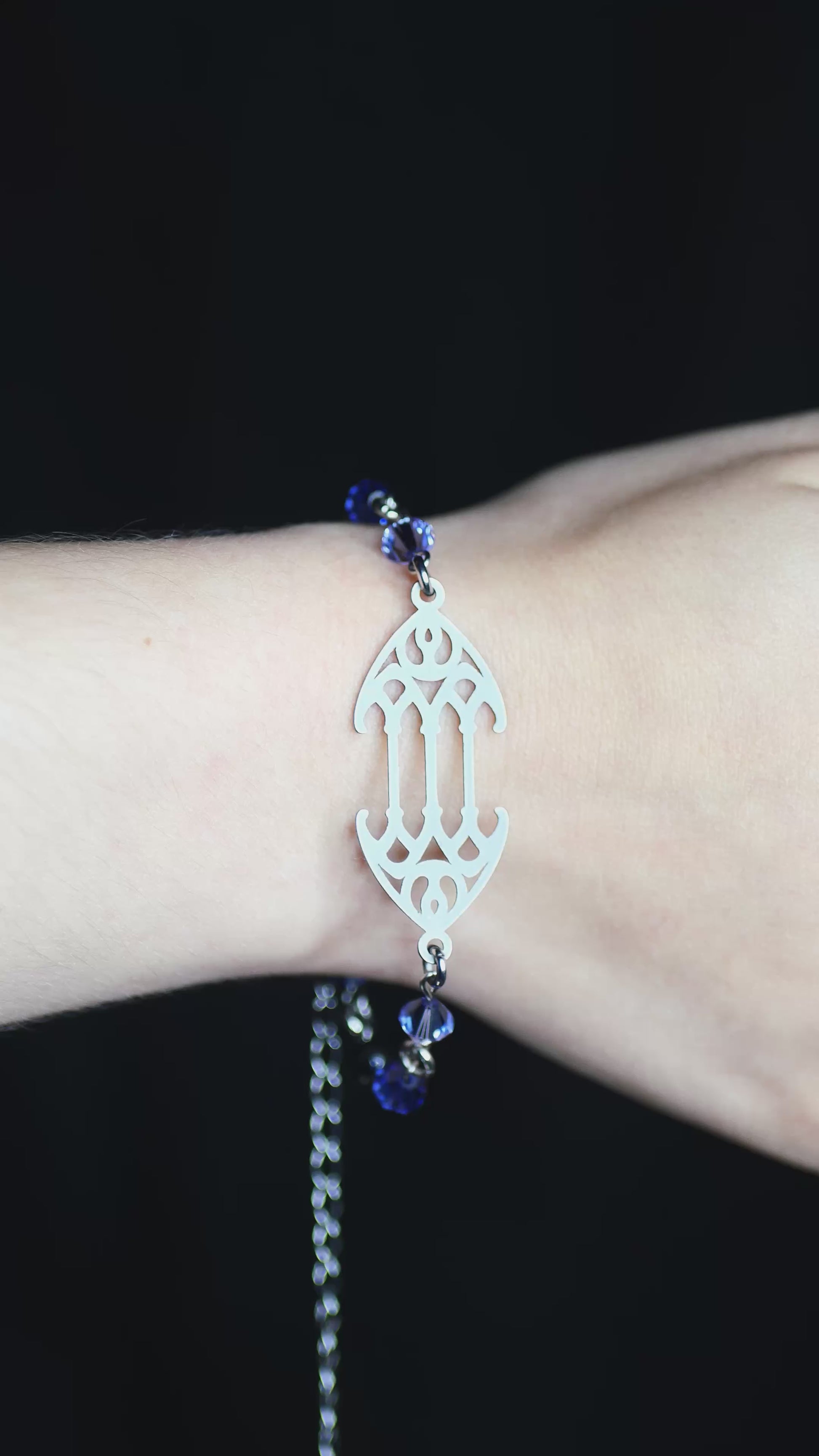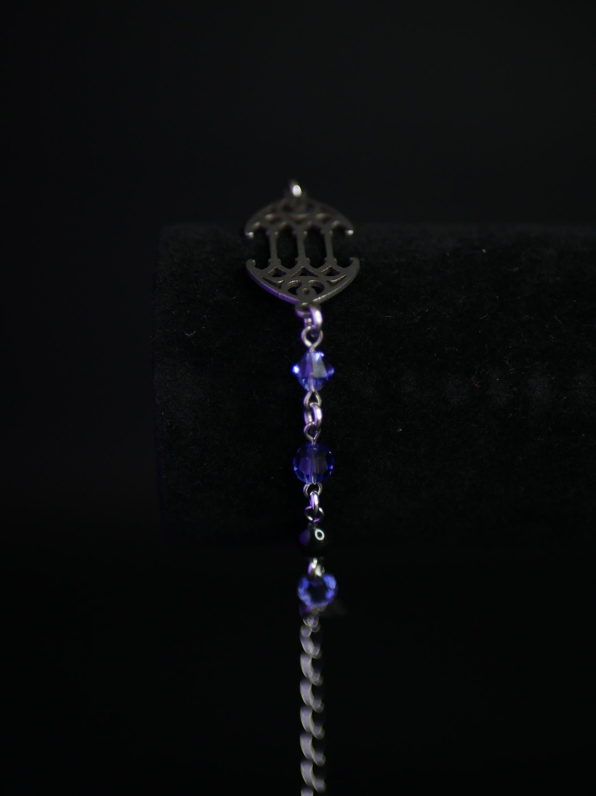 Le bracelet Eternal Glass est composé d'un vitrail en acier inoxydable et de perles en verre noir et violette.