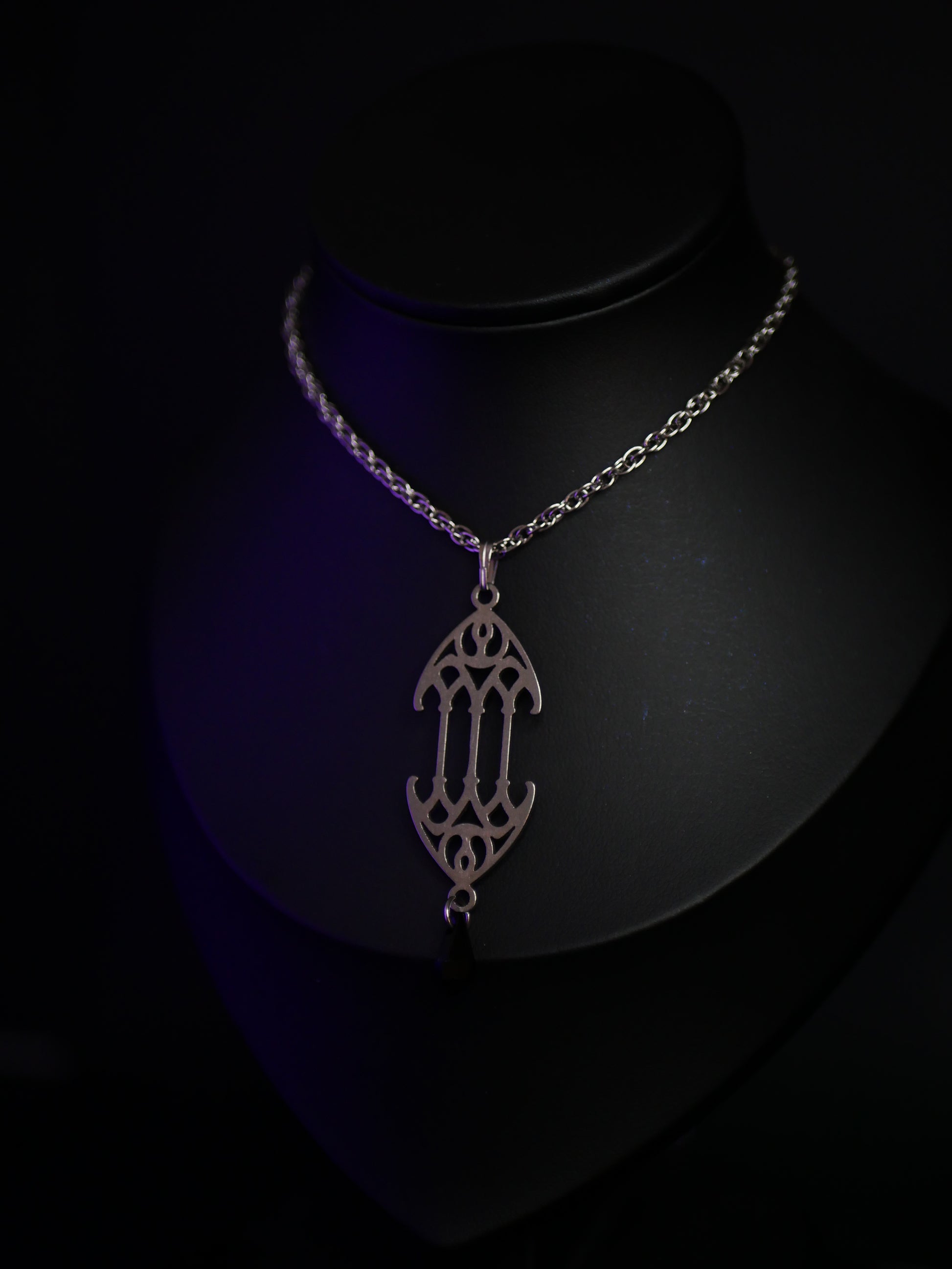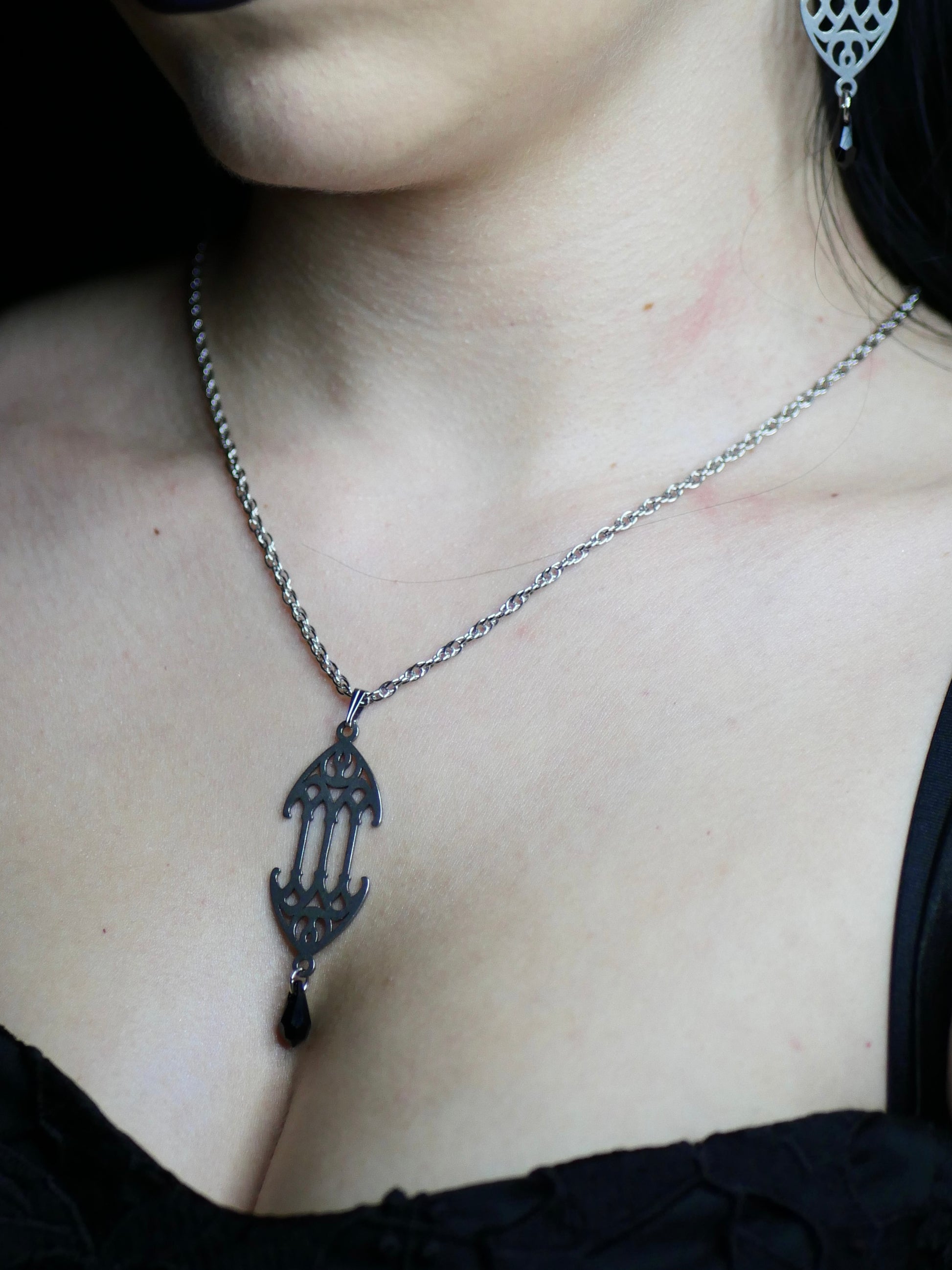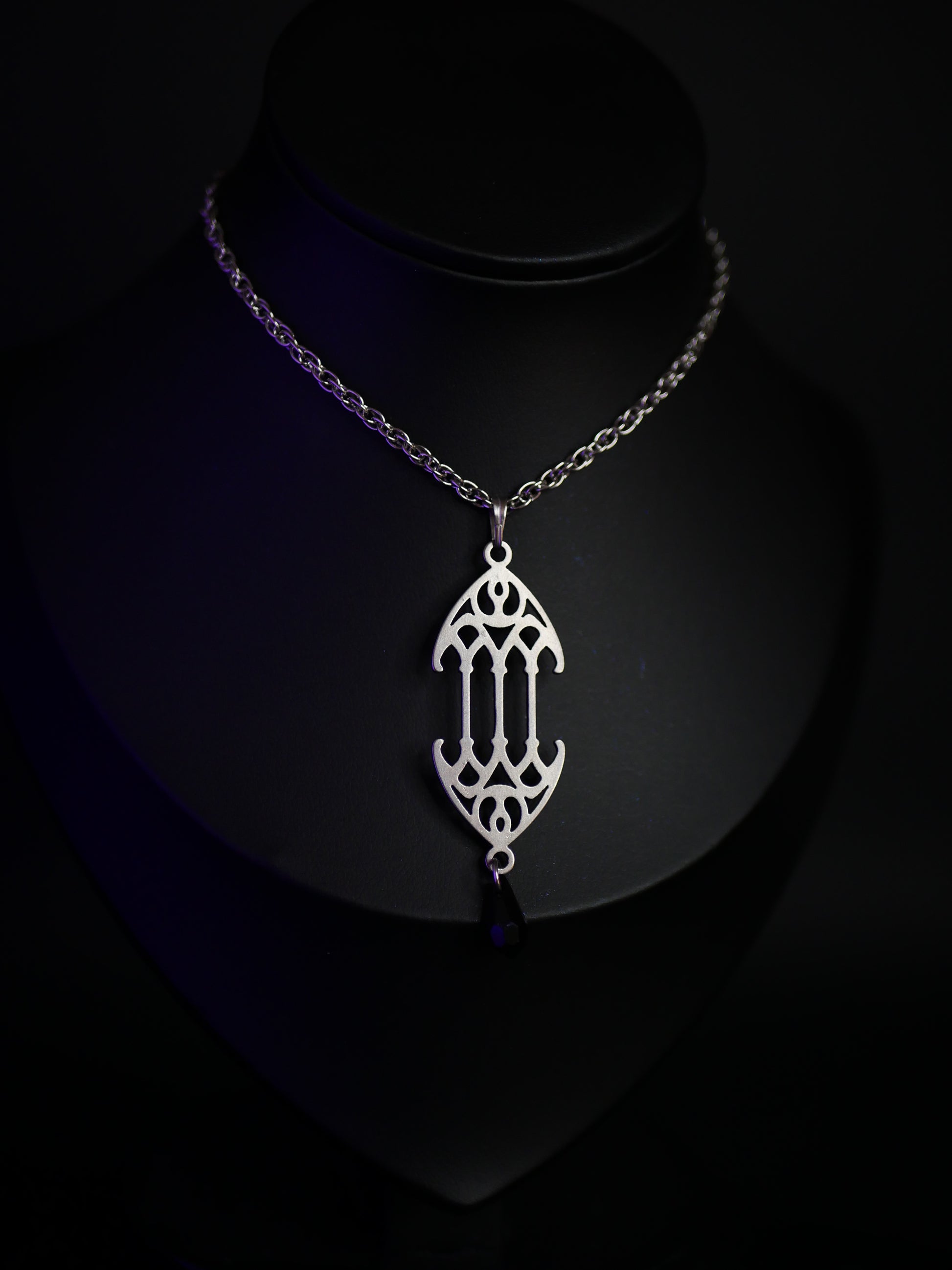 Une belle chaîne orné d’un pendentif vitrail et d'une perle noir en cristal.