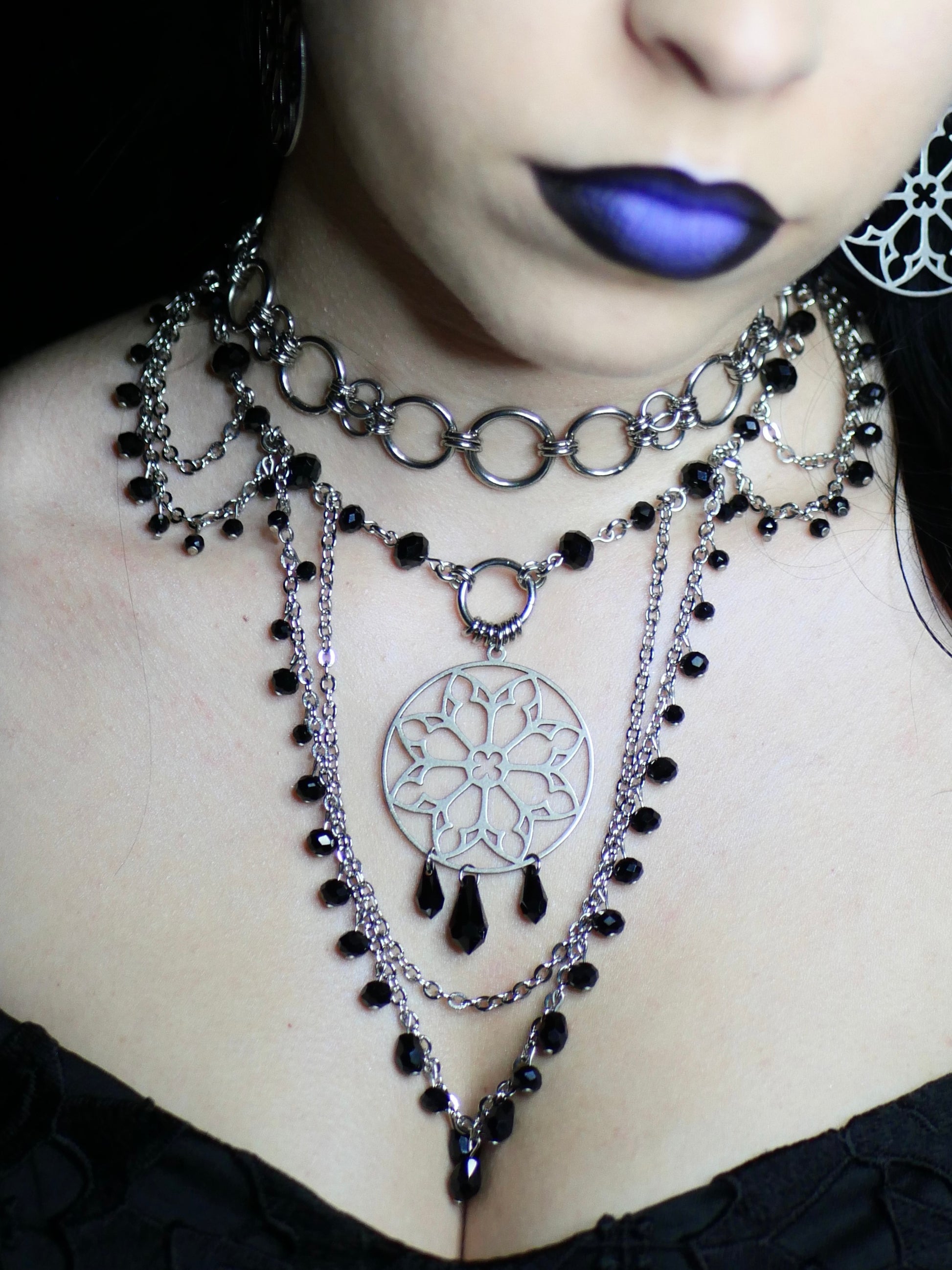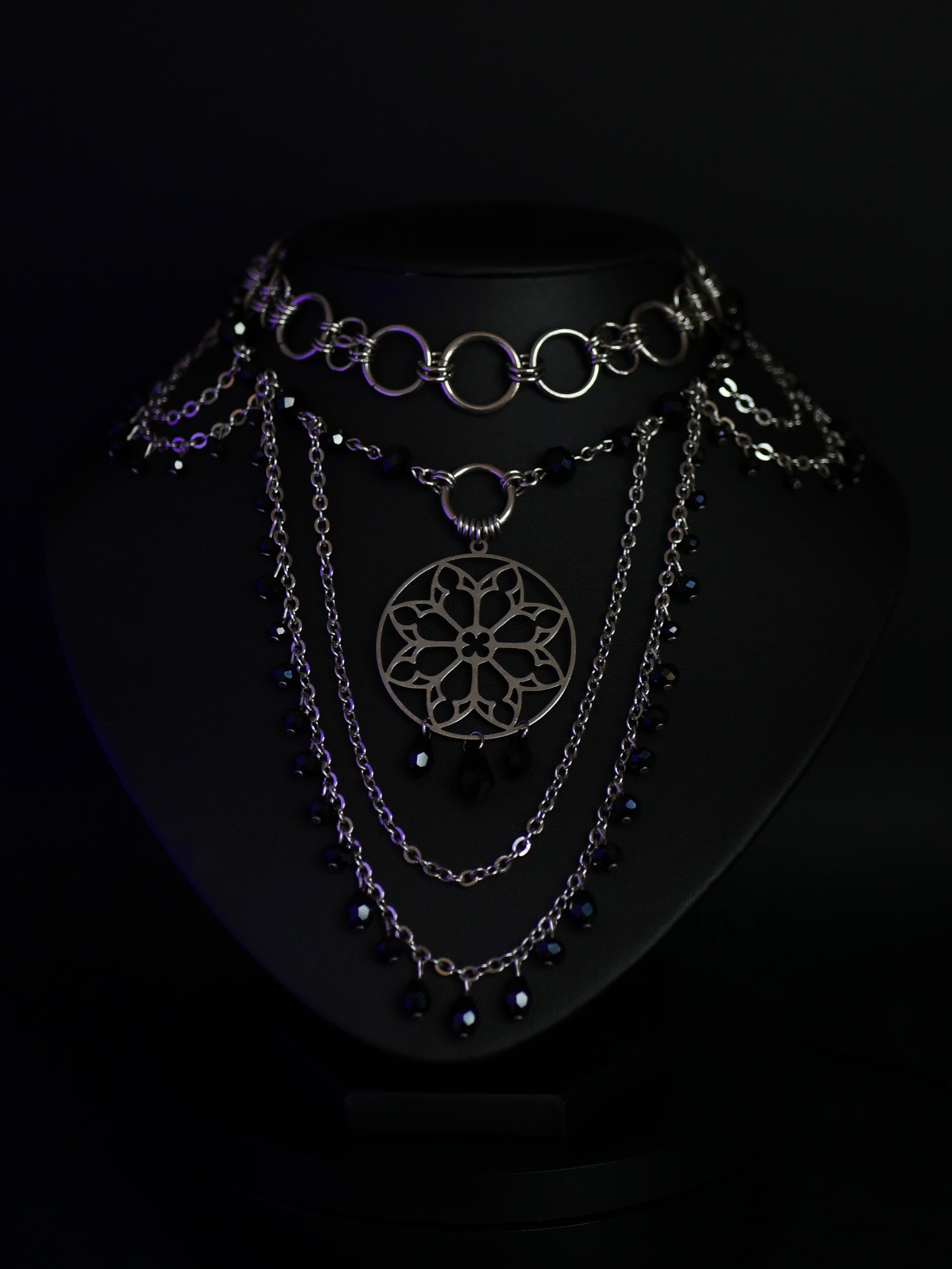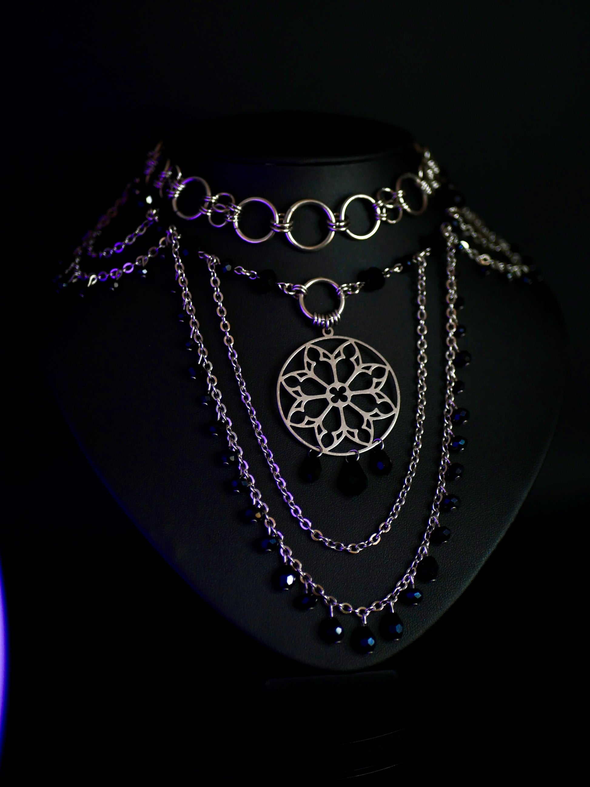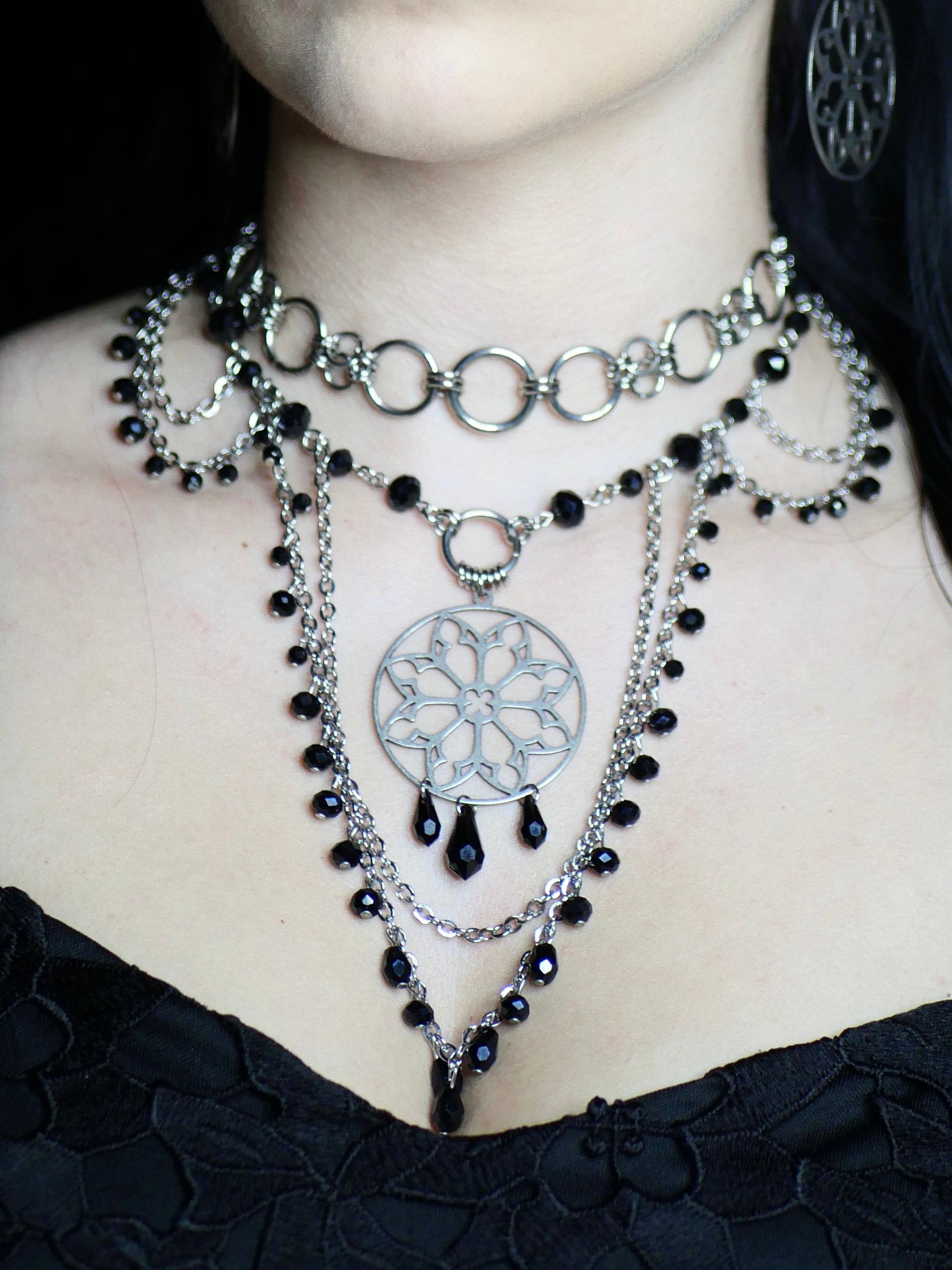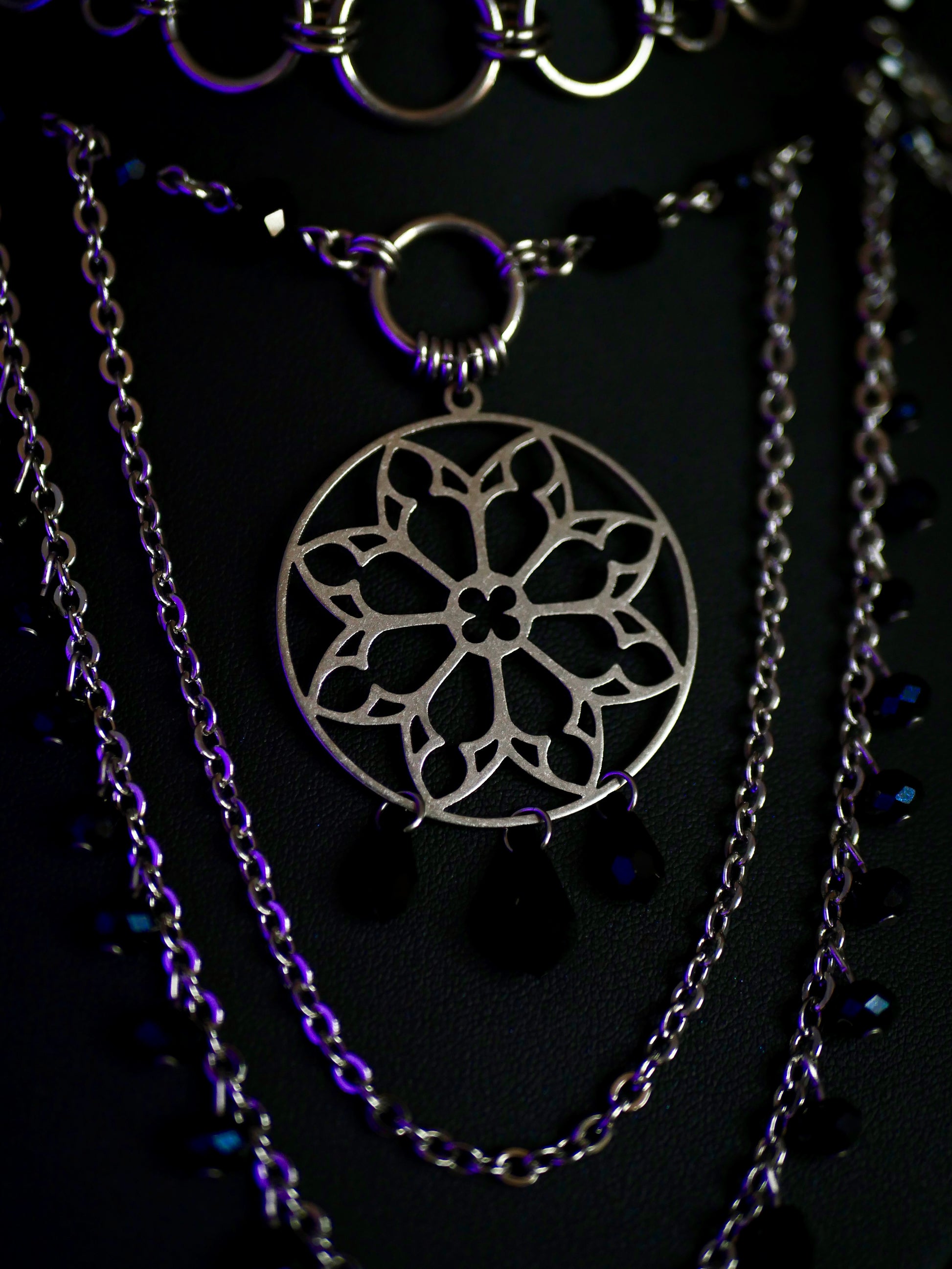 Orné d’un pendentif rosace en acier inoxydable et de perles noires en verre.