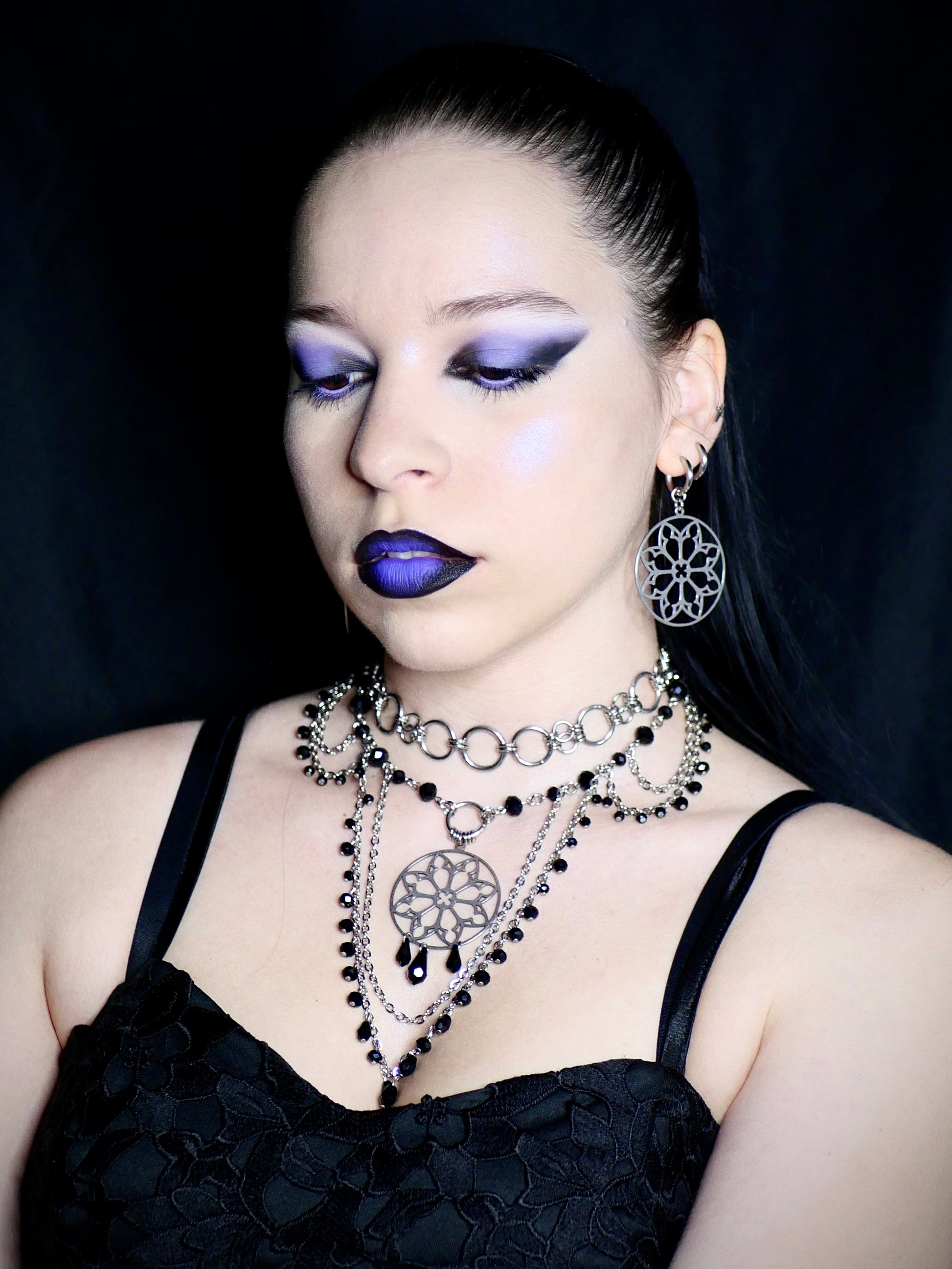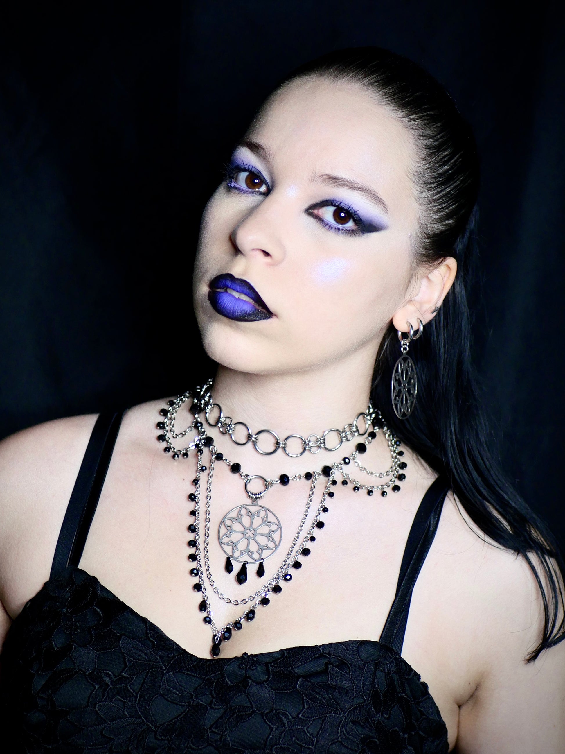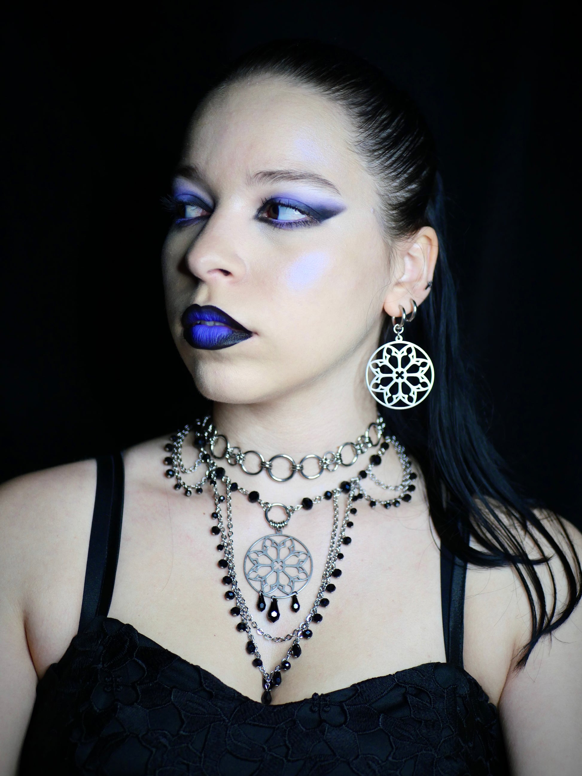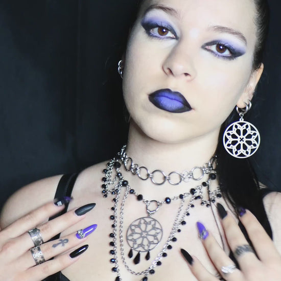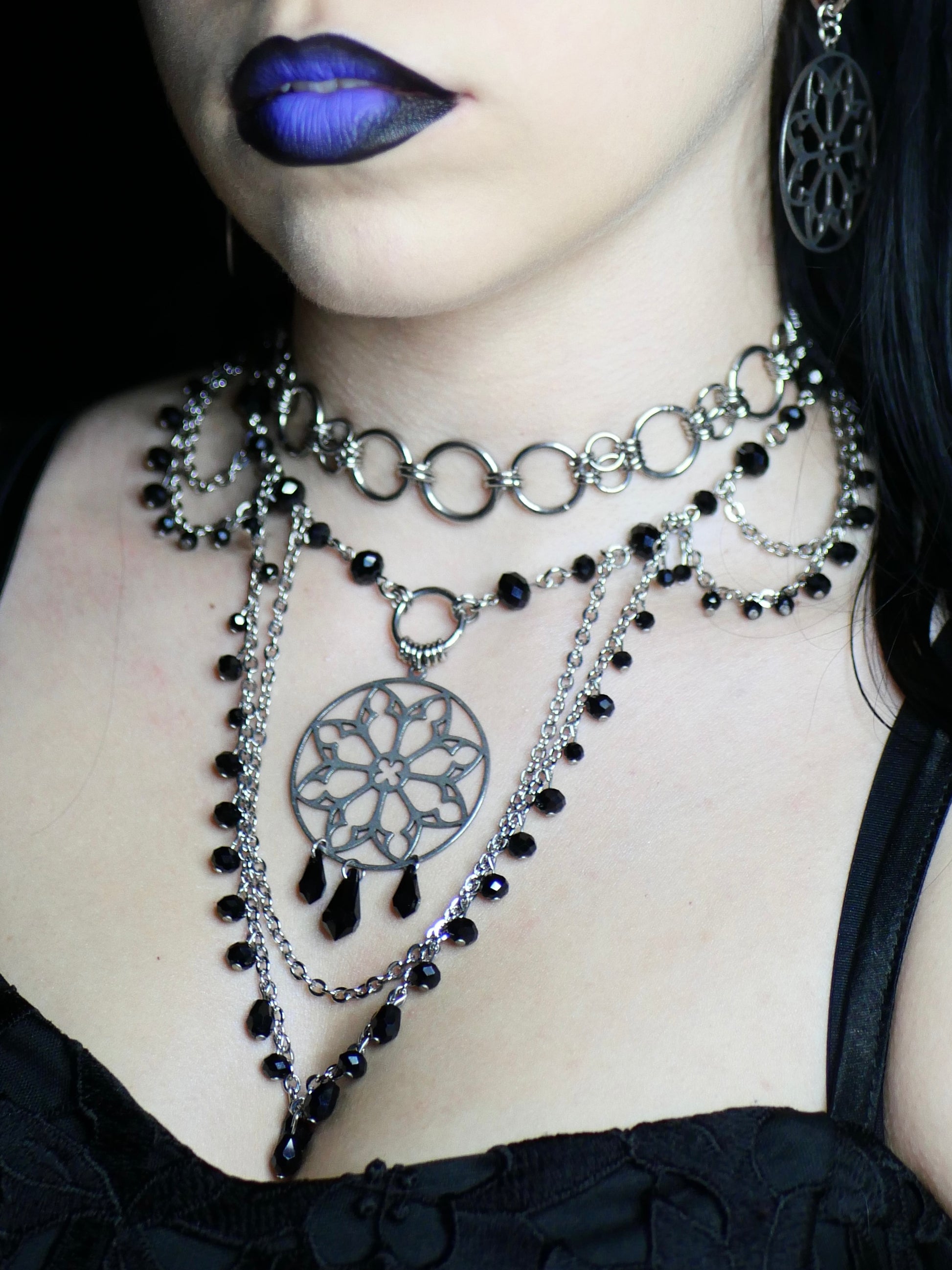 Orné d’un pendentif rosace en acier inoxydable et de perles noires en verre.