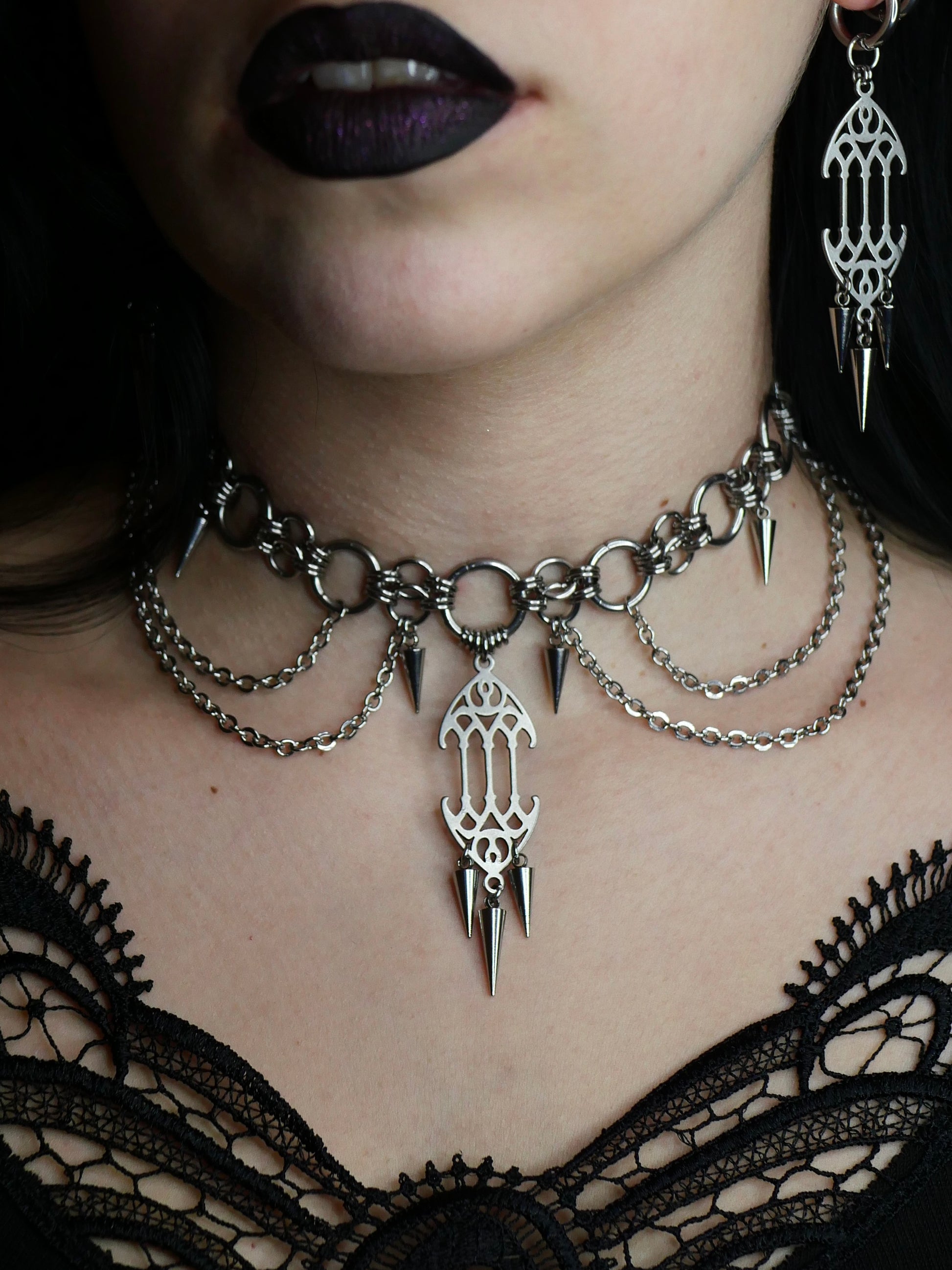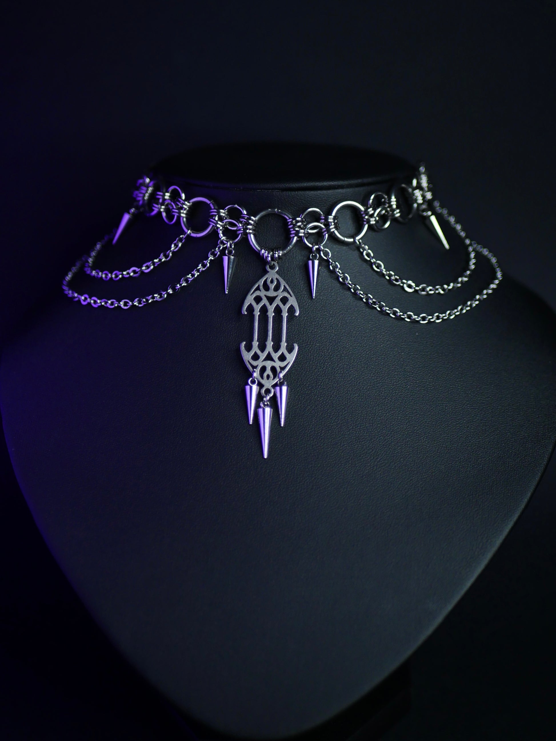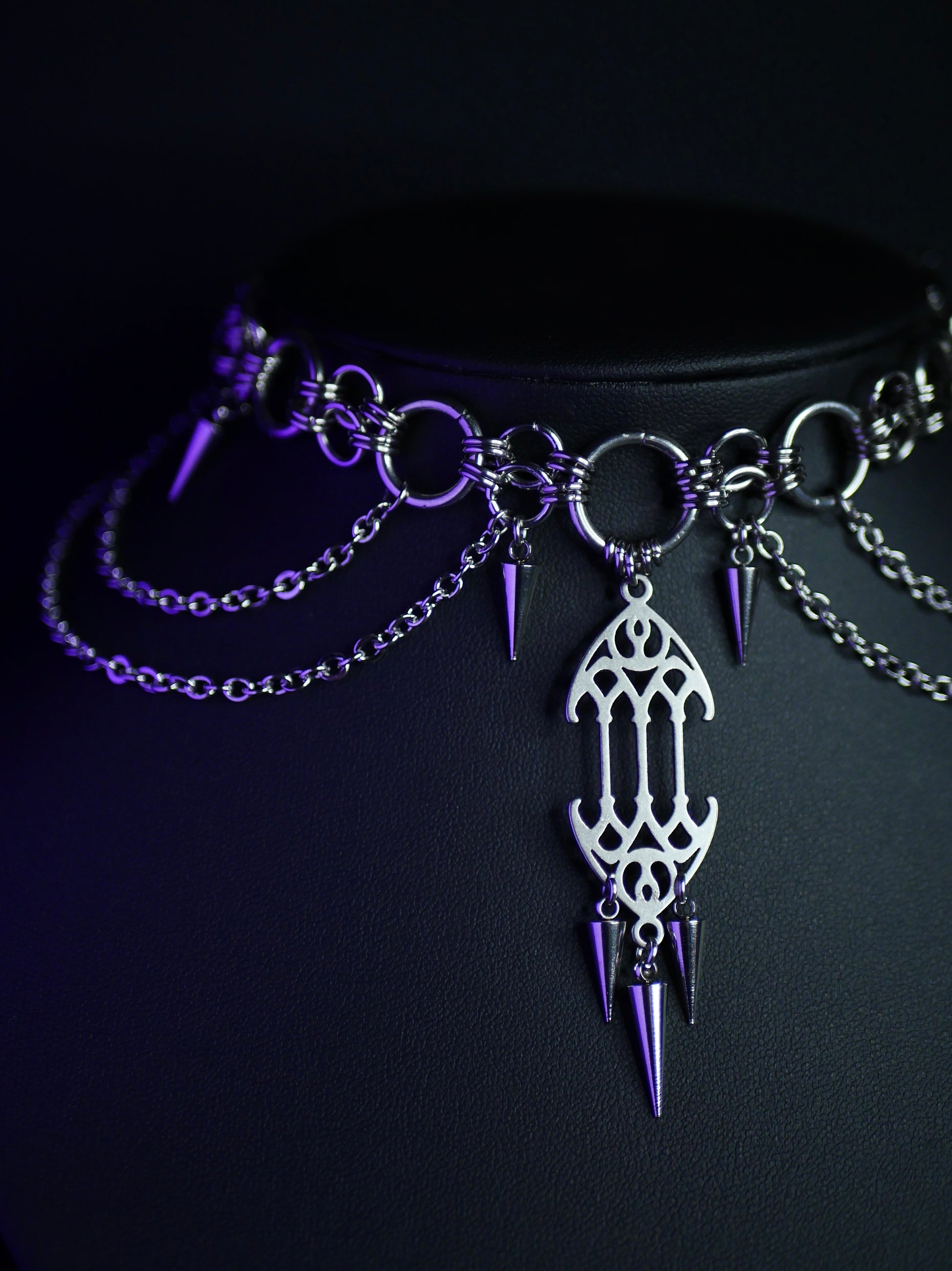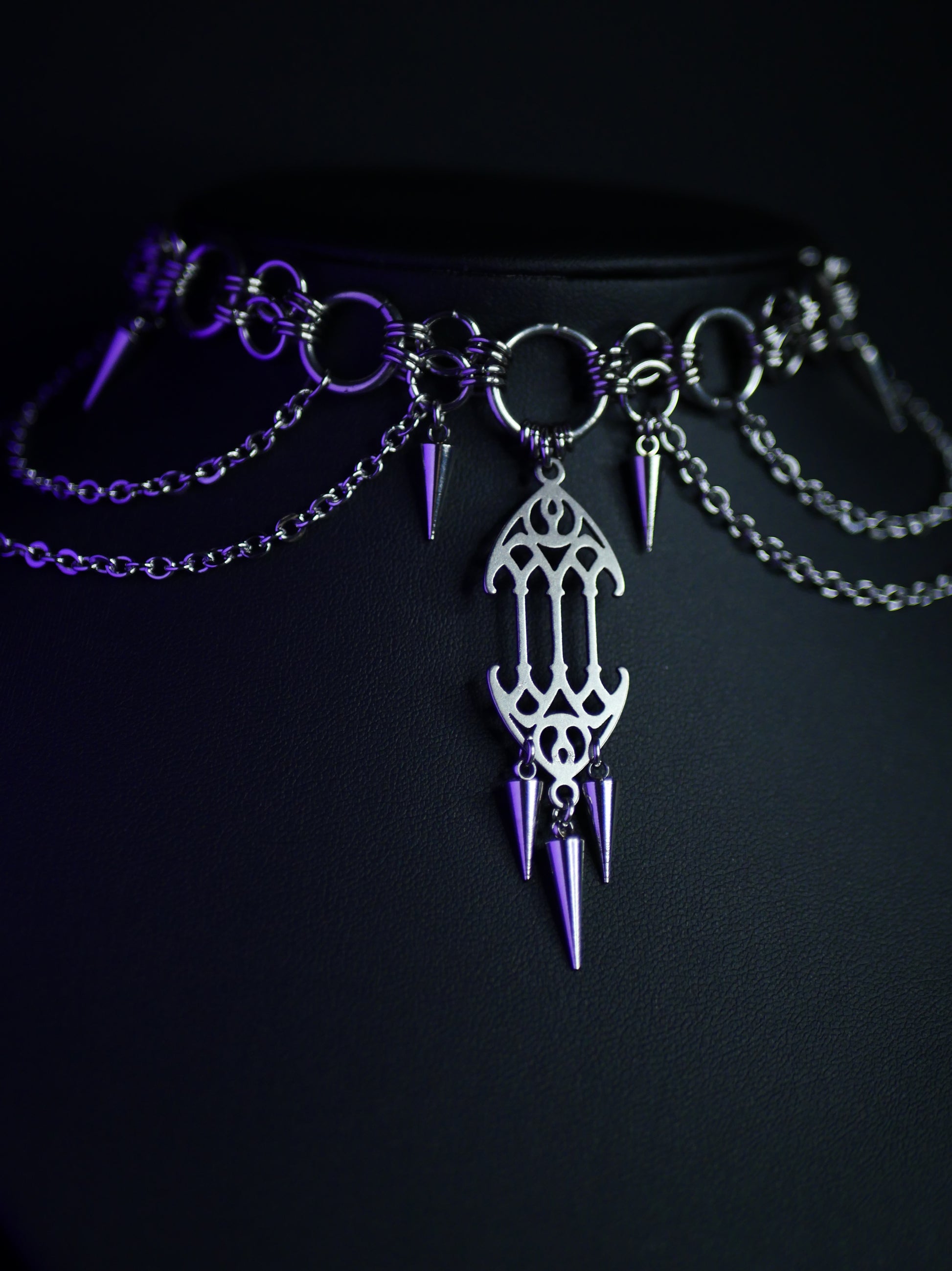 Orné d’un pendentif vitrail, de pics et de maillons en acier inoxydable.