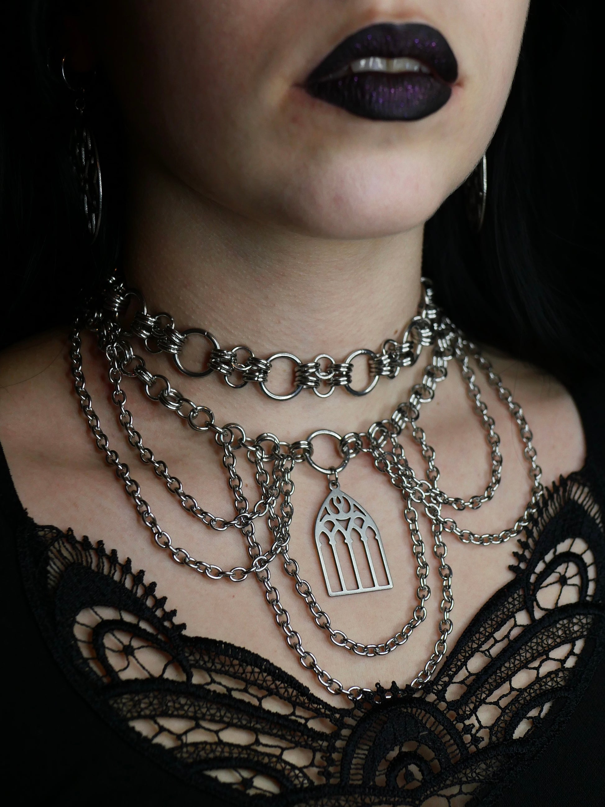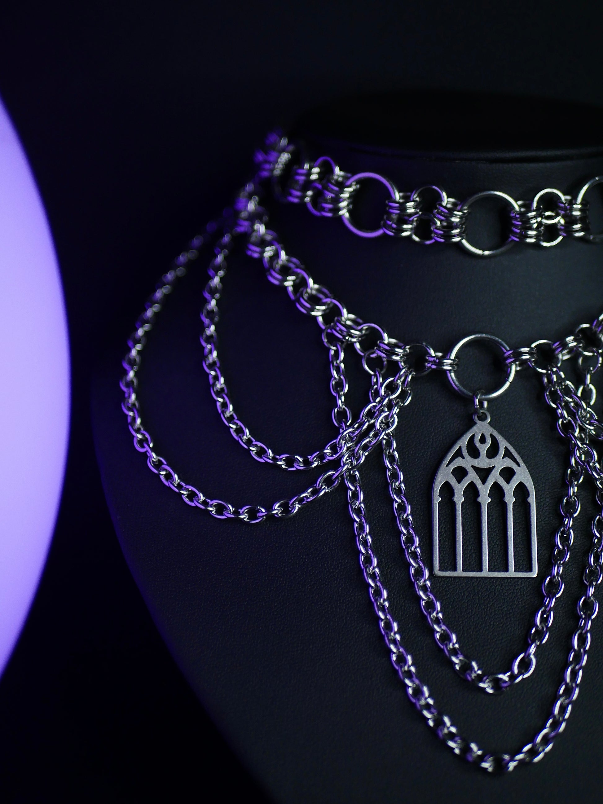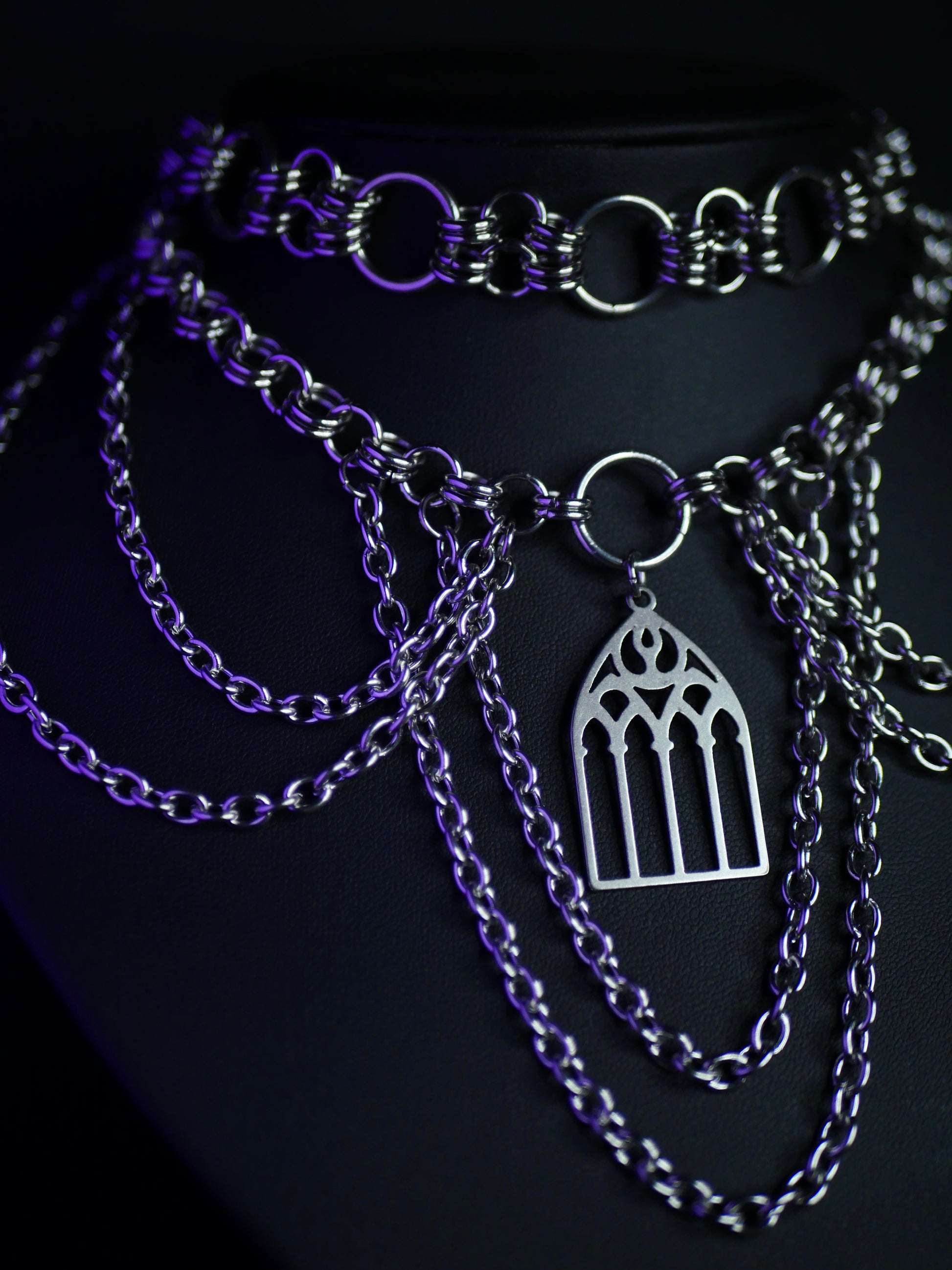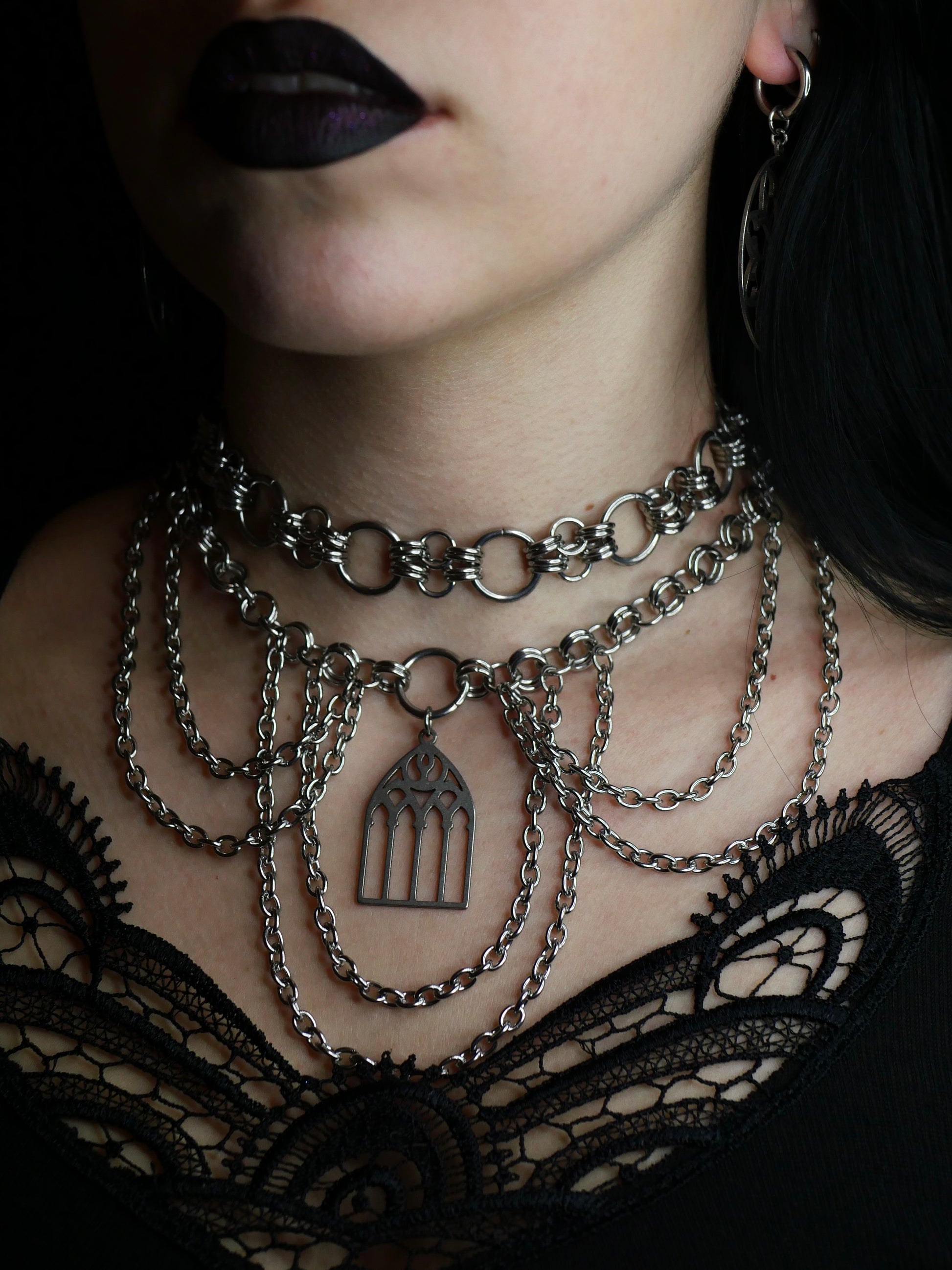 Orné d’un pendentif vitrail et de maillons en acier inoxydable.