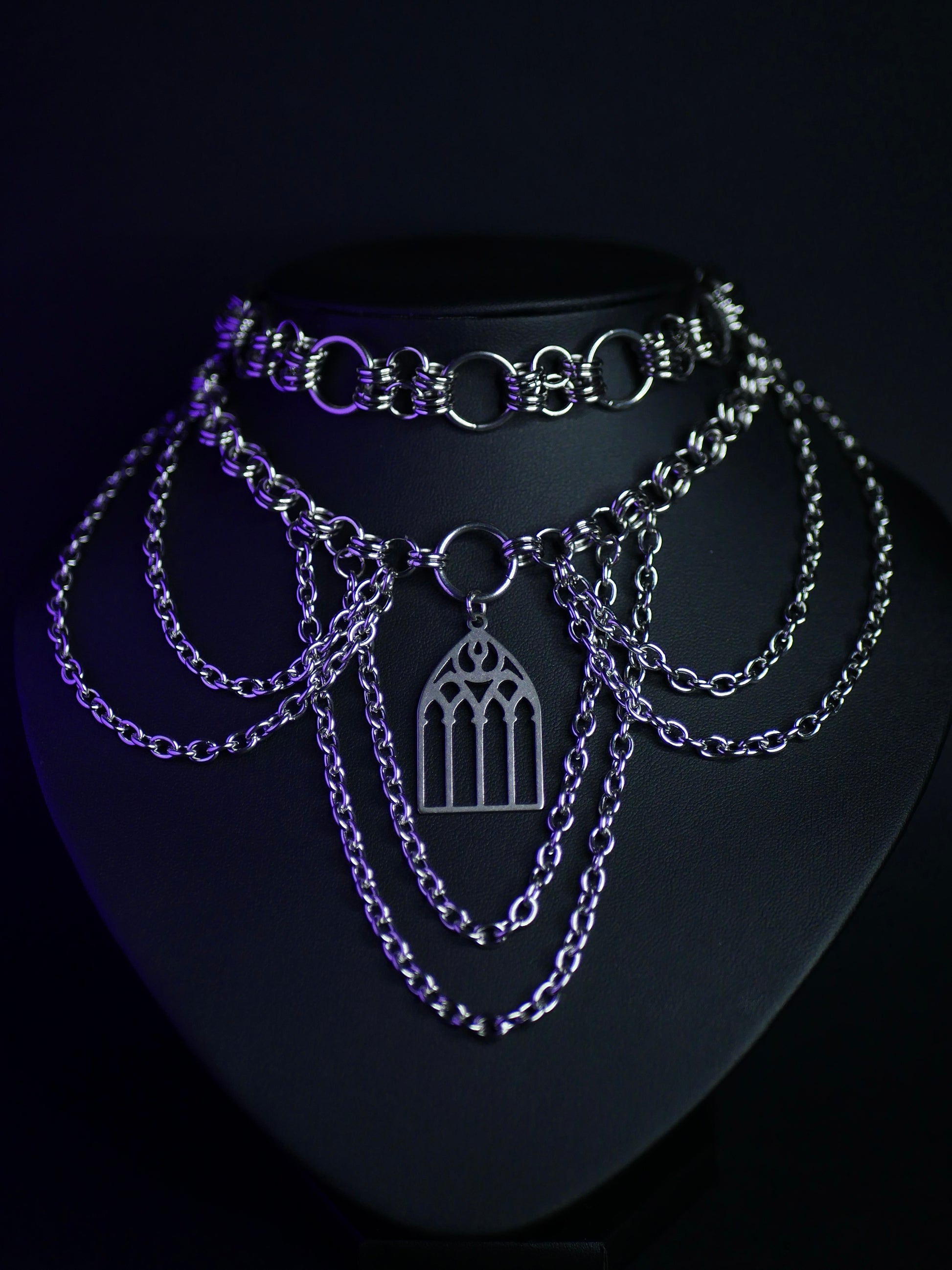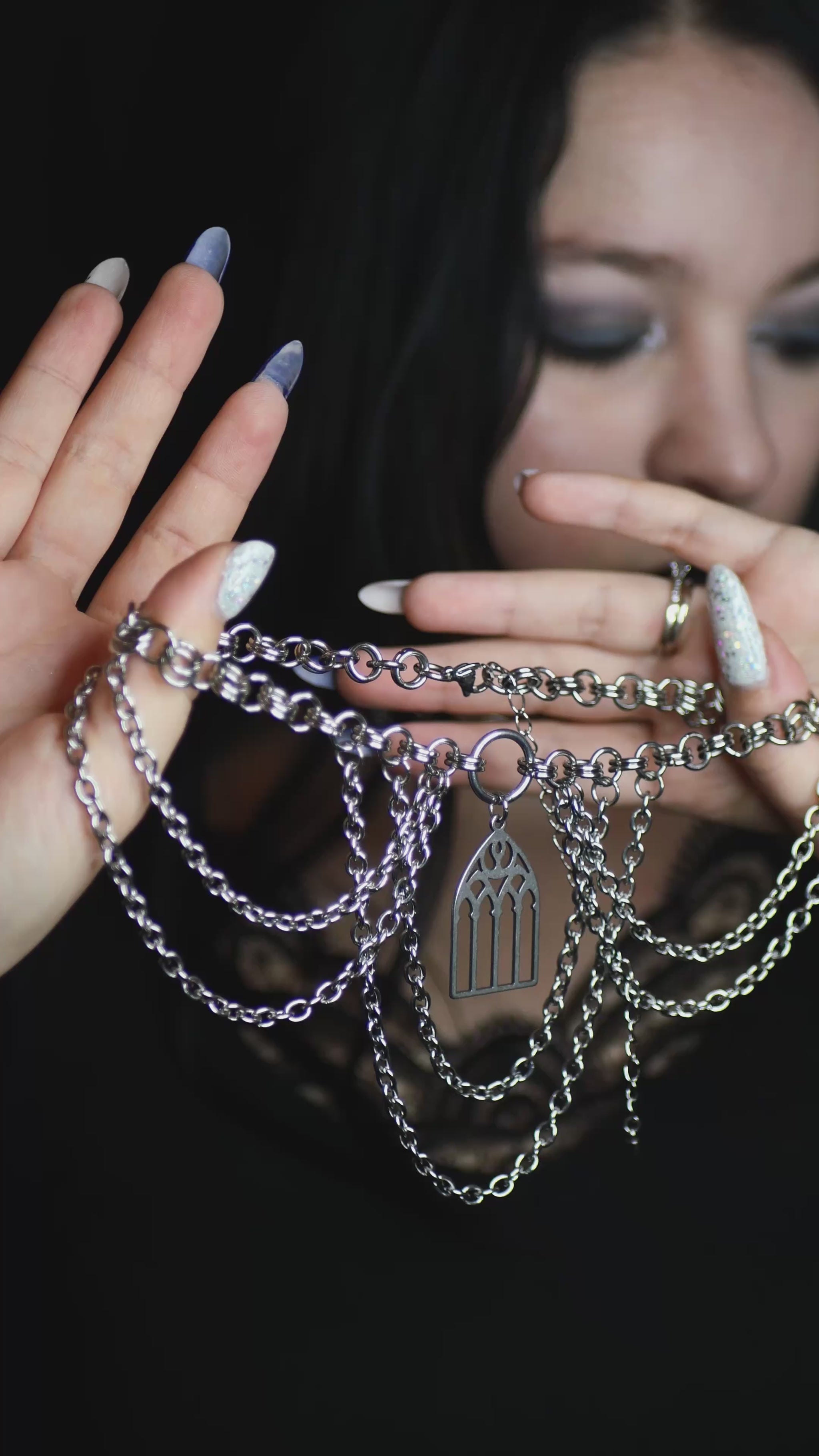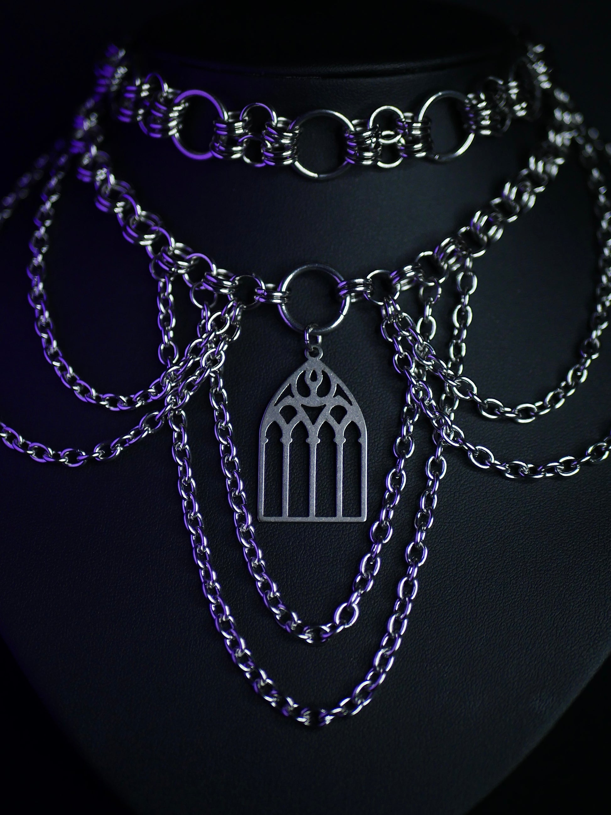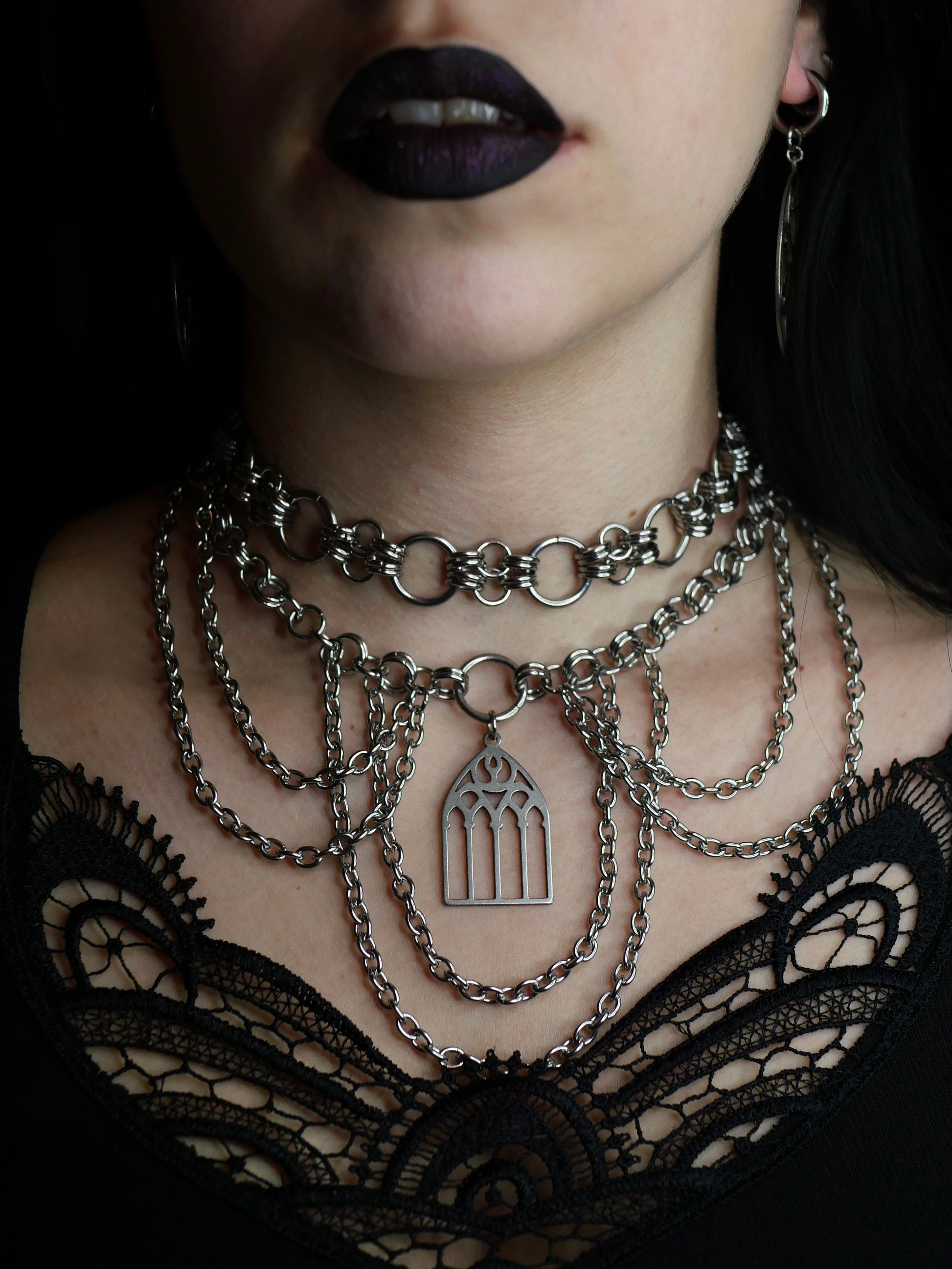 Orné d’un pendentif vitrail et de maillons en acier inoxydable.