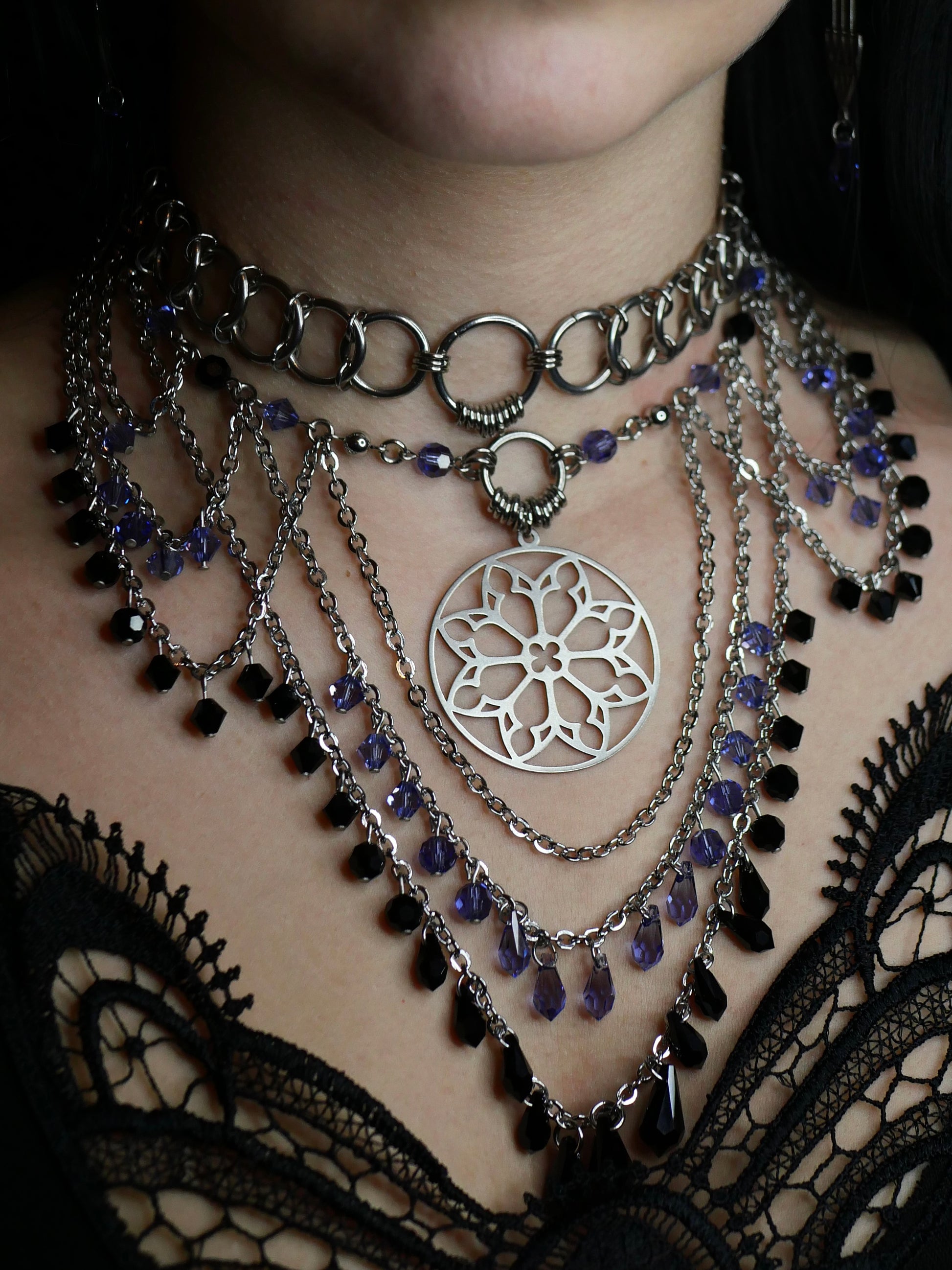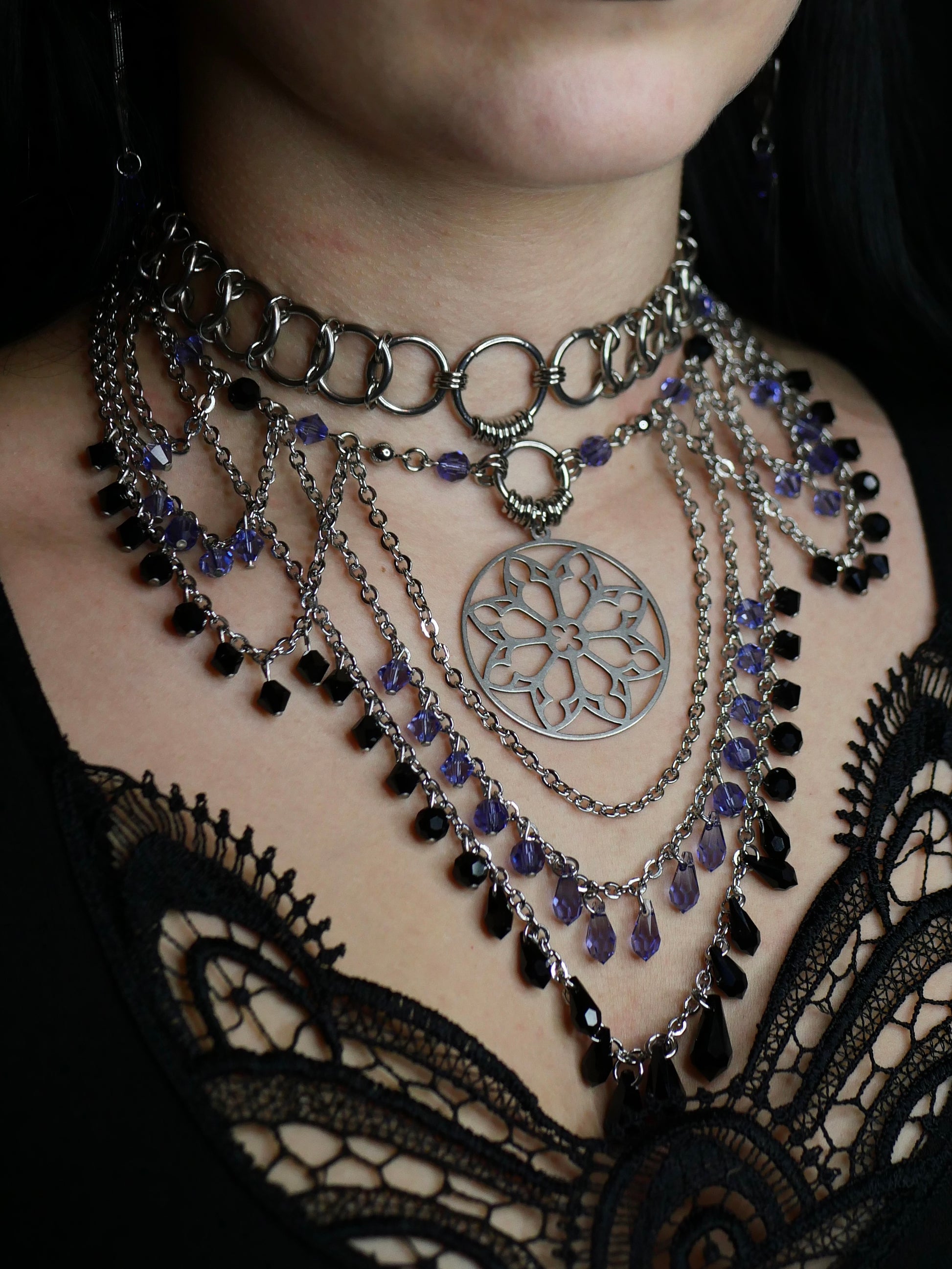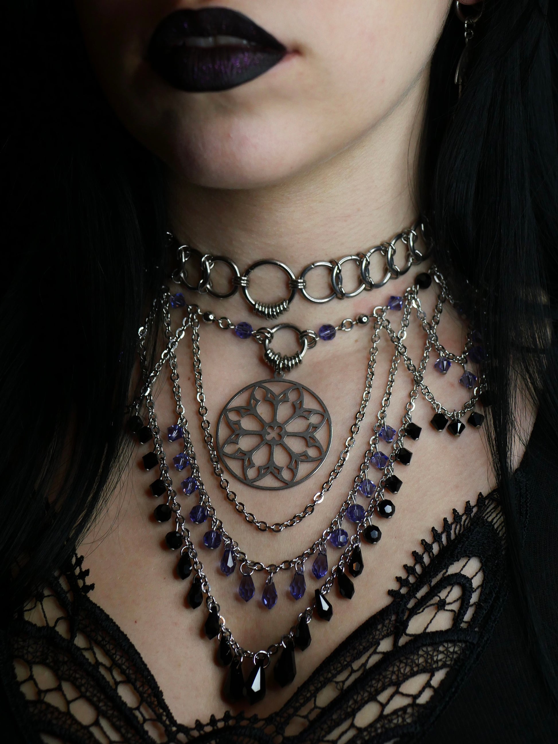 Orné d’un pendentif rosace en acier inoxydable, de perles violettes et noires en cristal.