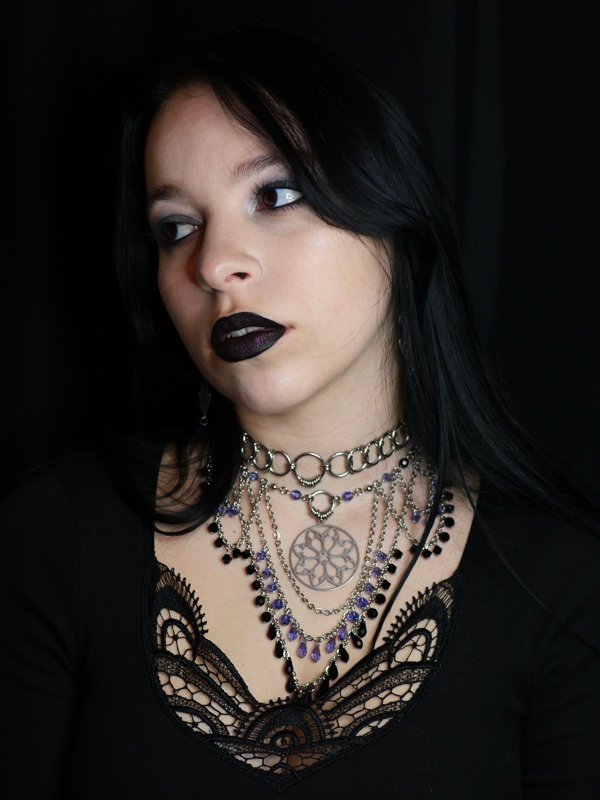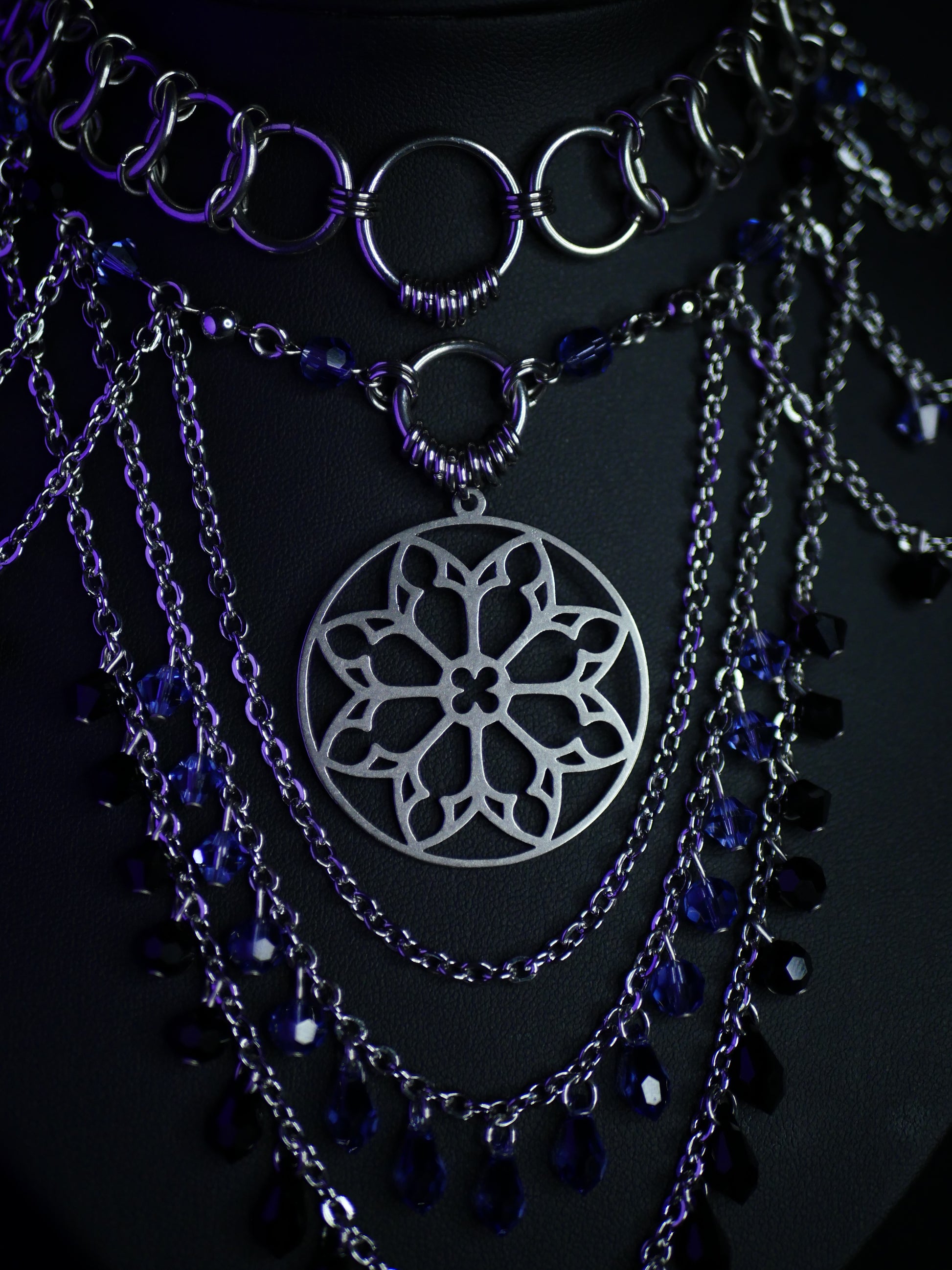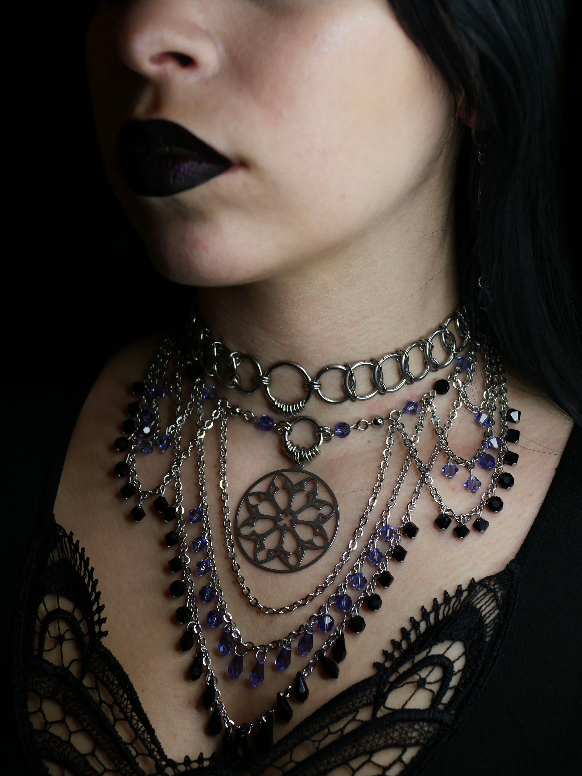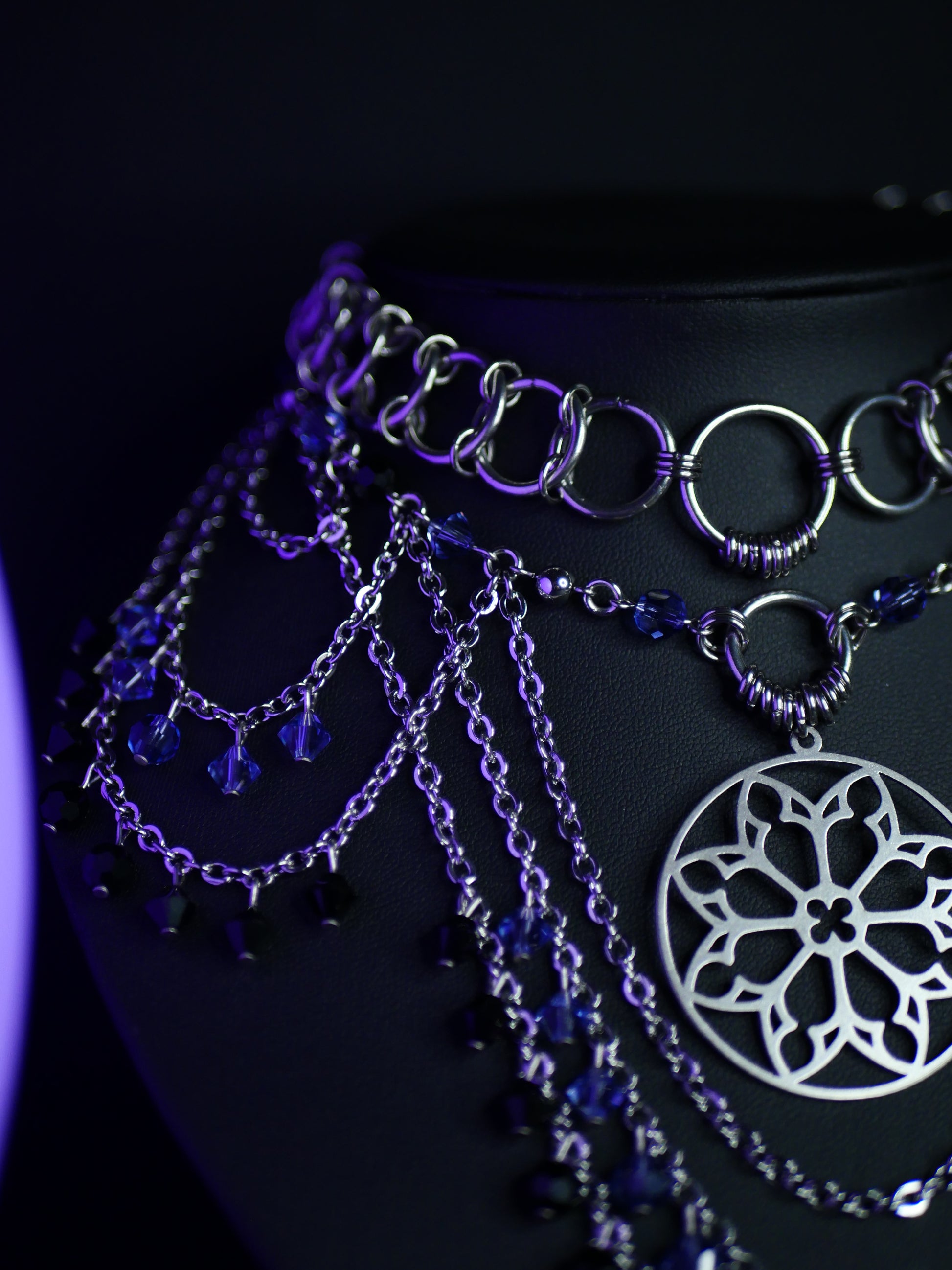 Orné d’un pendentif rosace en acier inoxydable, de perles violettes et noires en cristal.