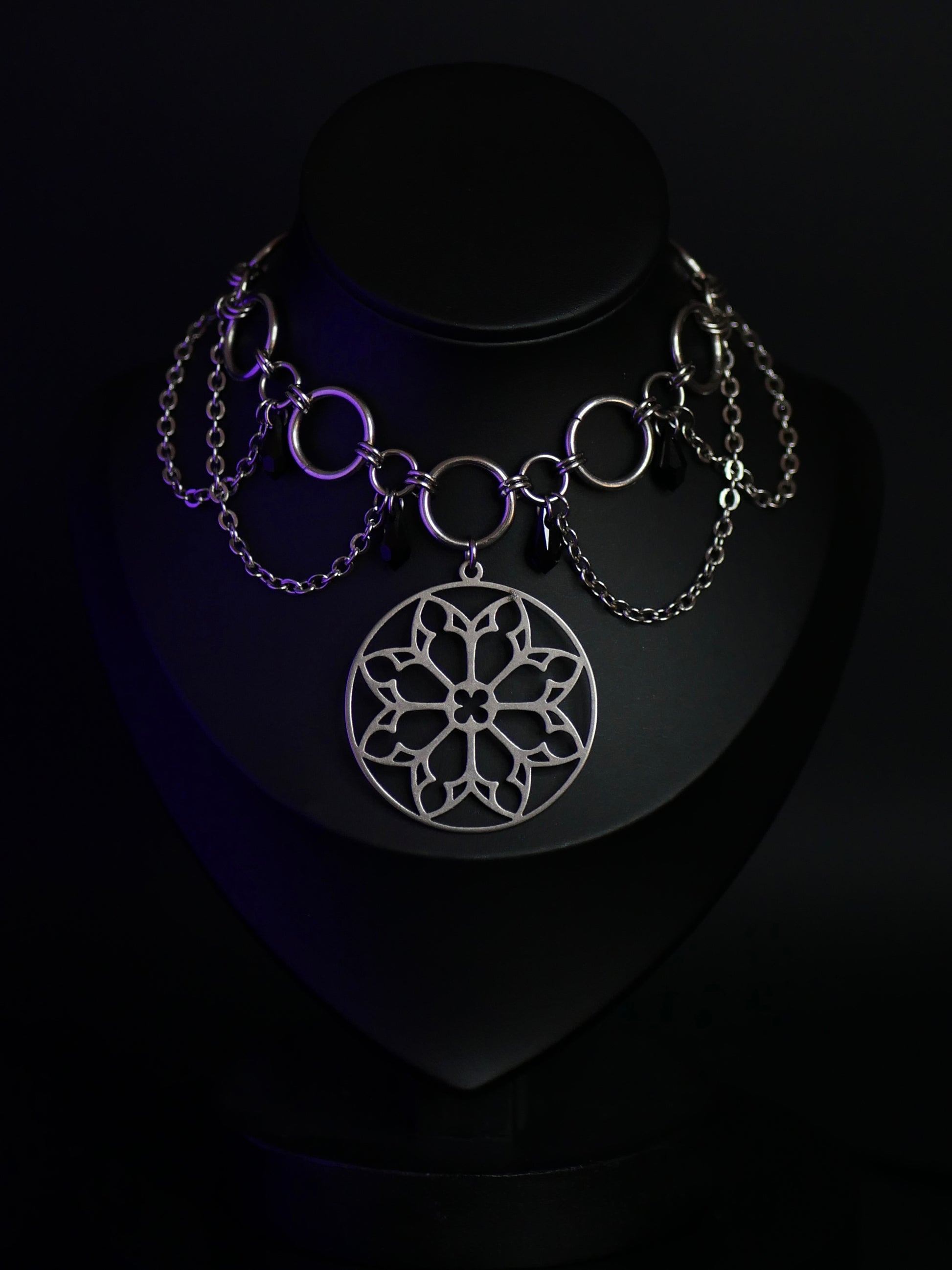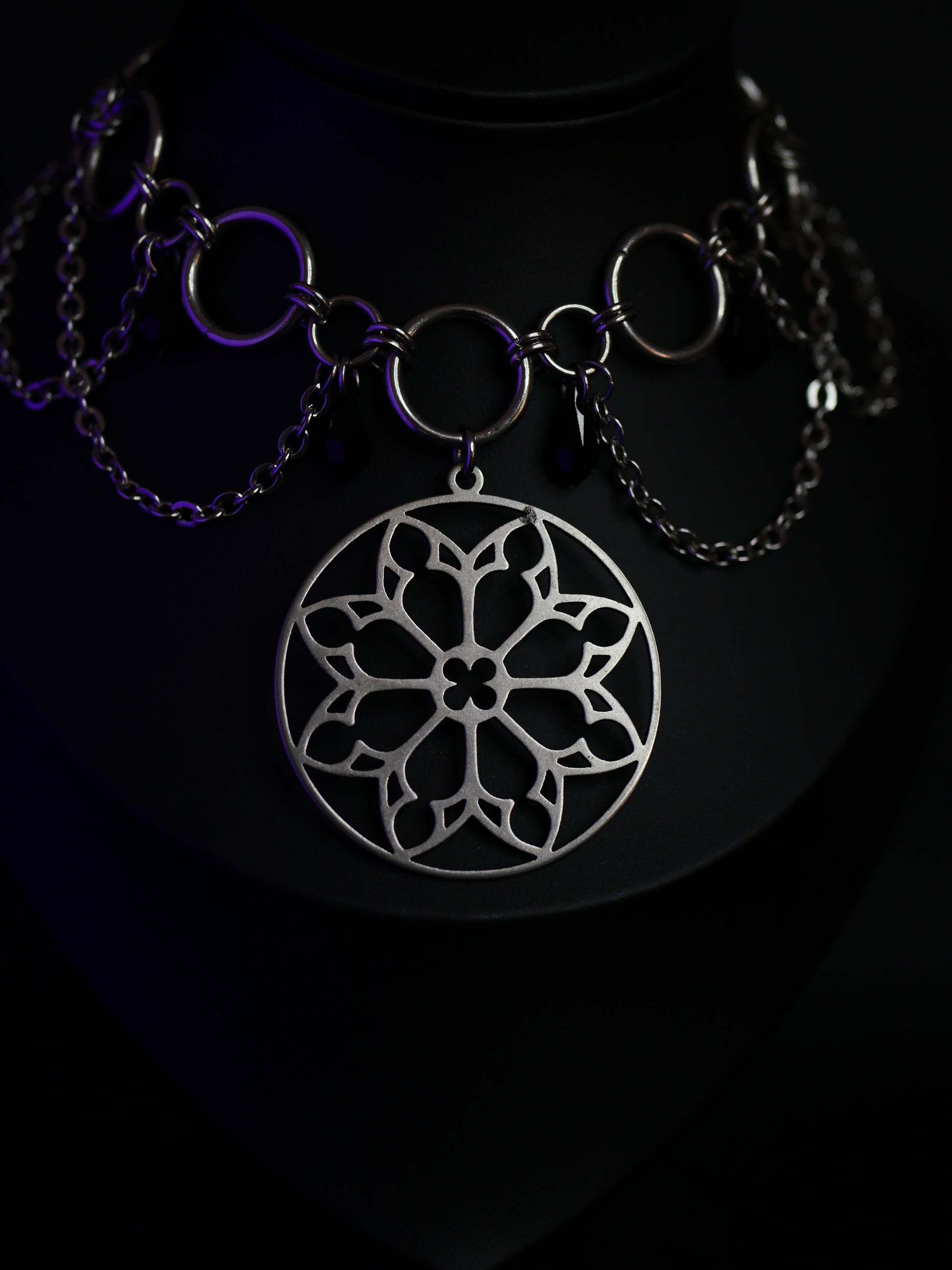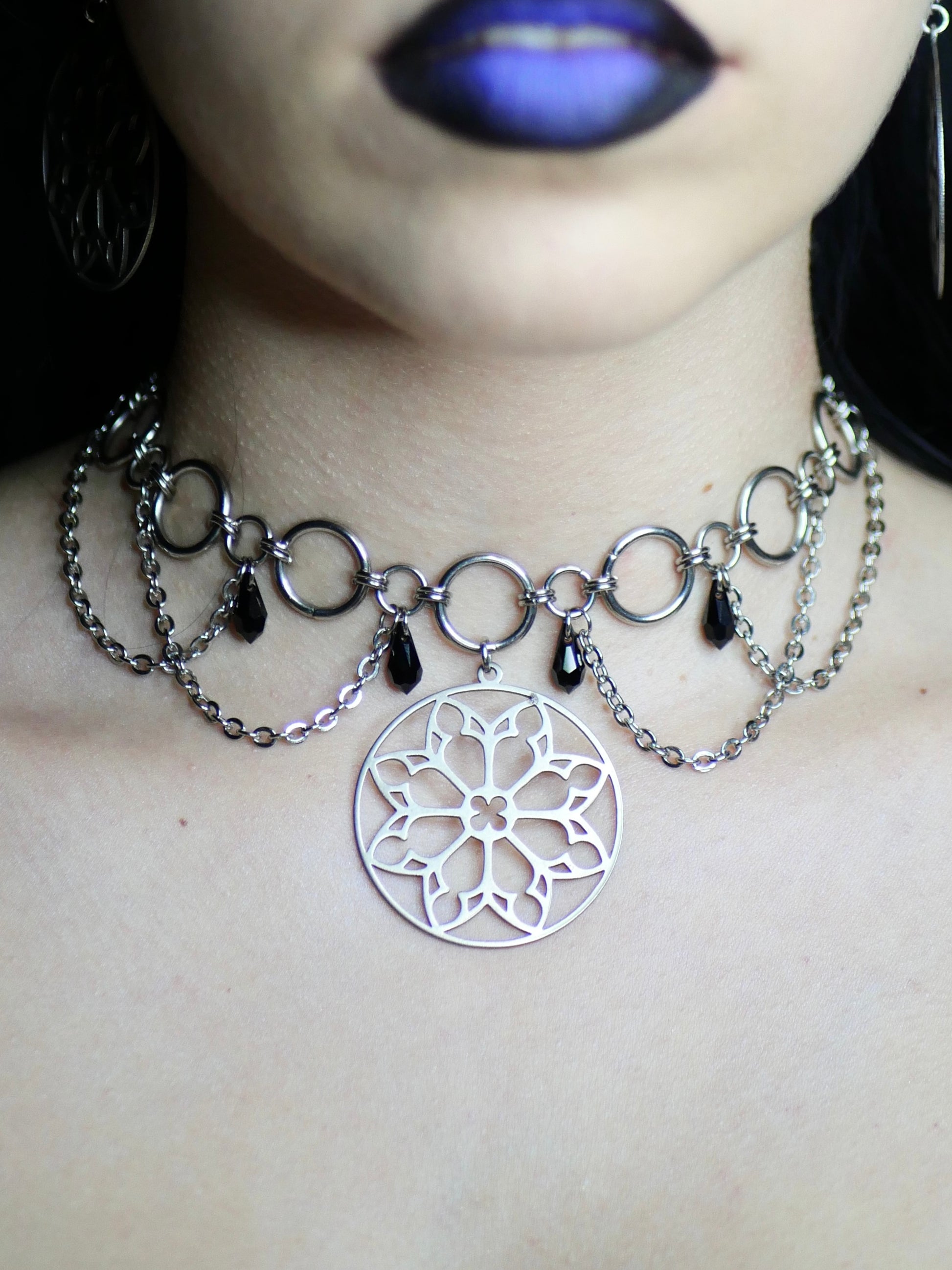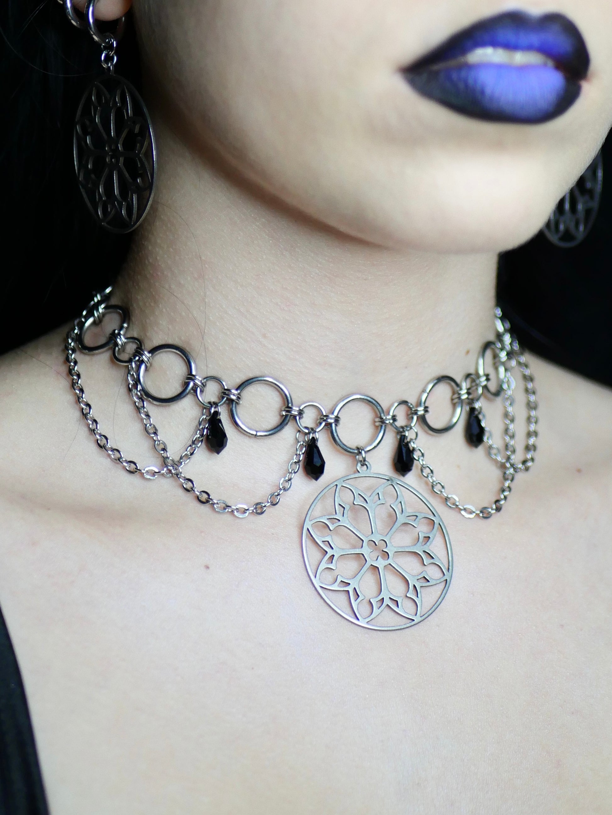 Orné d’un pendentif rosace, de maillons d’acier inoxydable et de perles noires en cristal.