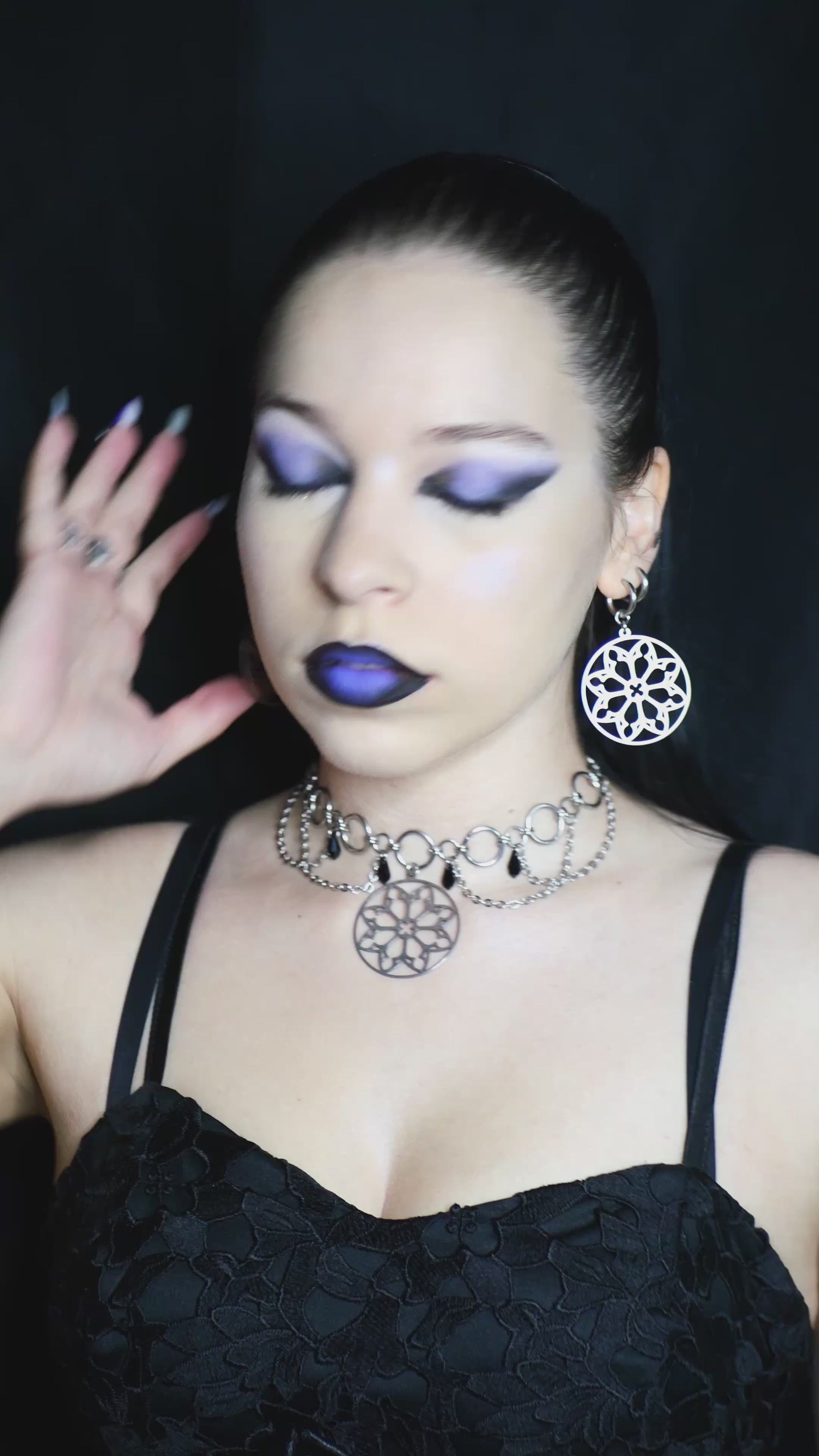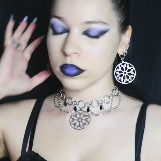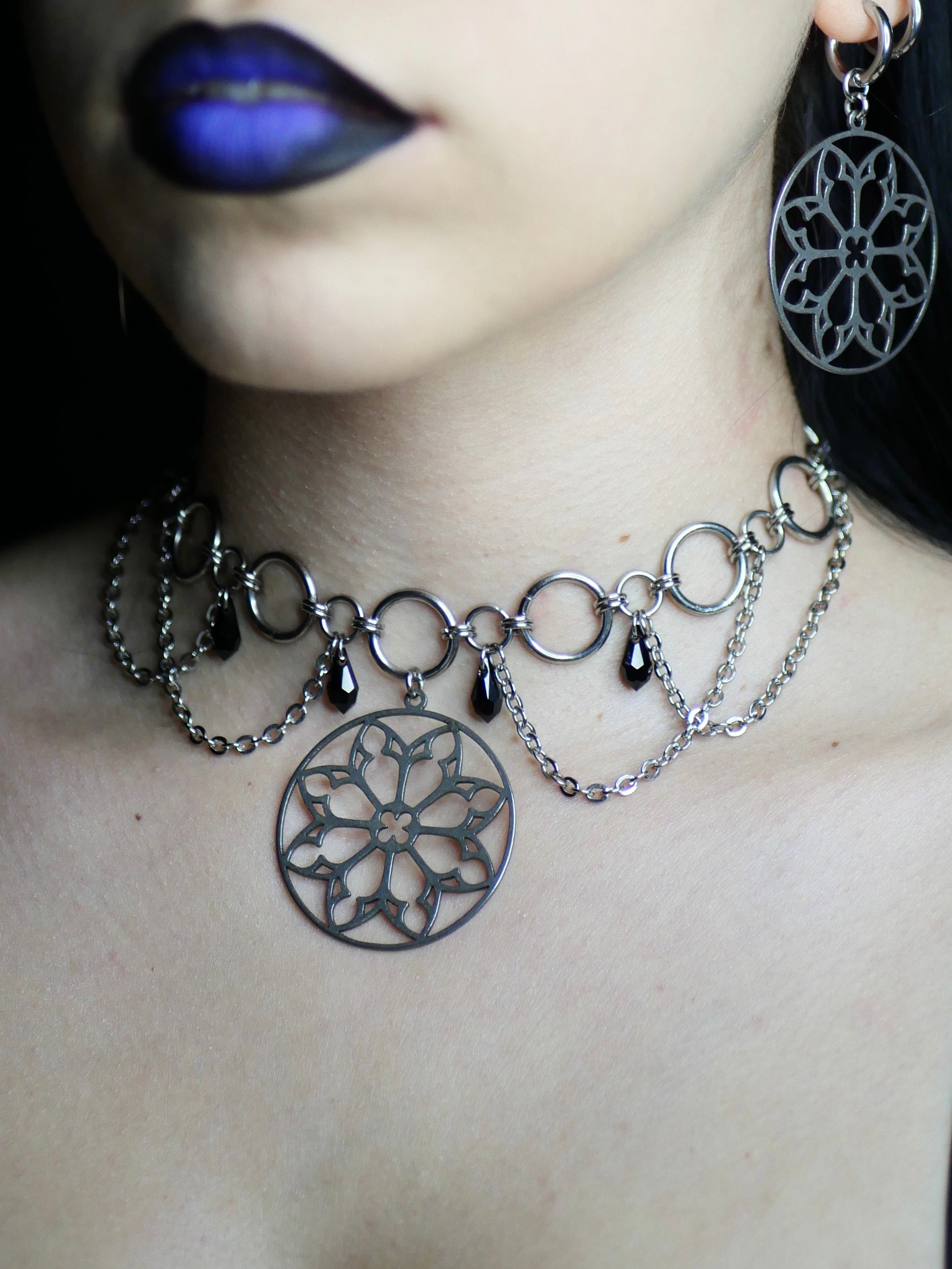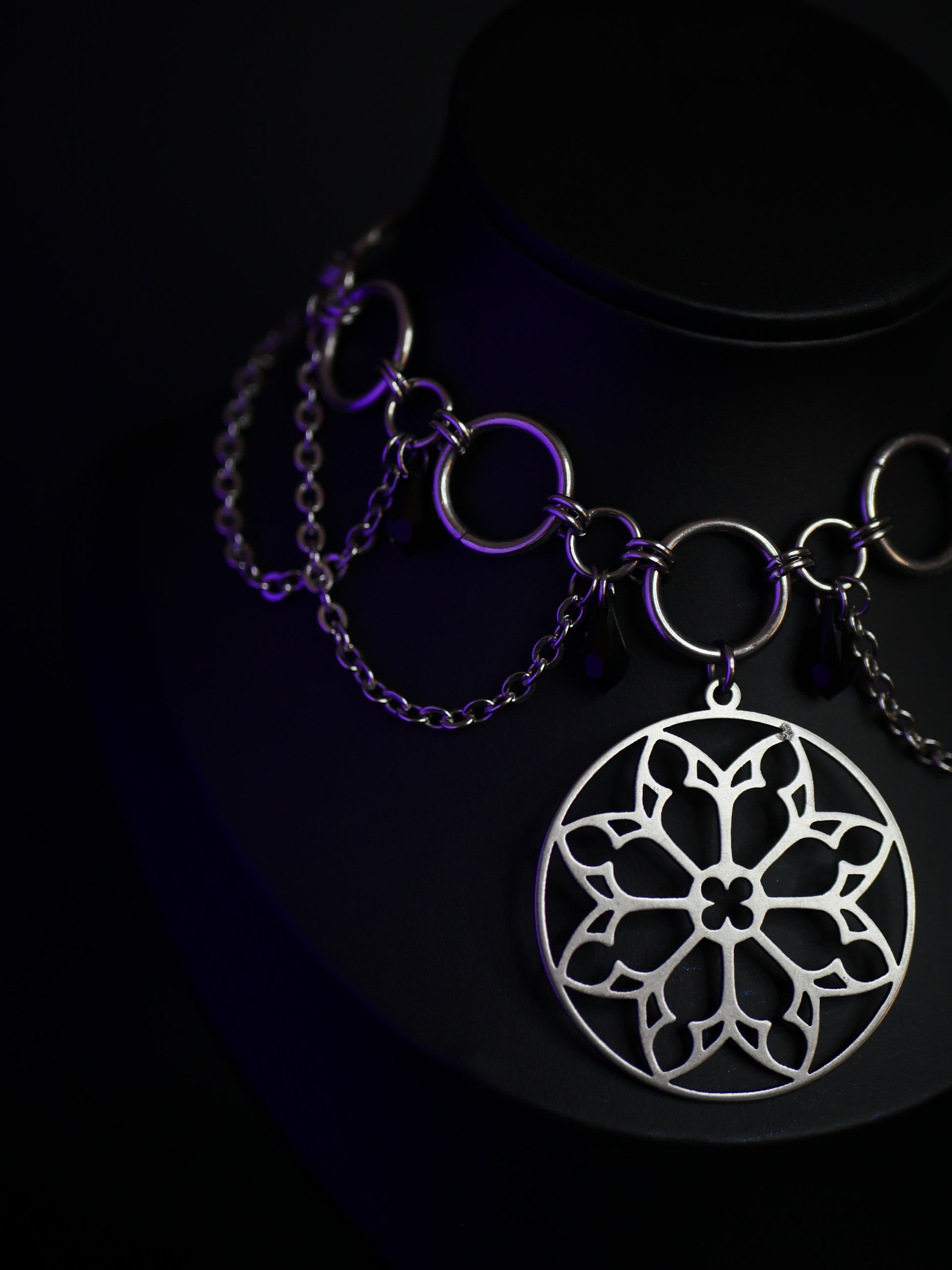 Orné d’un pendentif rosace, de maillons d’acier inoxydable et de perles noires en cristal.