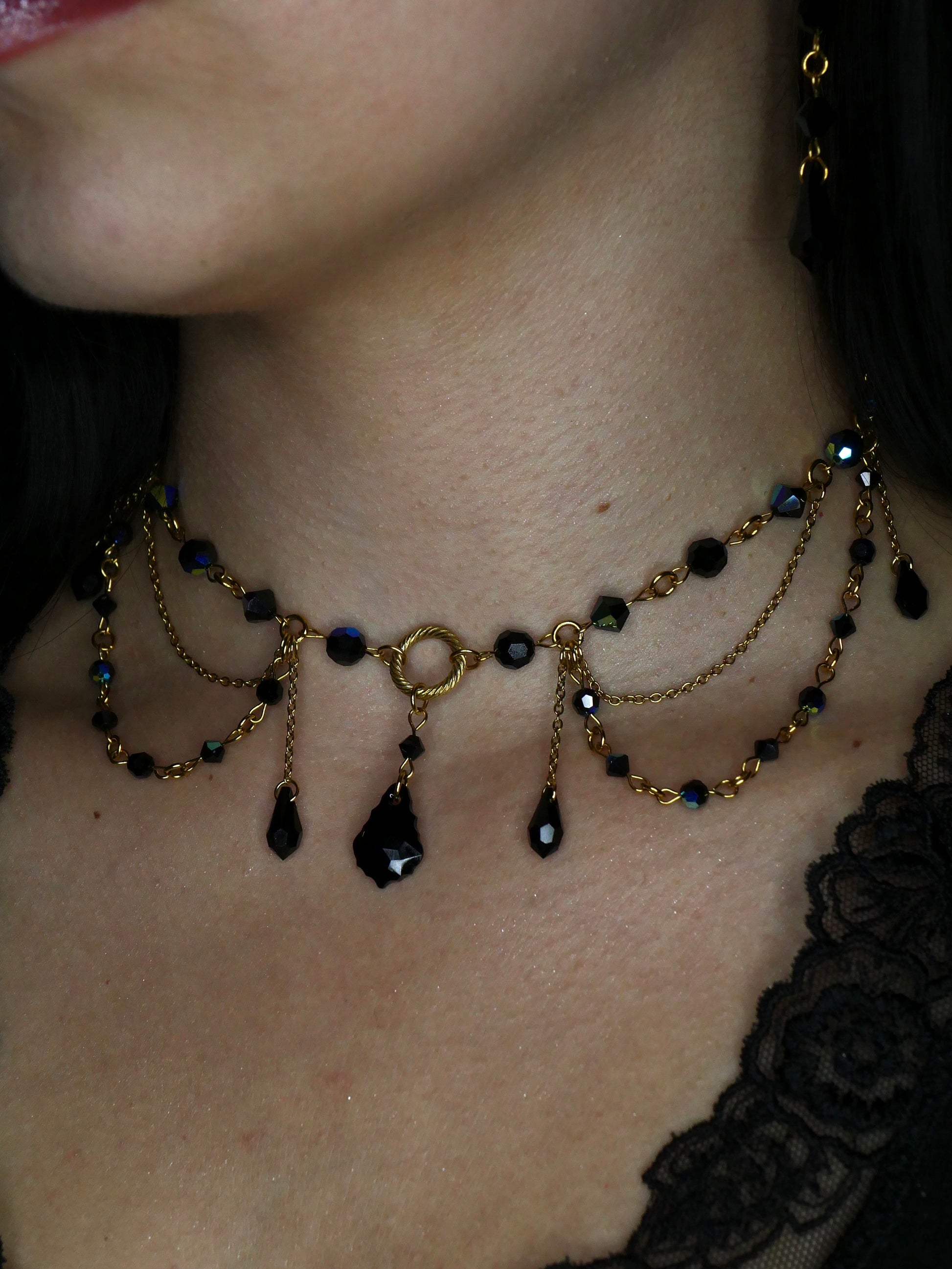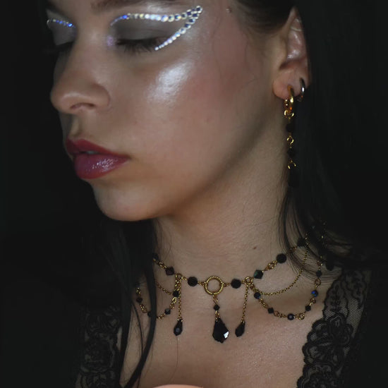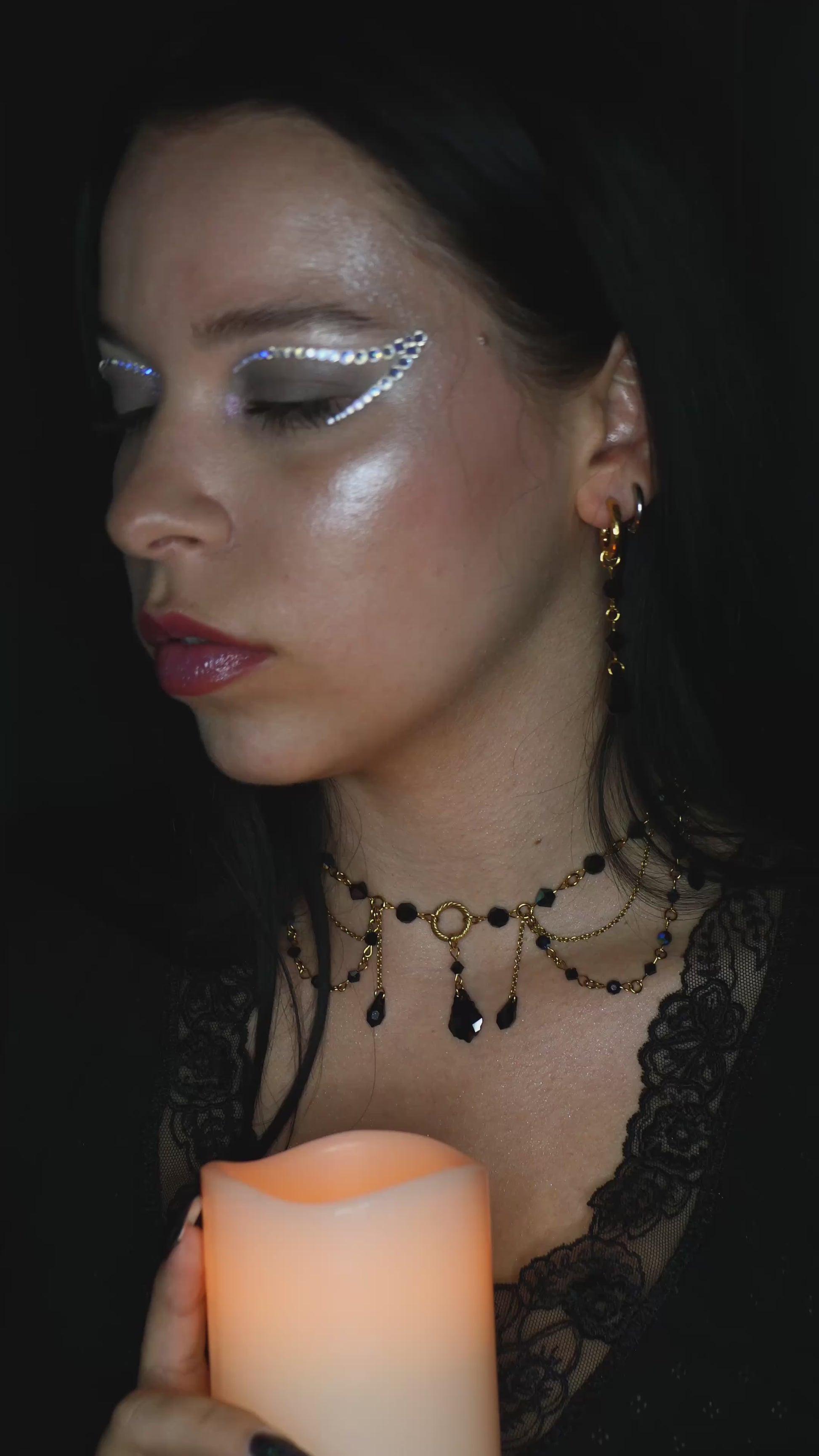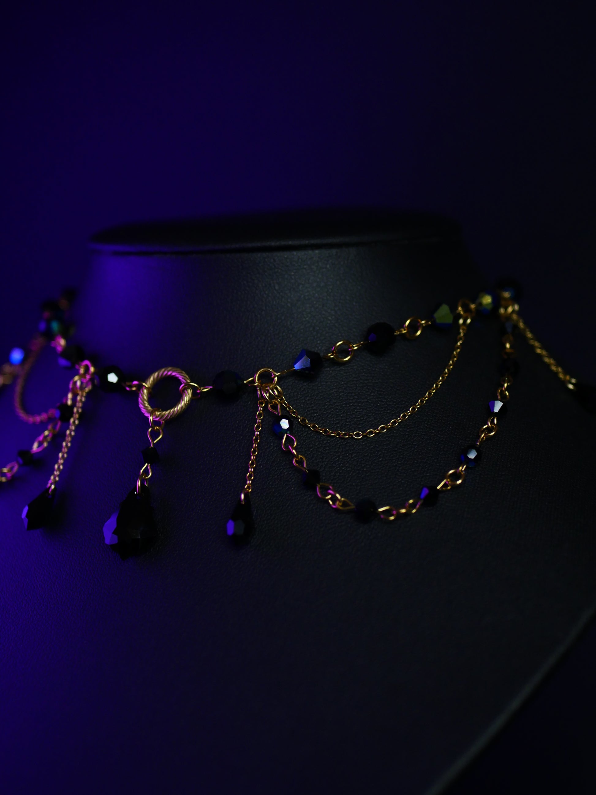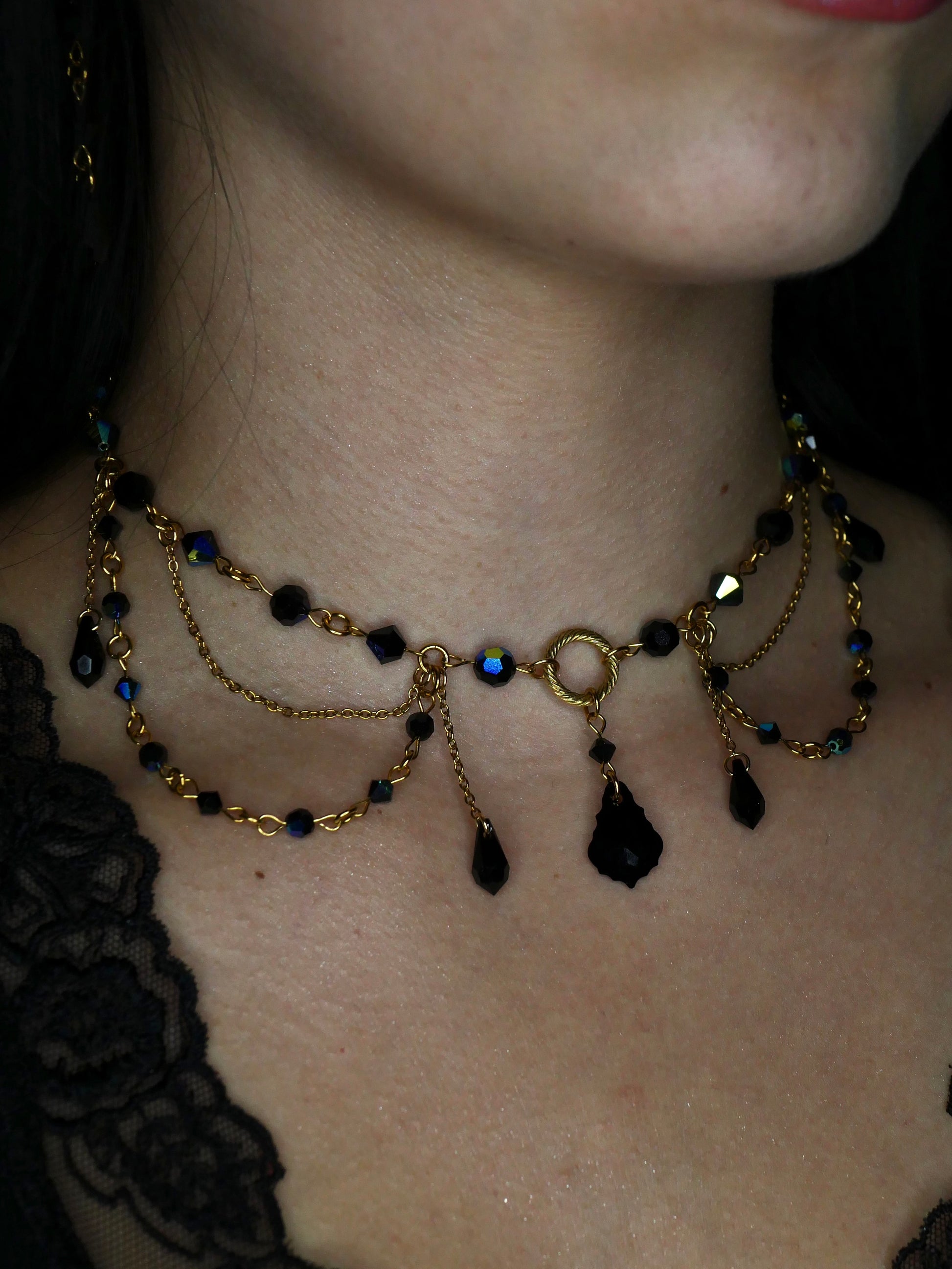 Une obscurité vibrante d’éclats dorés. Les perles noires aux reflets bleu-vert se parent d’une lueur solaire, rappelant la mer embrasée au cœur de la nuit. Entièrement façonnés en cristal.