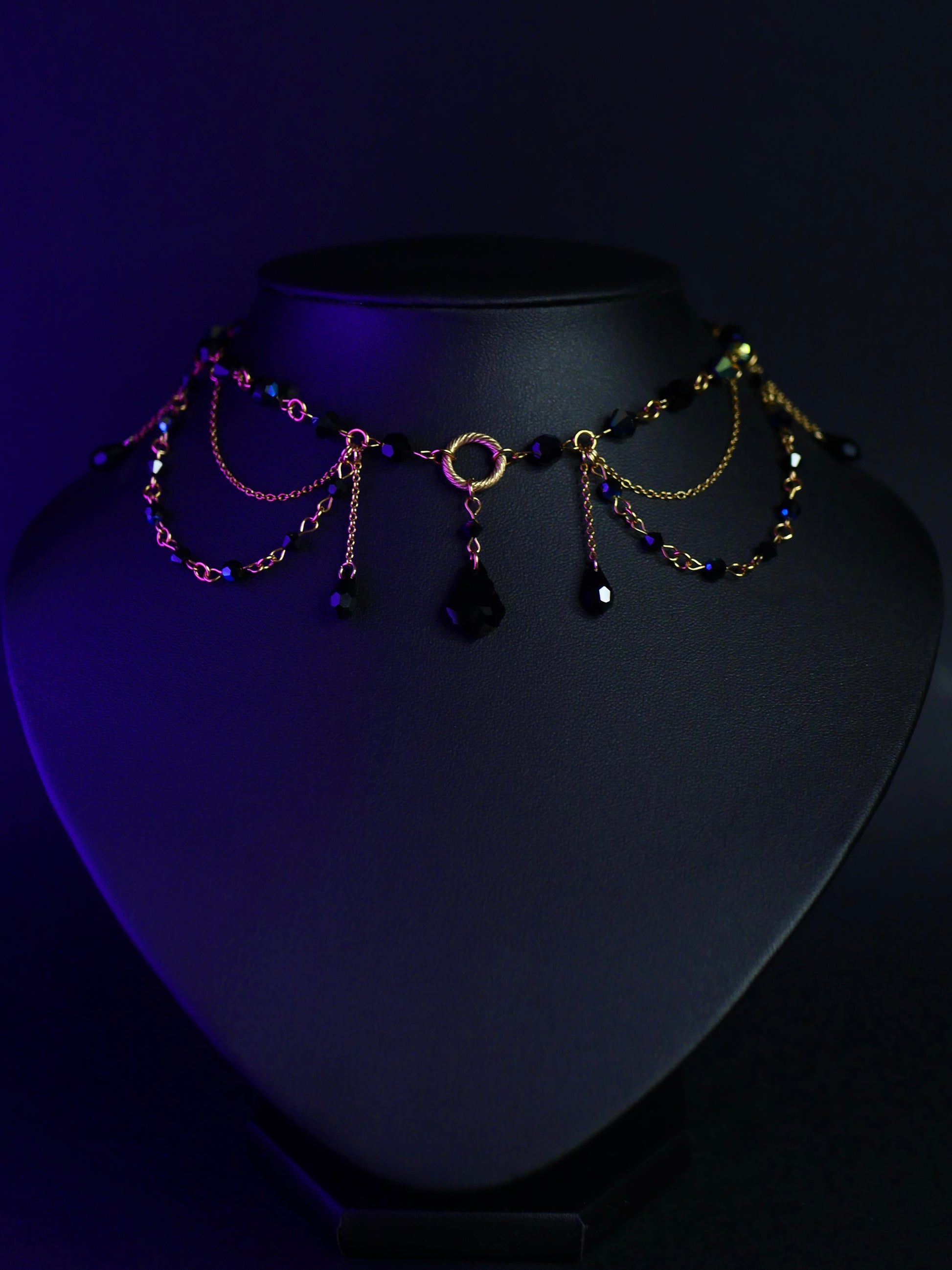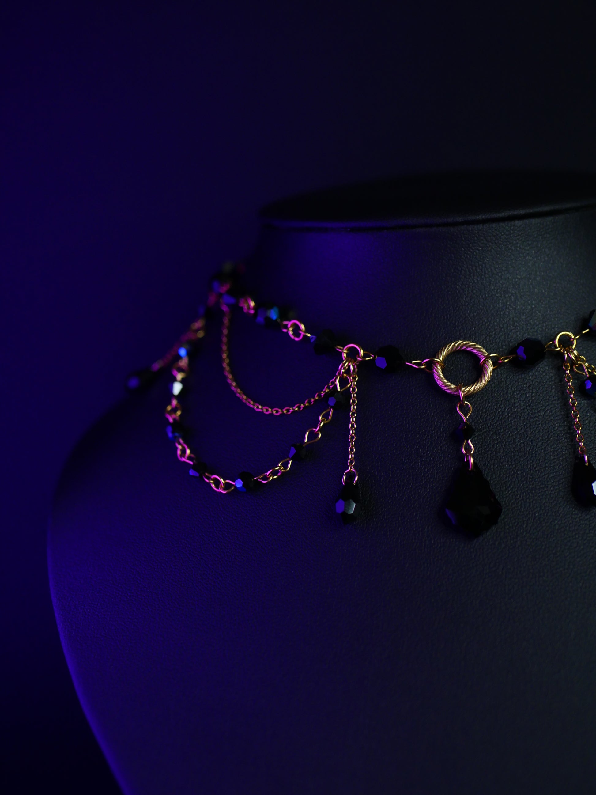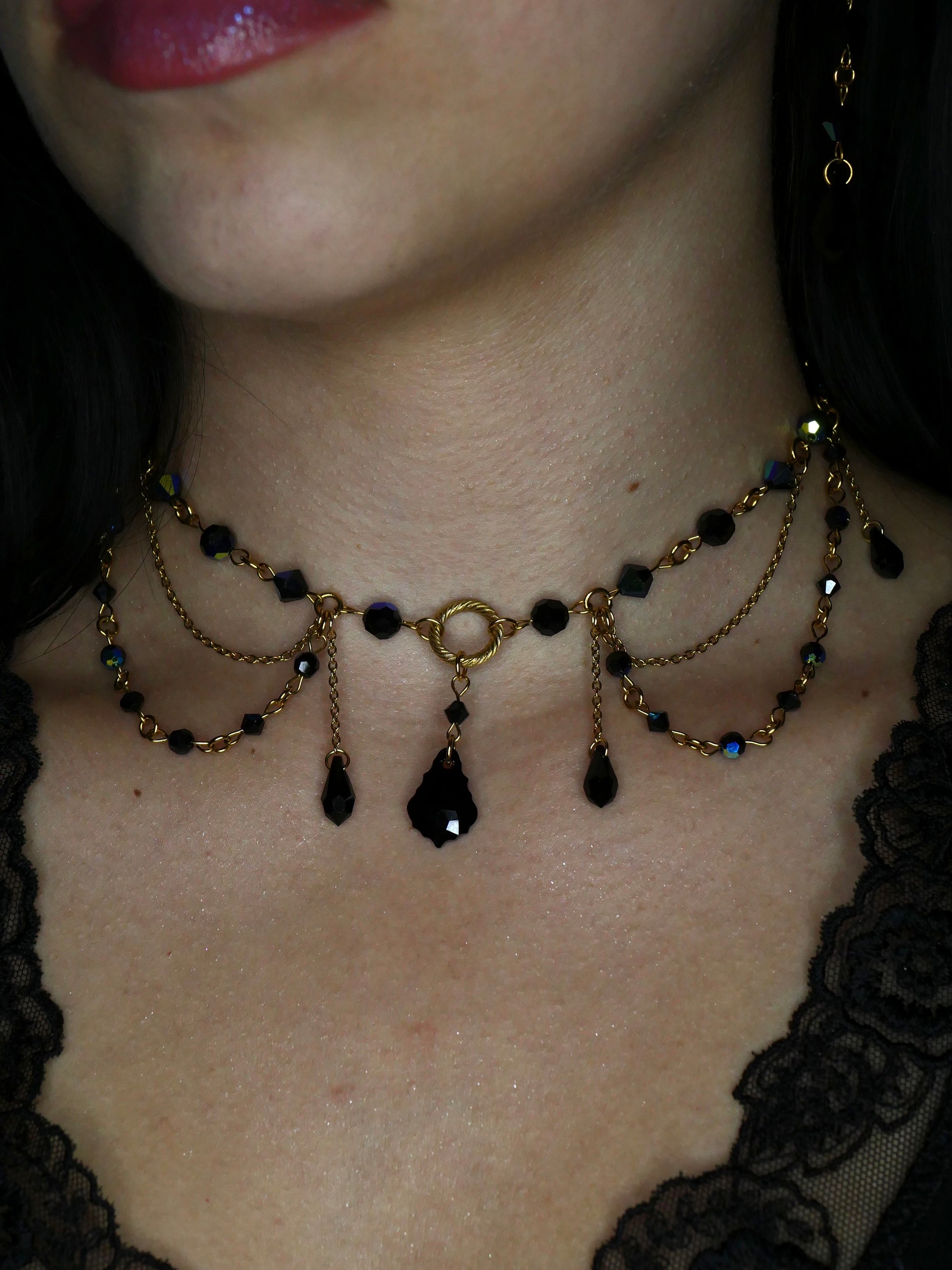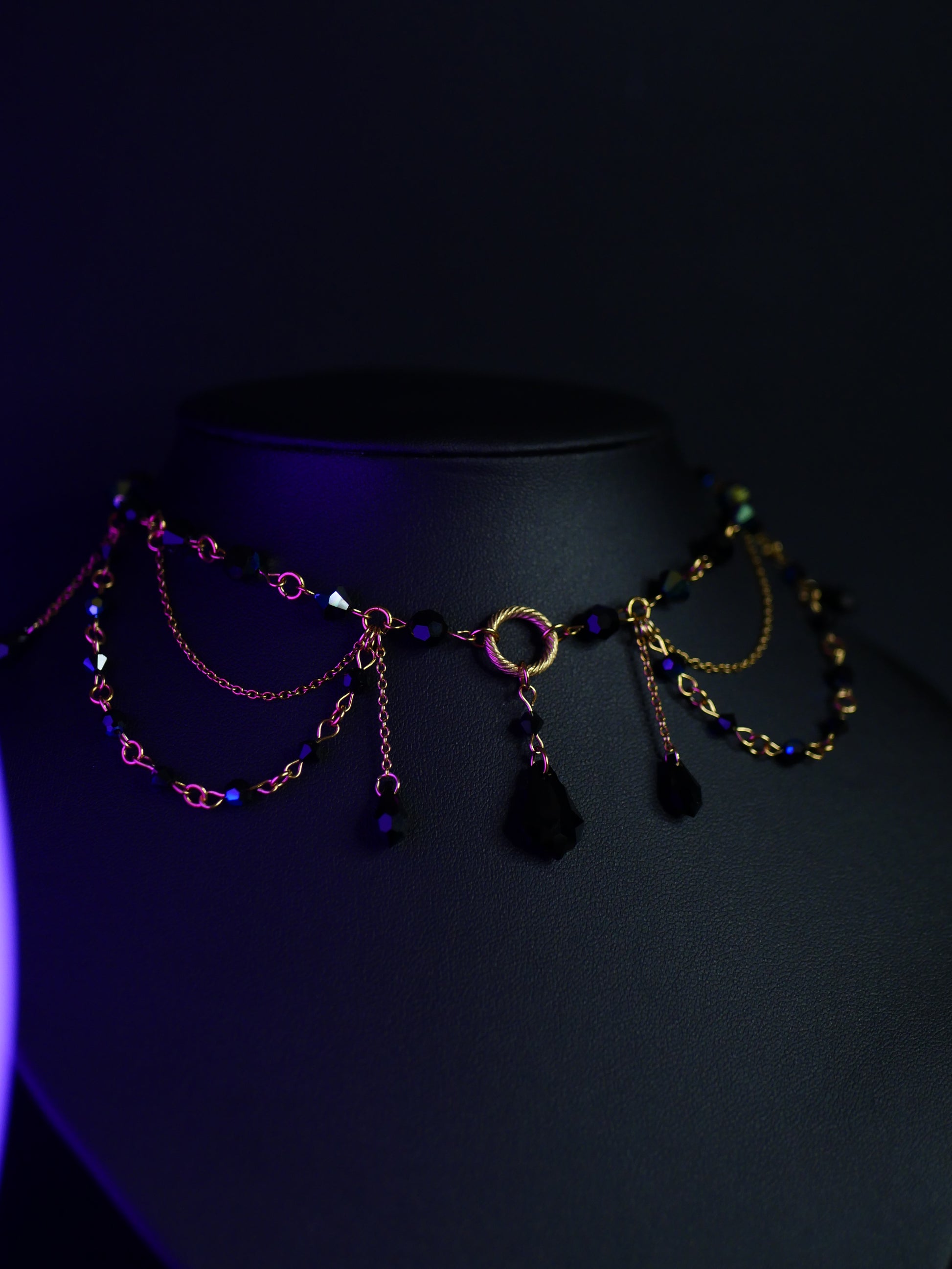 Une obscurité vibrante d’éclats dorés. Les perles noires aux reflets bleu-vert se parent d’une lueur solaire, rappelant la mer embrasée au cœur de la nuit. Entièrement façonnés en cristal.