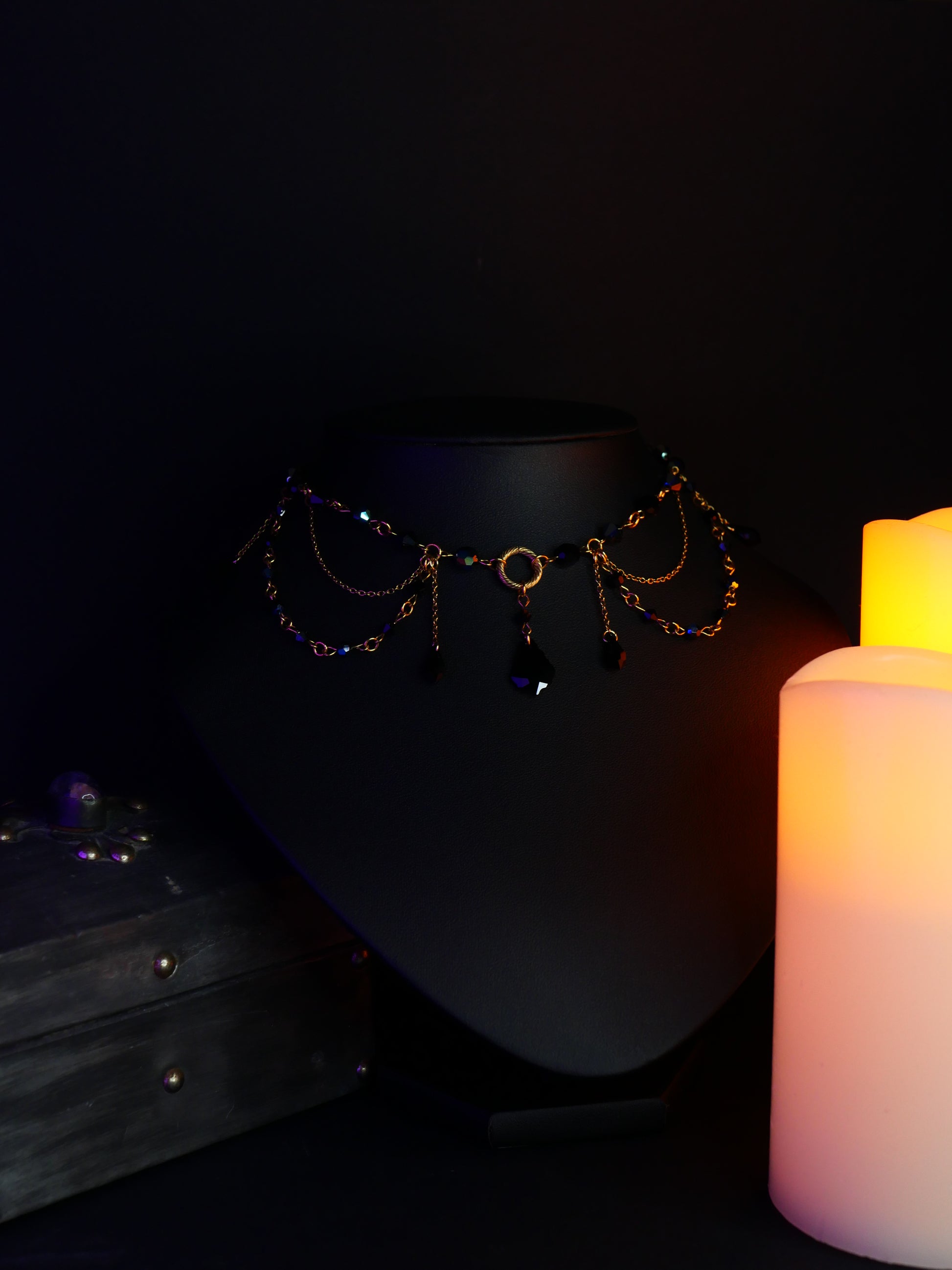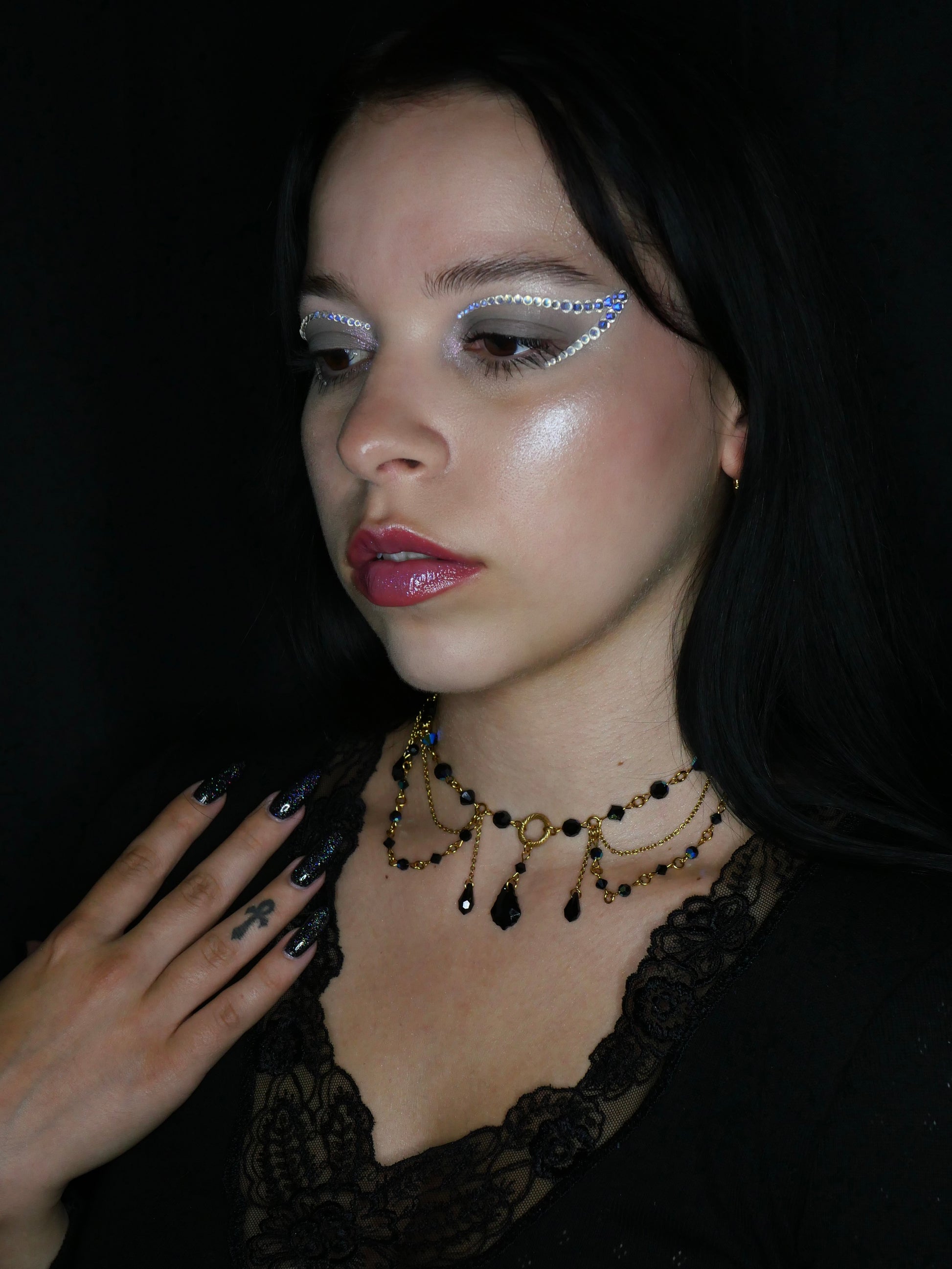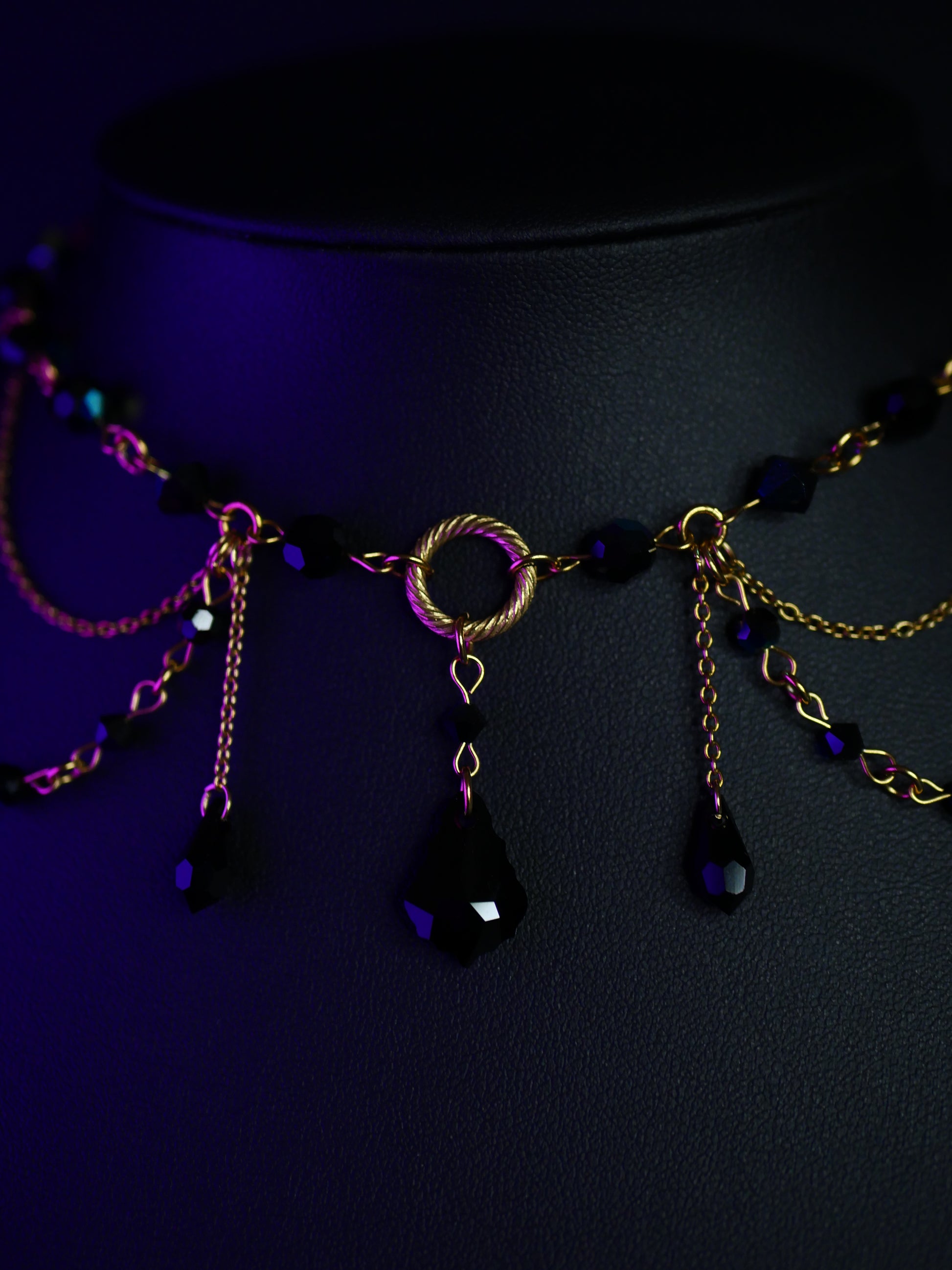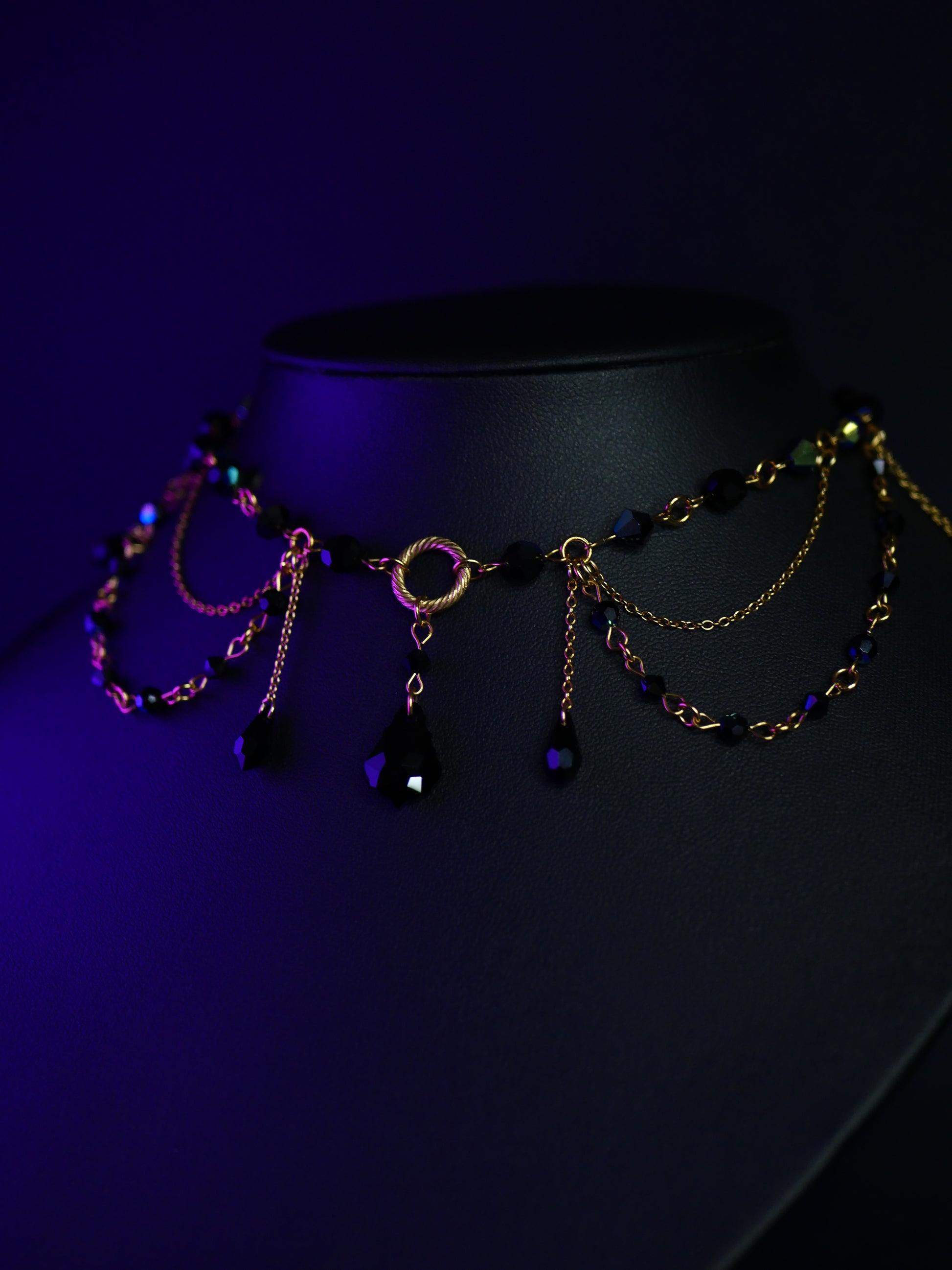 Une obscurité vibrante d’éclats dorés. Les perles noires aux reflets bleu-vert se parent d’une lueur solaire, rappelant la mer embrasée au cœur de la nuit. Entièrement façonnés en cristal.