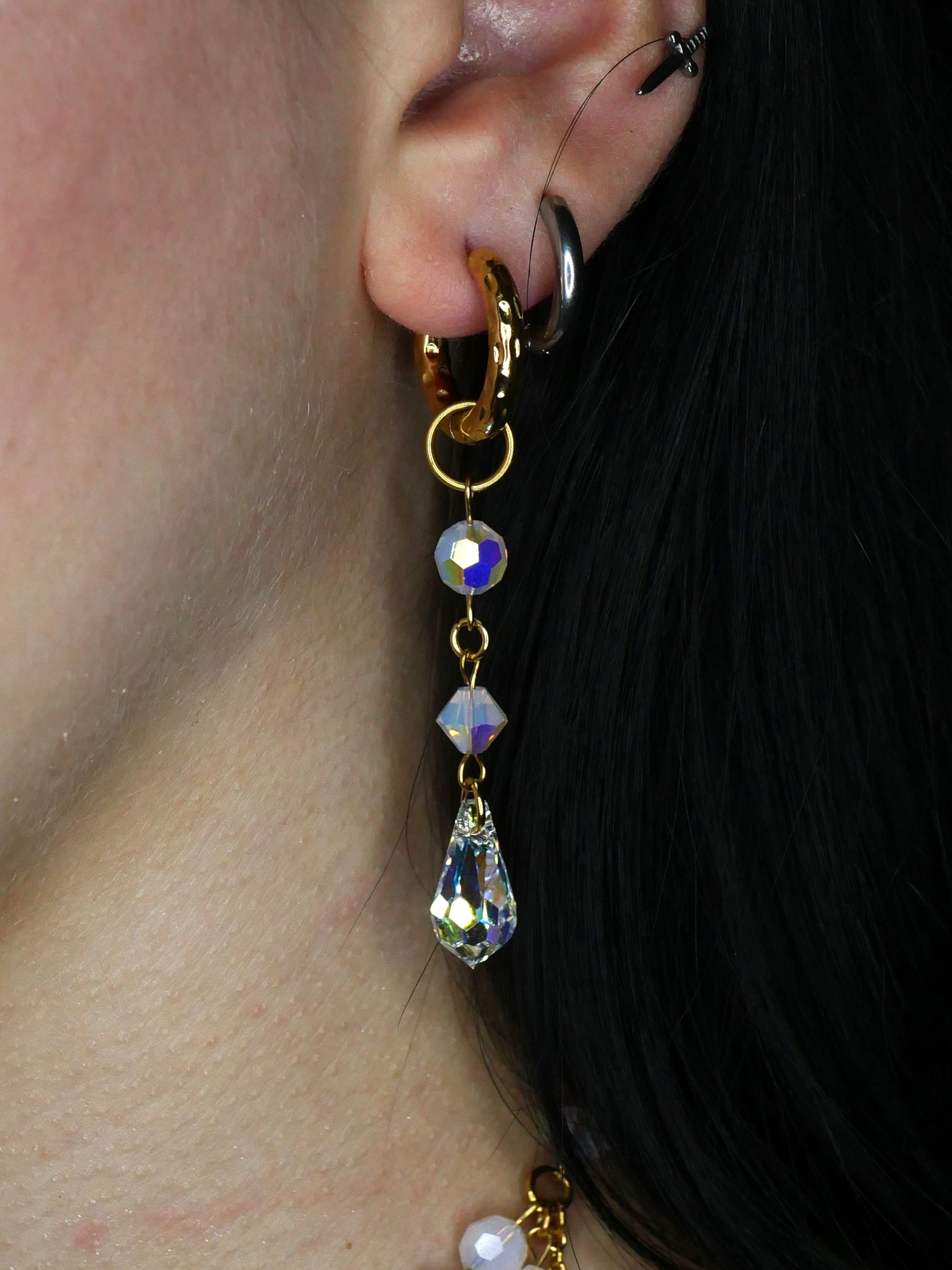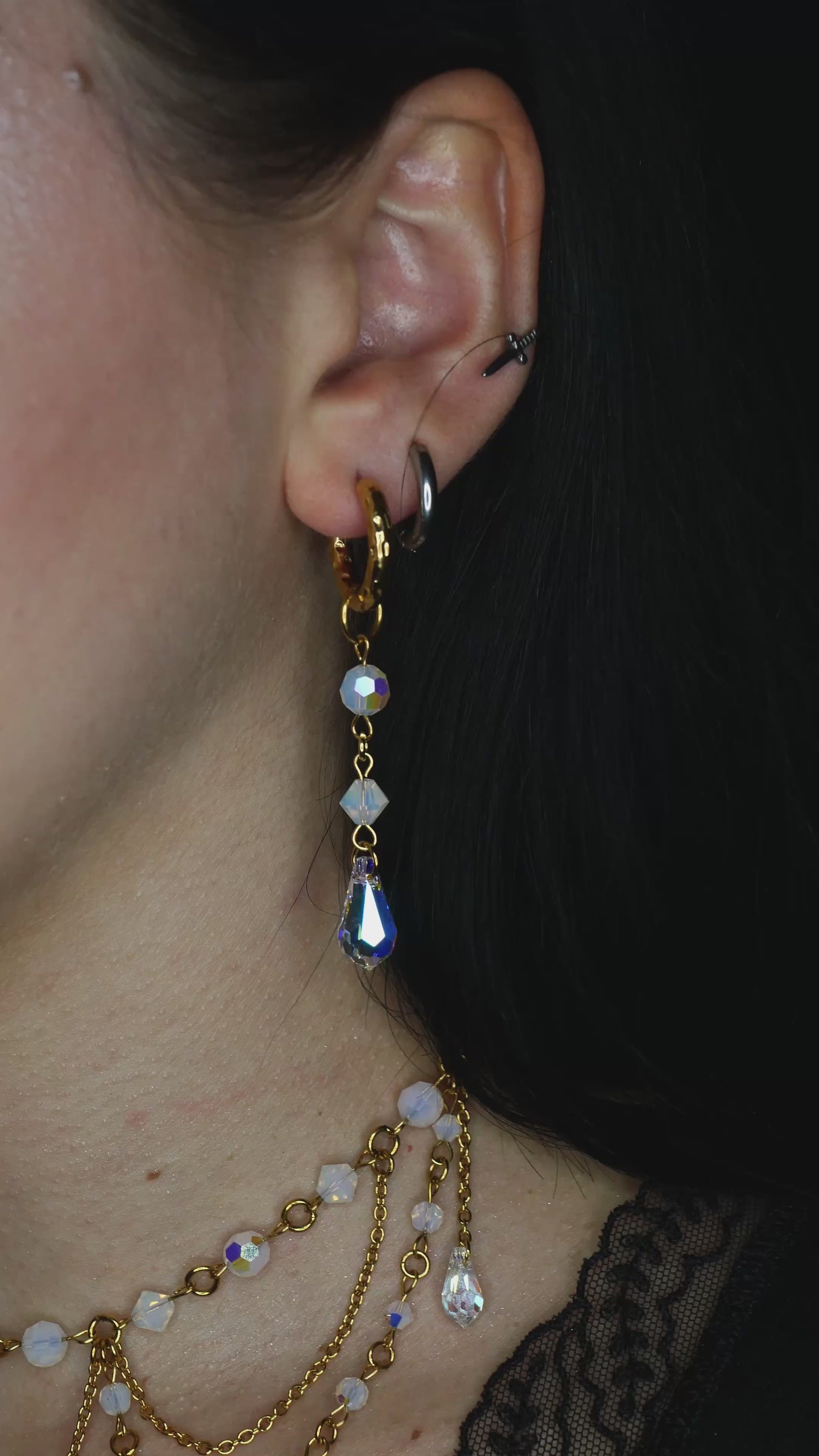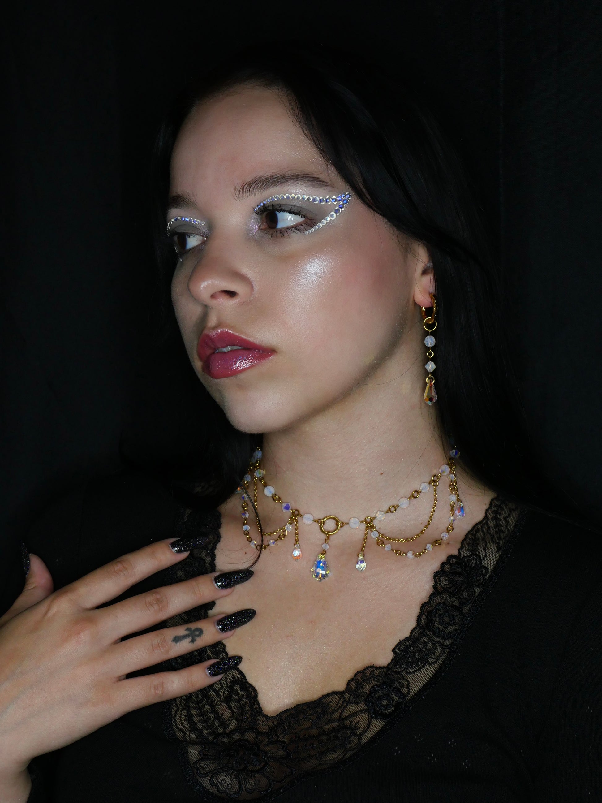 Un rêve doré capturé en bijoux. Les perles blanches aux reflets lumineux se parent d’éclats dorés, comme des fragments de lune caressés par la nuit. Entièrement façonnés en cristal.