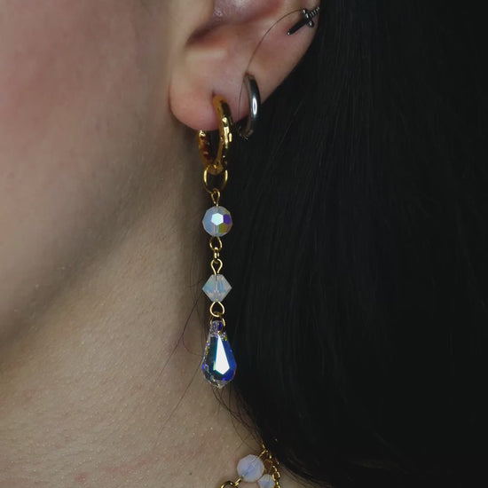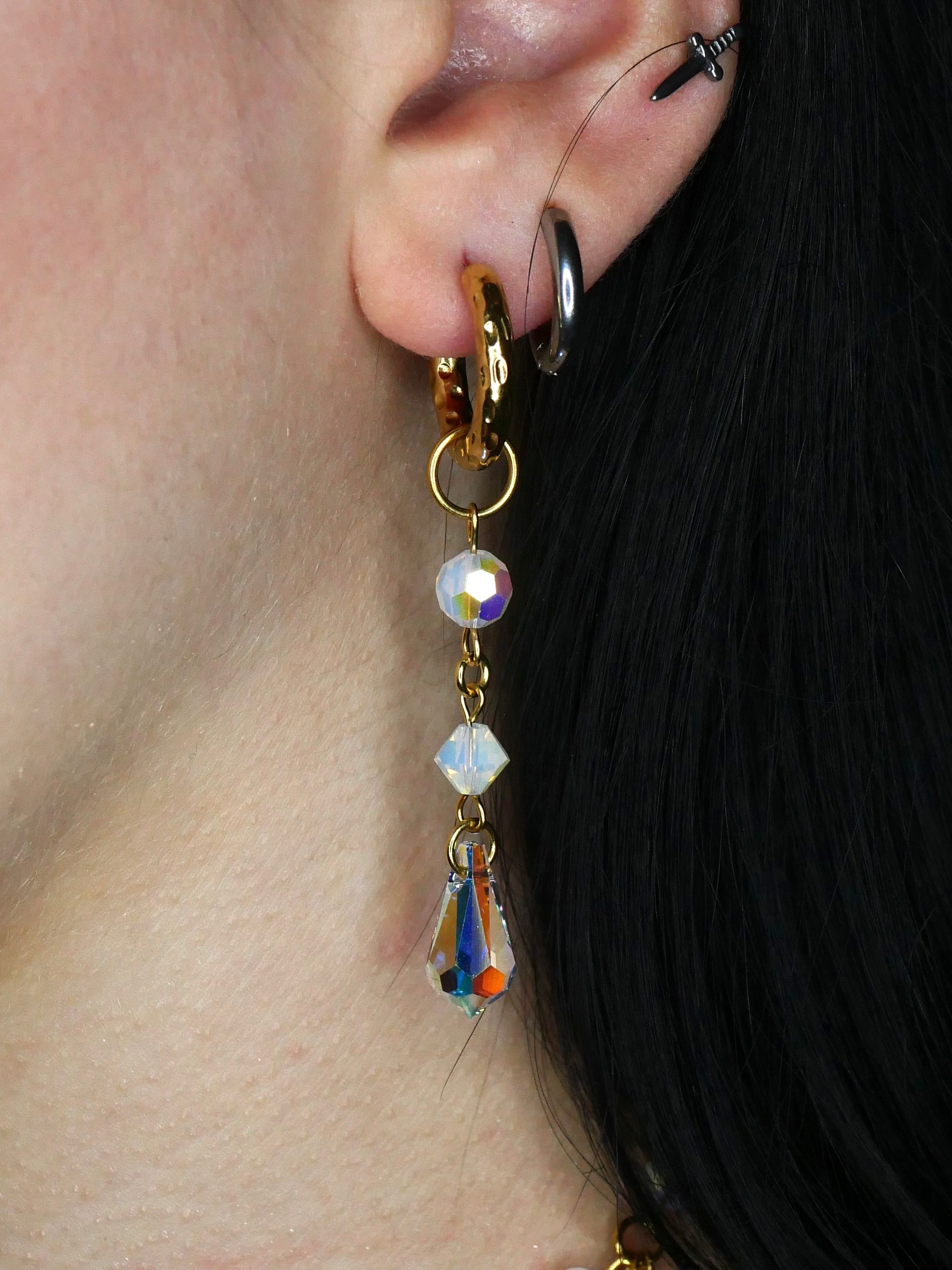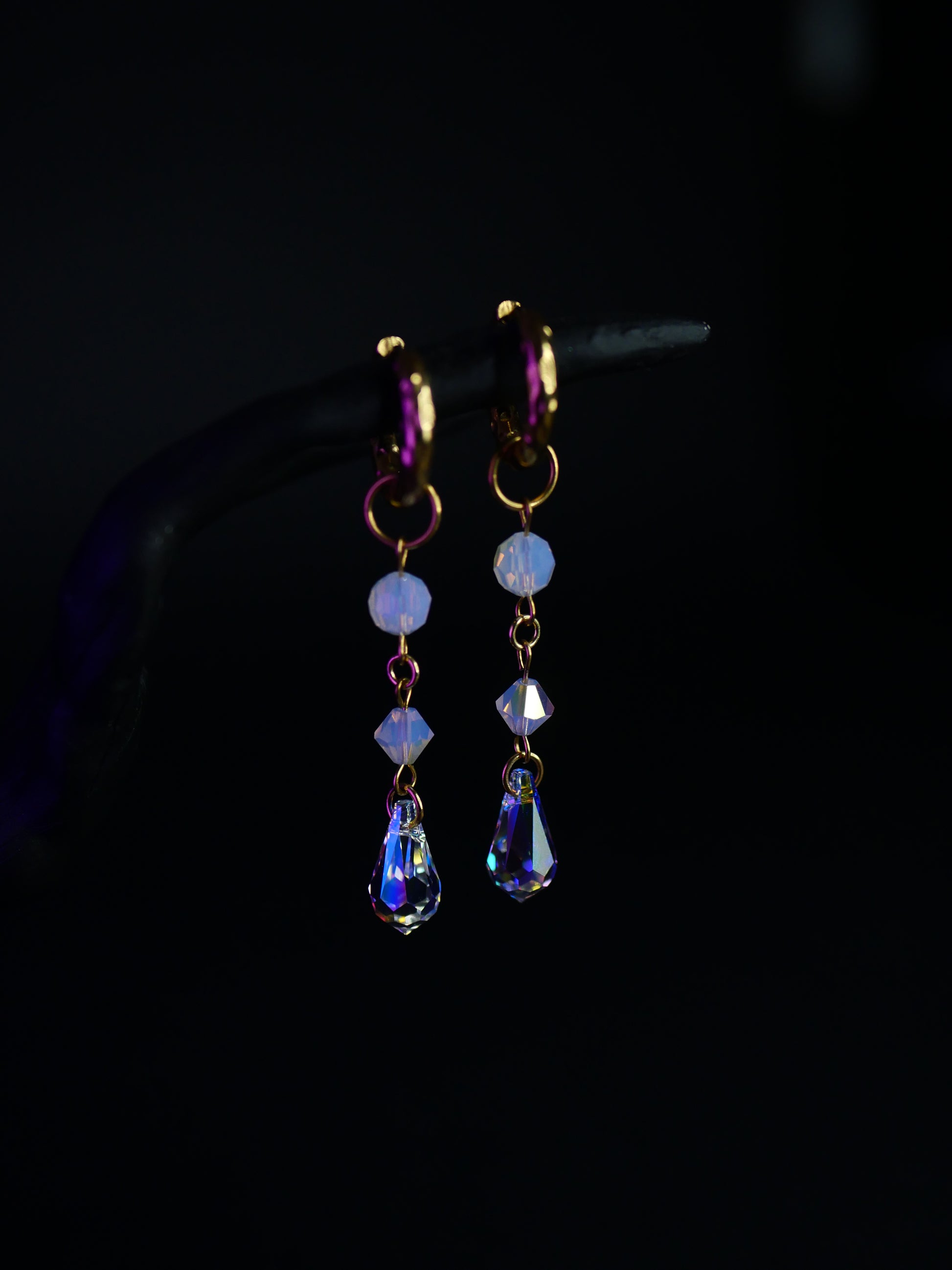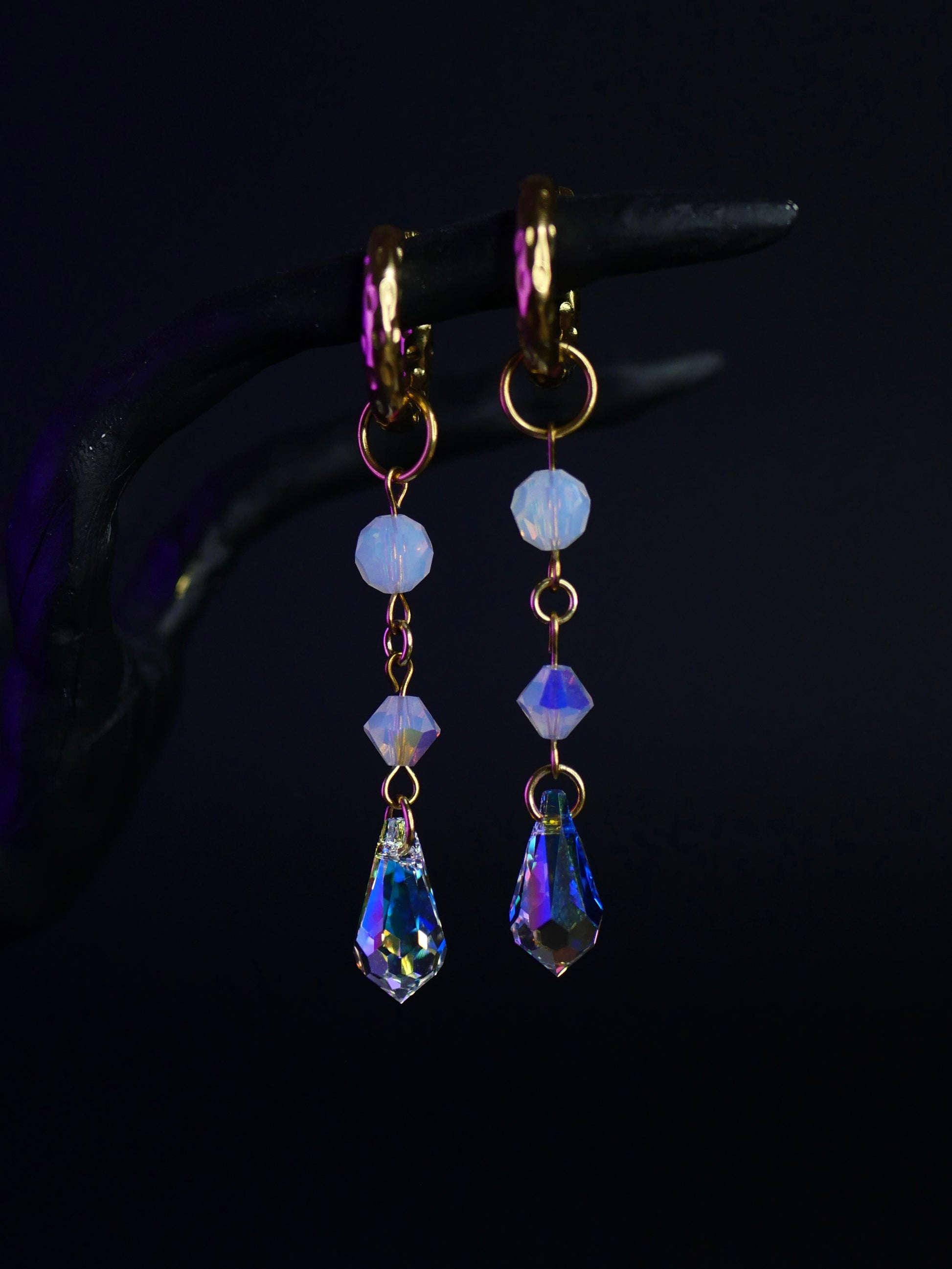 Un rêve doré capturé en bijoux. Les perles blanches aux reflets lumineux se parent d’éclats dorés, comme des fragments de lune caressés par la nuit. Entièrement façonnés en cristal.